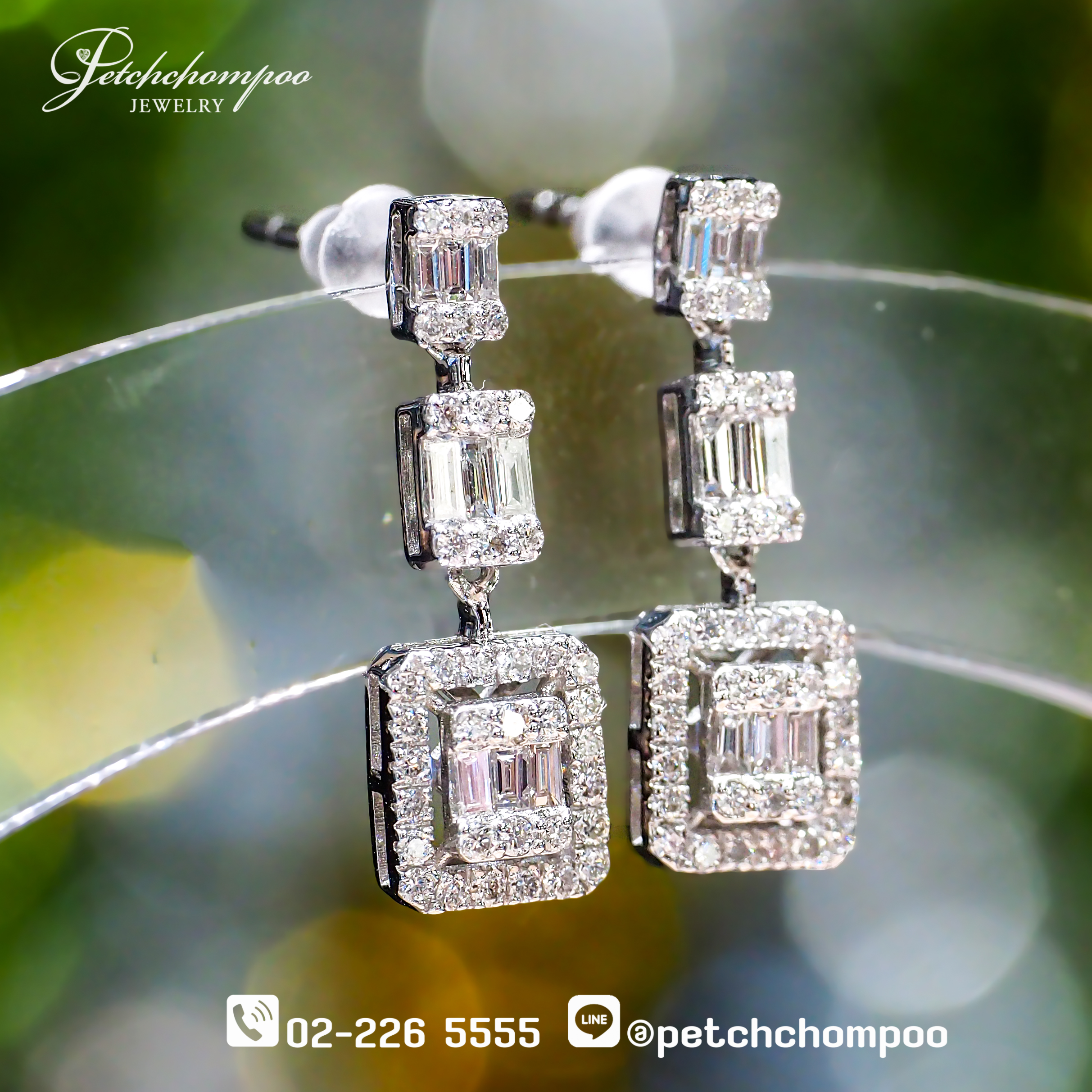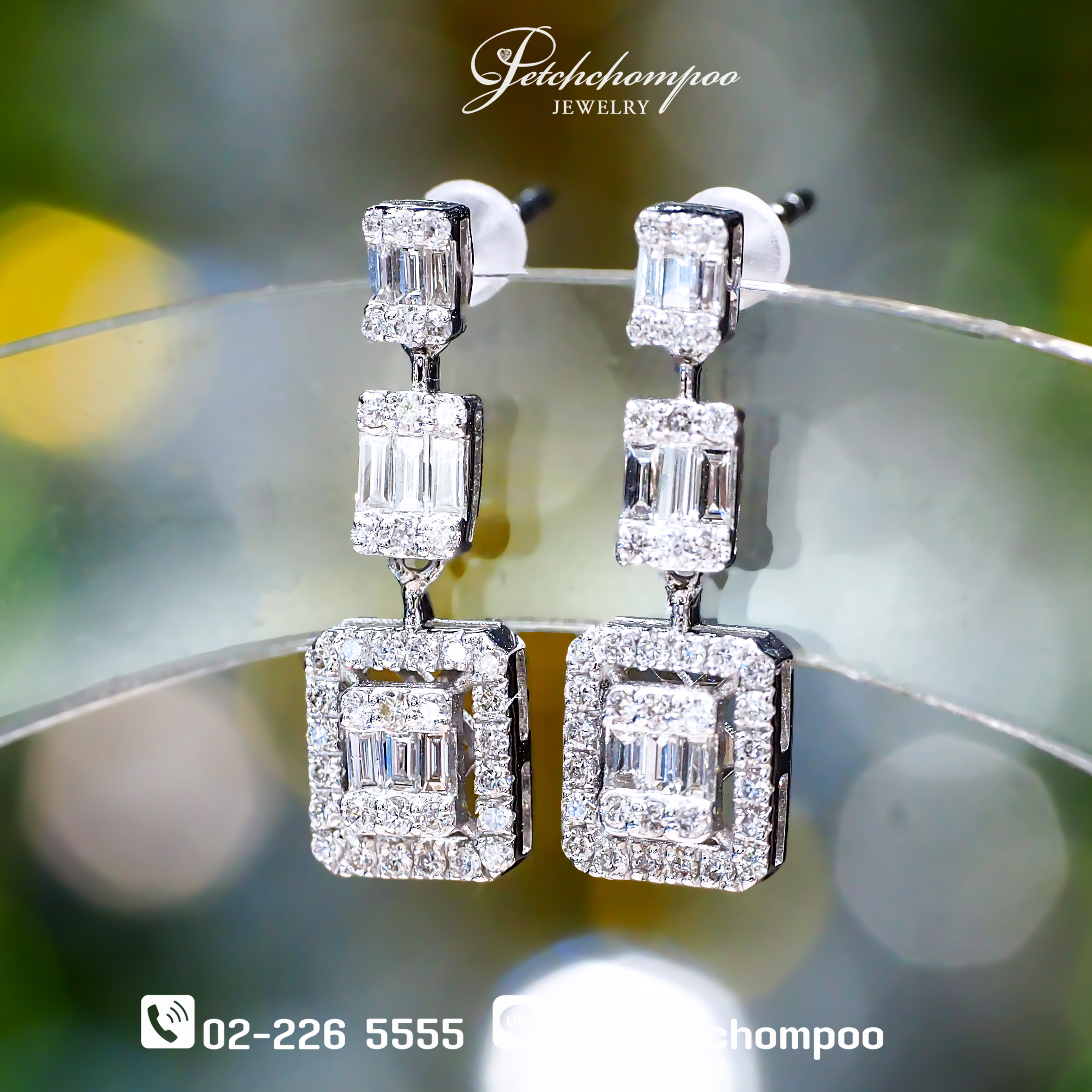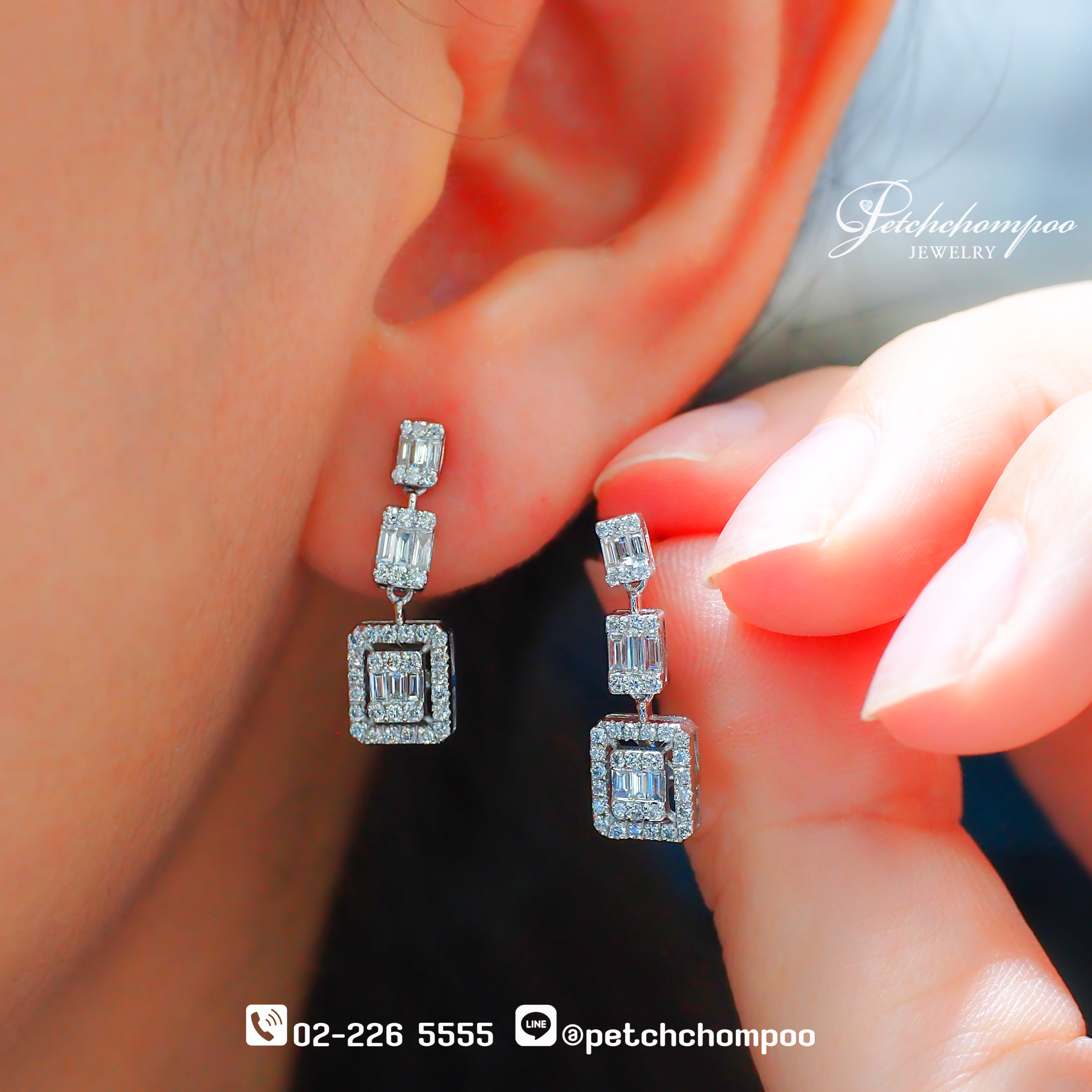 ต่างหูเพชร Geometric Radiance™ คู่นี้ออกแบบในสไตล์เรขาคณิตหรูหรา ► ตัวเรือนทองคำขาวประดับเพชรเหลี่ยมสี่เหลี่ยม (Emerald/Baguette style) เรียงตัวอย่างประณีต พร้อมเพชรกลมประกบล้อมรอบทุกชิ้น เพื่อเพิ่มมิติแห่งประกายและแสงสะท้อนที่สวยสง่า ดีไซน์ซ้อนชั้นรูปสี่เหลี่ยมผืนผ้าให้ลุคโมเดิร์นแบบไร้กาลเวลา → สวมใส่ง่าย เข้ากับทั้งงานกลางวันและงานราตรีได้อย่างลงตัว