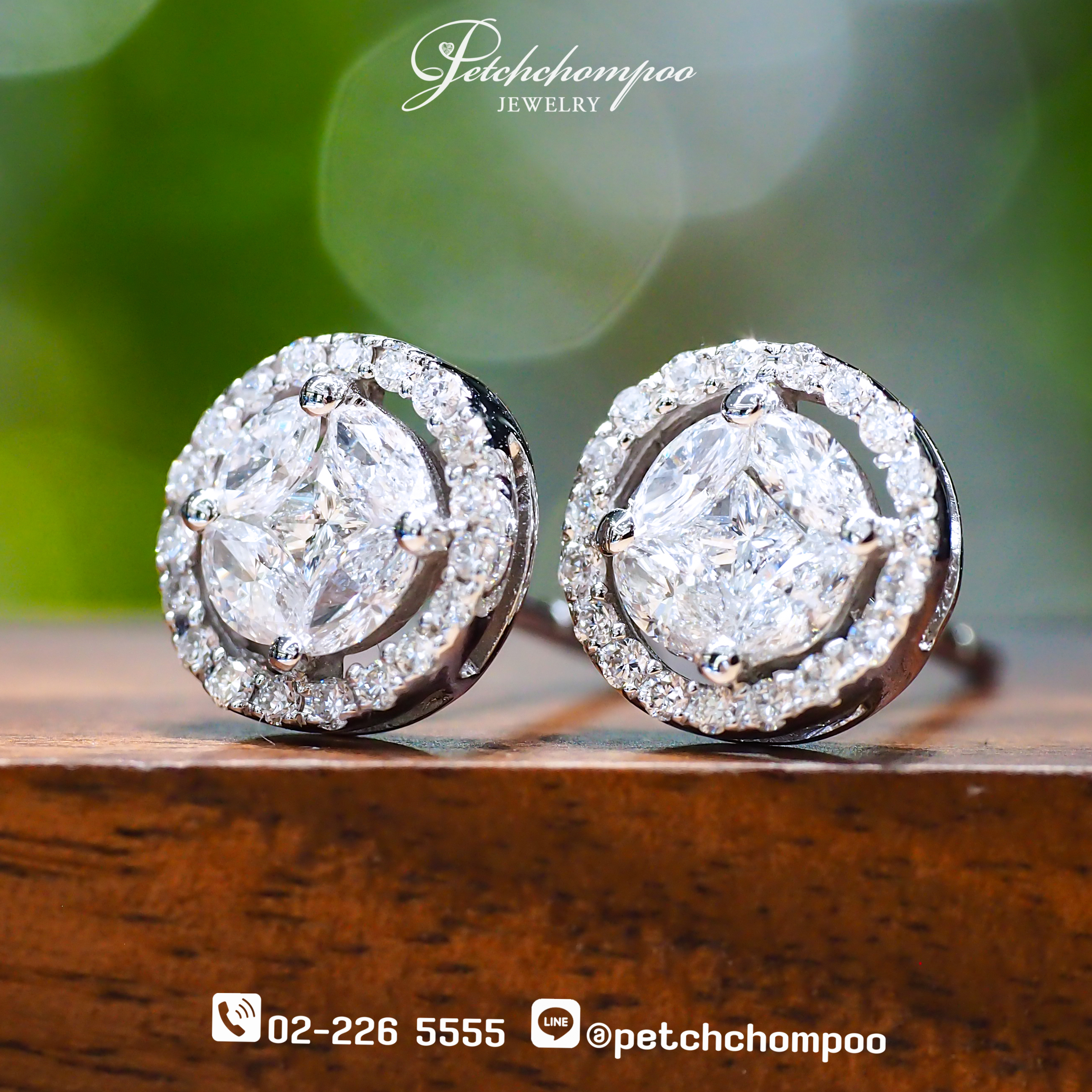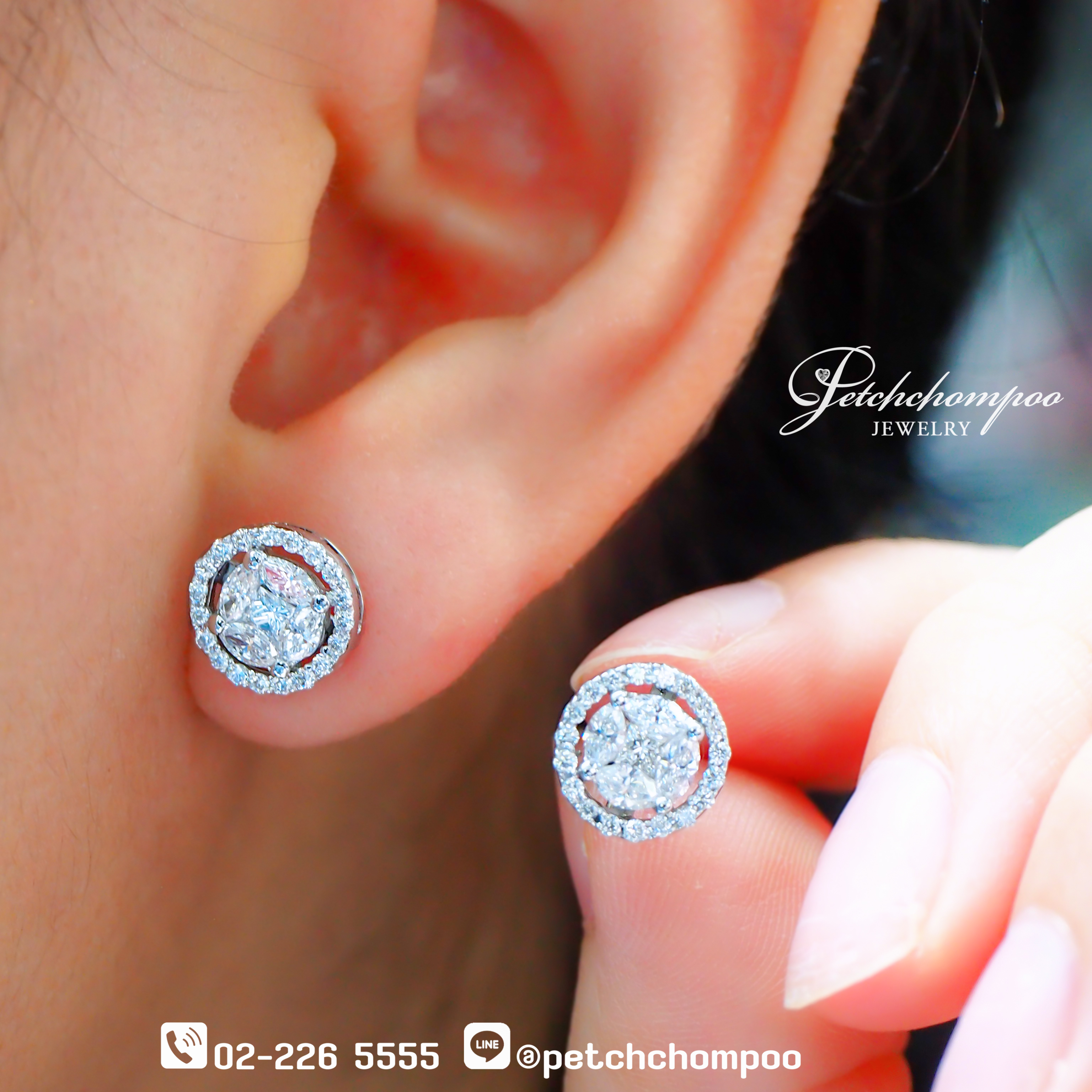 ต่างหูเพชรดีไซน์ล้ำค่า ผสาน 3 รูปทรงเพชร — กลม, เจ้าหญิง (Princess) และมาคีร์ (Marquise) — เรียงตัวคล้ายประกายดาวหมุนรอบกันอย่างลงตัว รายล้อมด้วยเพชรกลมเม็ดเล็กที่จัดเรียงอย่างประณีตให้เกิดแสงระยิบระยับรอบด้าน ตัวเรือนทองคำขาวช่วยขับให้ประกายเพชรยิ่งโดดเด่น สวมใส่แล้วให้ลุคหรูหรา สง่างาม เหมาะทั้งโอกาสพิเศษและวันสำคัญของคุณ
