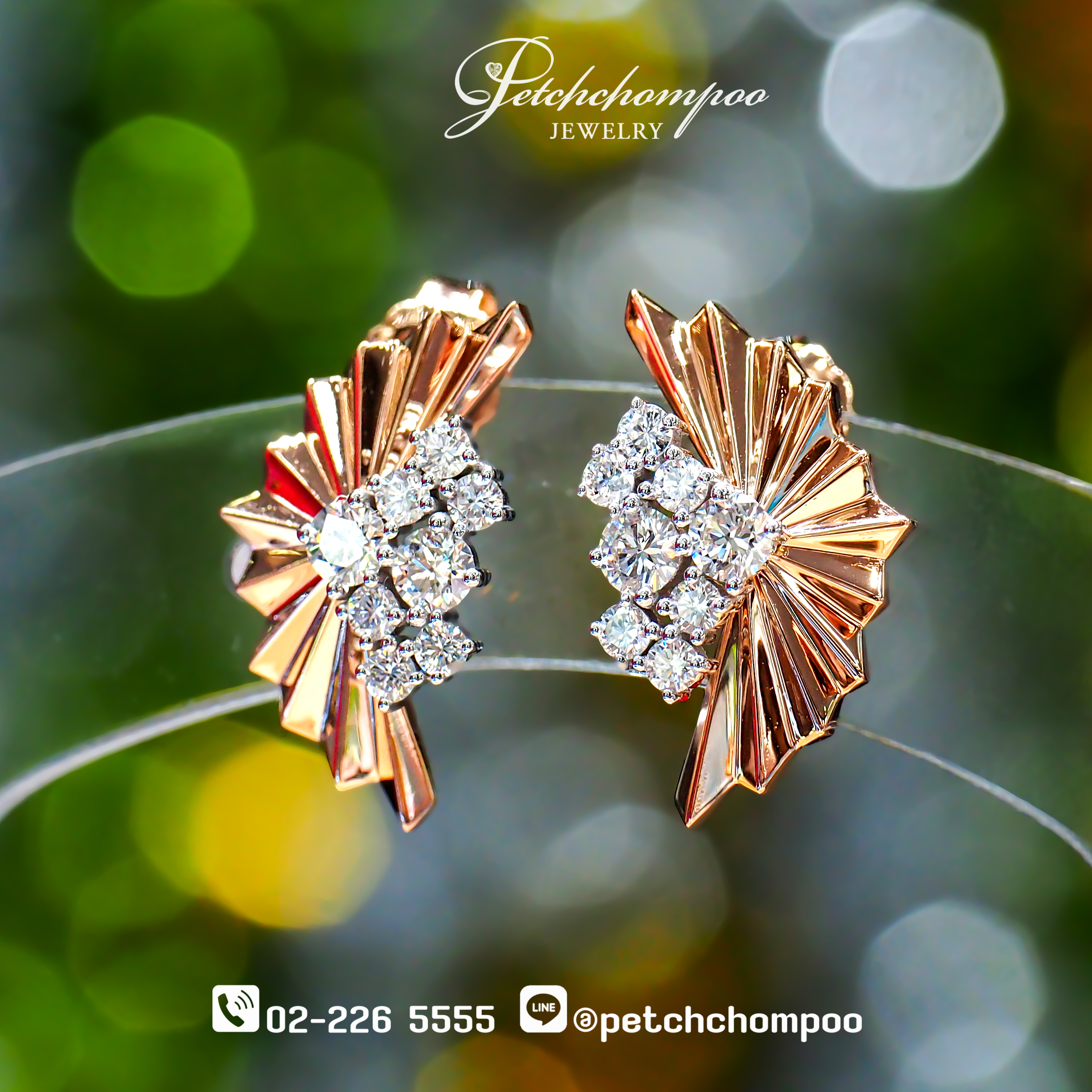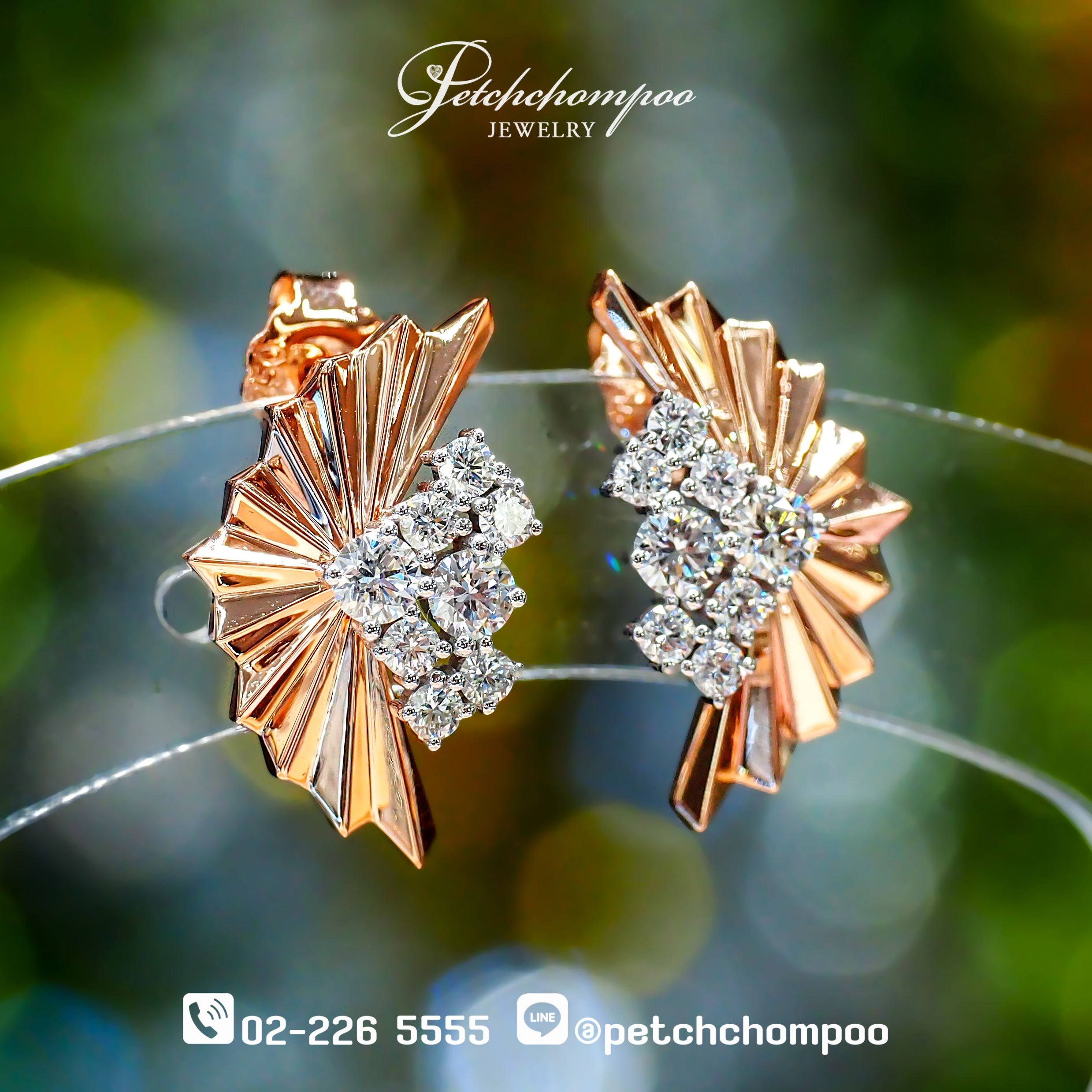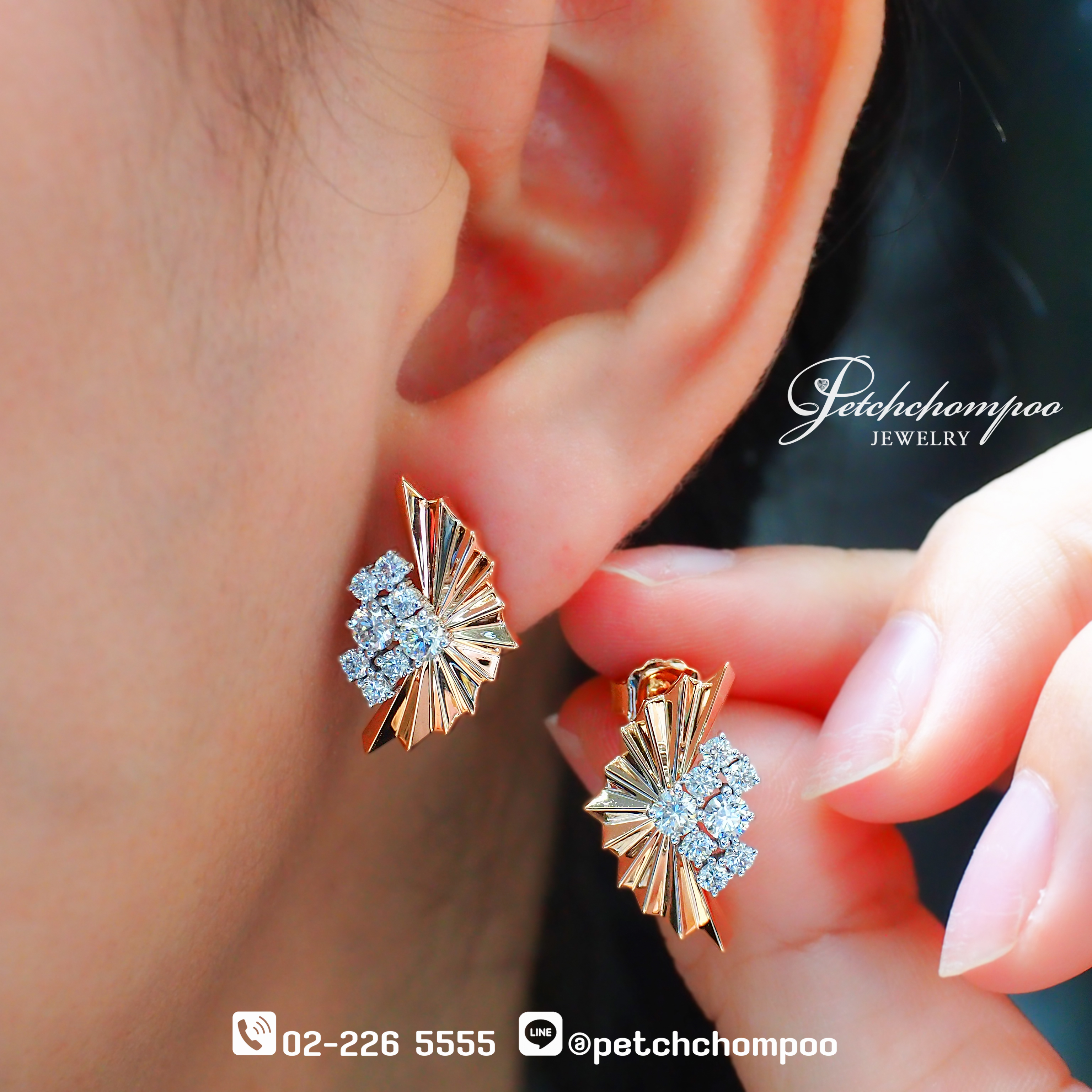 ต่างหูดีไซน์แฟนซีรูปทรง “Sunburst” อันสง่างาม ผลงานที่ผสานความเฉียบคมของงานทองกับประกายเพชรอย่างไร้ที่ติ แผงทองคาร์ฟทีละร่องให้เกิดมิติแสงสะท้อนทรงพลัง ส่วนกลางประดับเพชรกลมเรียงตัวแบบ Cluster ให้ประกายสว่างเจิดจ้า เสริมบุคลิกหรูหรา ทันสมัย และโดดเด่นทุกครั้งที่สวมใส่