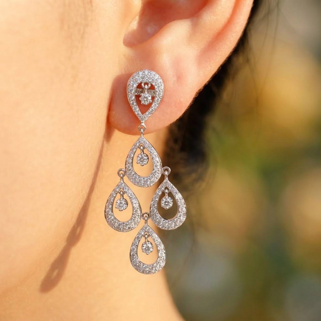 ต่างหูเพชรดีไซน์หยดน้ำ 7 ชั้นสุดวิจิตร เปล่งประกายด้วยเพชรน้ำงามกว่า 250 เม็ดเรียงตัวอย่างประณีตในรูปแบบที่พลิ้วไหวดั่งสายน้ำ ช่วยเพิ่มมิติให้ใบหน้าและขับความหรูหราให้โดดเด่นทุกมุมมอง ตัวเรือนทองคำขาวงดงามดุจงาน Haute Joaillerie ด้วยโครงสร้างที่แข็งแรงแต่ยังคงความอ่อนช้อย เสริมบุคลิกให้สง่างาม เหมาะอย่างยิ่งสำหรับงานสำคัญ งานแต่งงาน งานกาล่า ไปจนถึงการแต่งตัวลุคผู้ดีอย่างเหนือระดับ