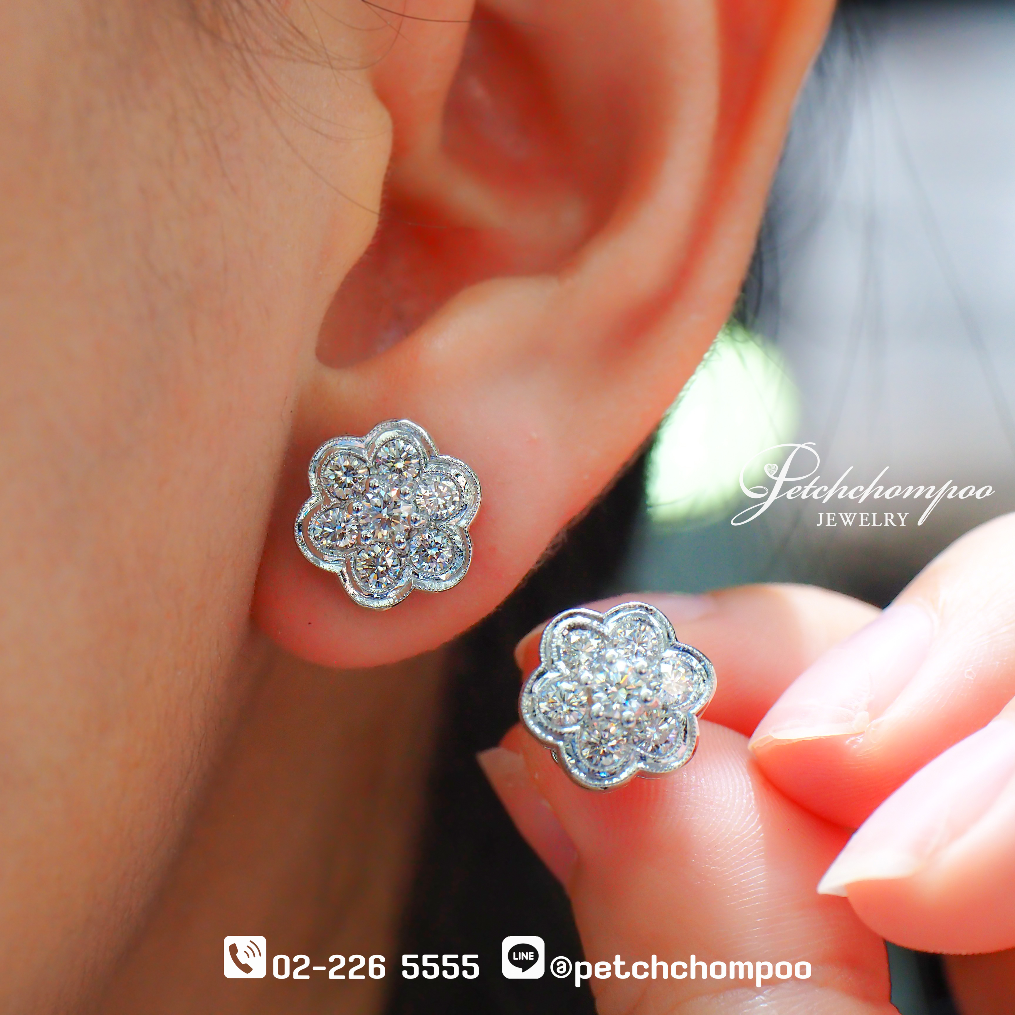 ต่างหูเพชรทรงดอกไม้ที่สะท้อนเสน่ห์ความอ่อนหวานแบบเหนือกาลเวลา ประดับเพชรเม็ดกลาง 0.26 กะรัต × 2 เม็ด ล้อมรอบด้วยเพชรคัดพิเศษอีก 12 เม็ด รวมทั้งคู่ 0.96 กะรัต เกิดเป็นประกายทรงพลังแบบ Multi-Reflection Flower Setting เพิ่มความเปล่งประกายให้ทุกองศา ตัวเรือนทองน้ำหนักดี 7.34 กรัม ทำให้สวมใส่กระชับหูและดูหรูเด่นเป็นพิเศษ เหมาะทั้งลุคทางการและลุคหรูหราในงานสำคัญ
