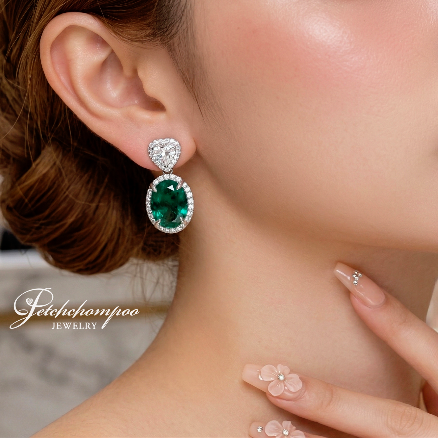 ต่างหูมรกตดีไซน์ Drop Earrings ที่ถ่ายทอดความหรูหราอย่างสมบูรณ์แบบ มรกตแซมเบียทรง Oval สีเขียวลึก เปล่งประกายอย่างมีมิติ โอบล้อมด้วยเพชรน้ำงามที่เรียงตัวอย่างประณีต เพิ่มประกายระยิบระยับในทุกการเคลื่อนไหว ส่วนบนตกแต่งด้วยเพชรทรงหัวใจ สื่อถึงความอ่อนหวาน ผสานกับความทรงพลังของอัญมณีระดับ High Jewelry