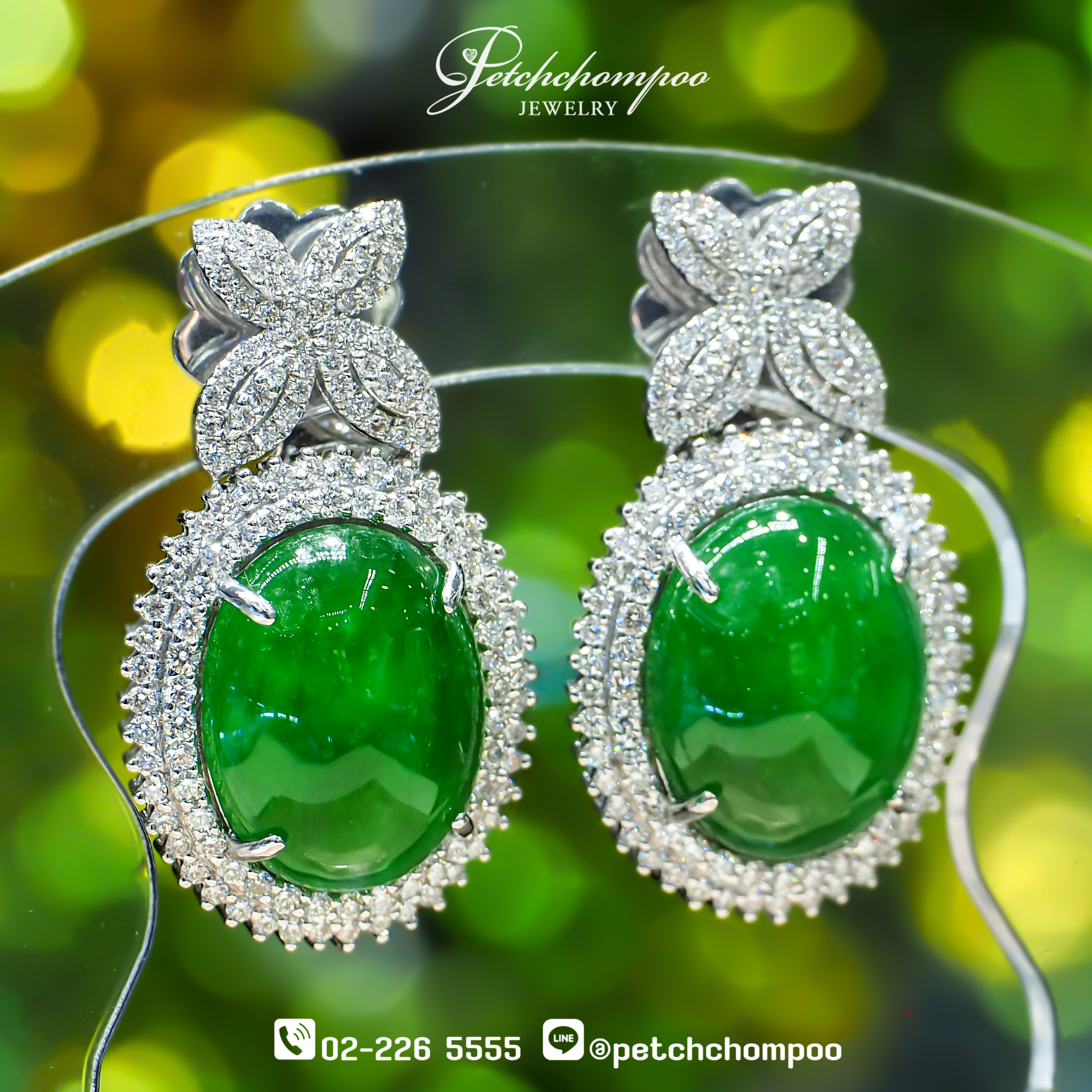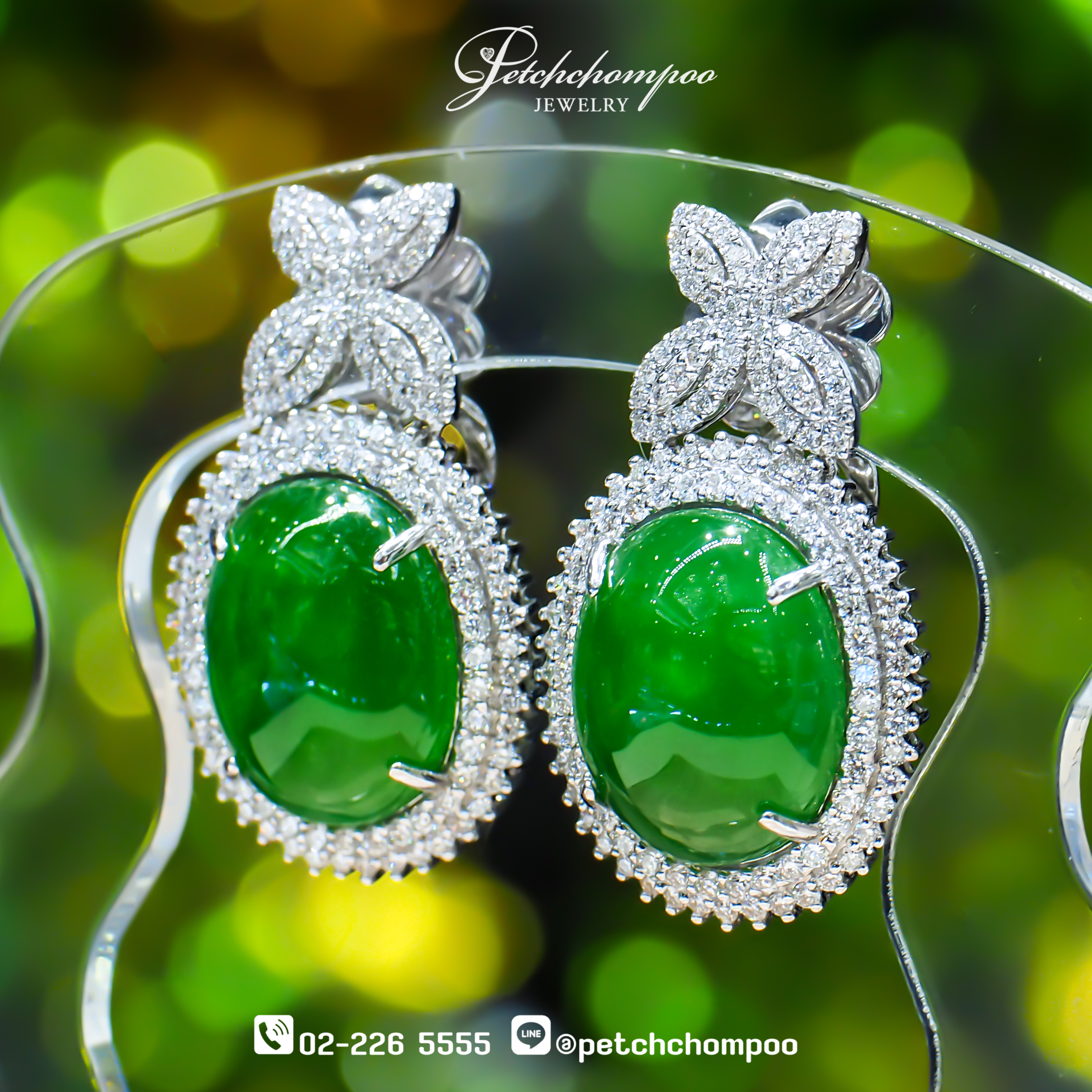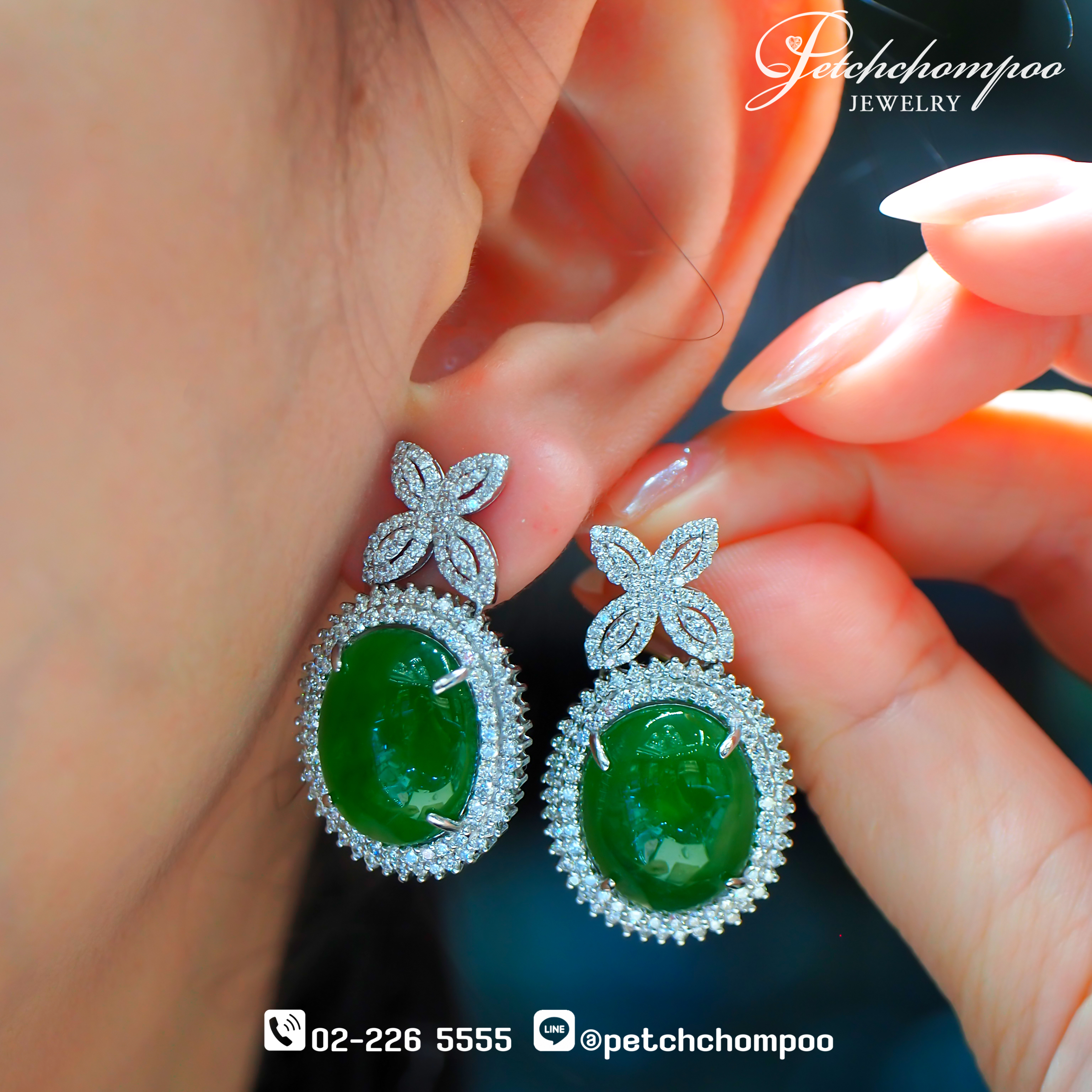 ต่างหูหยกพม่า Emerald Whisper™ 27.61 กะรัต ล้อมเพชร (เซอร์ AGL)