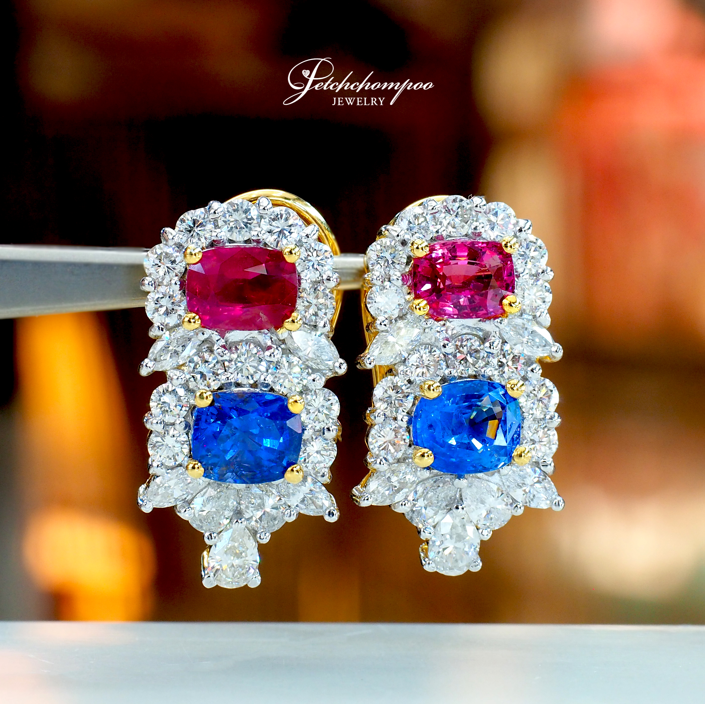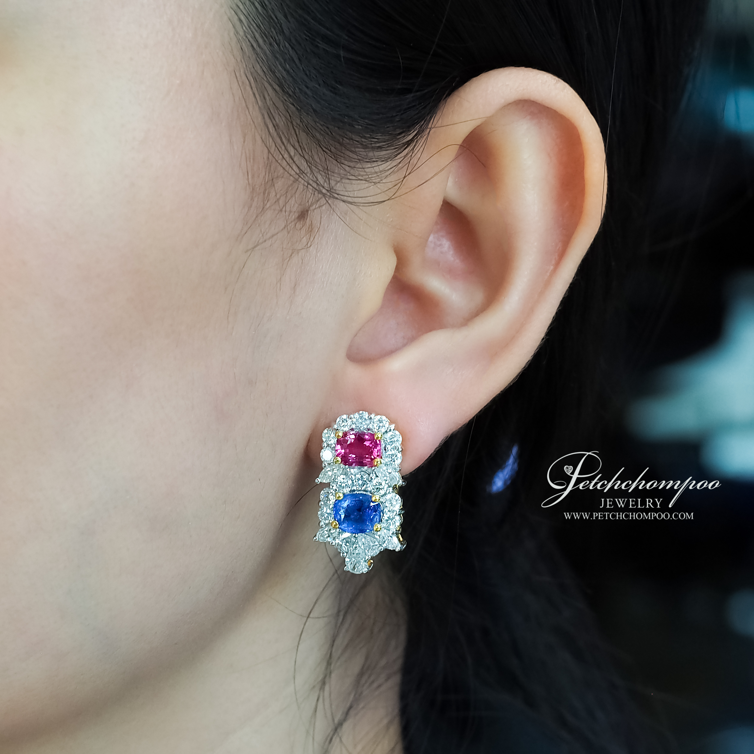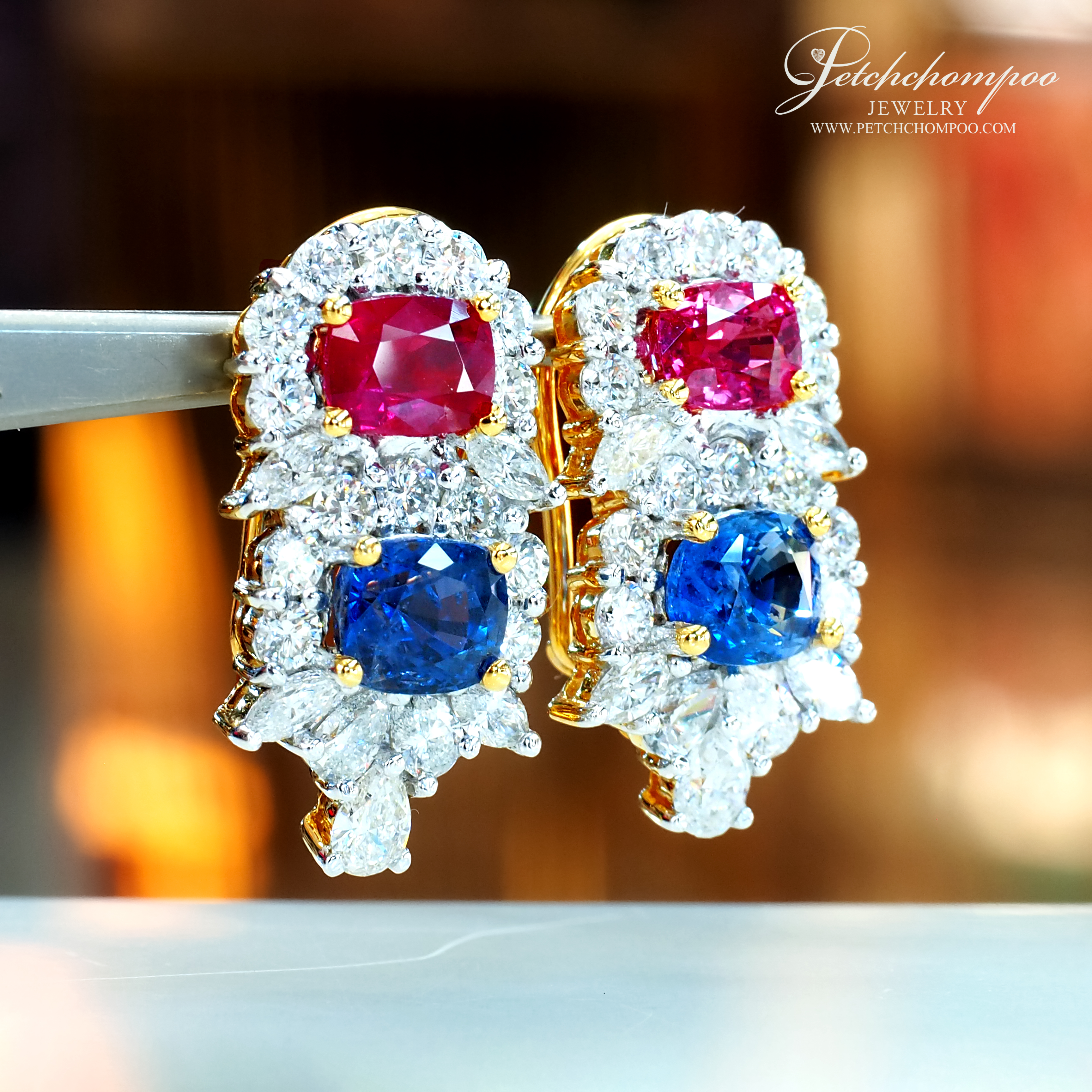 ต่างหู Royal Harmony Duo™ ผลงานศิลป์อัญมณีที่ผสานพลังของ ทับทิมสีแดงสด และไพลินสีน้ำเงินสดไม่เผา ขนาดรวม 6.00 กะรัต (4 เม็ด) งามสง่าและทรงพลัง โอบล้อมด้วยเพชรน้ำงามหลากทรง ทั้งเพชรกลม 1.96 กะรัต (28 เม็ด), เพชรหยดน้ำ 1.20 กะรัต (6 เม็ด) และเพชรมาร์คีส์ 1.20 กะรัต (8 เม็ด) รวมเป็นประกายเจิดจรัสทุกมุมมอง ตัวเรือนทองคำ 18K น้ำหนัก 10.12 กรัม มาพร้อมใบรับรอง AIG การันตีคุณภาพเหนือระดับ