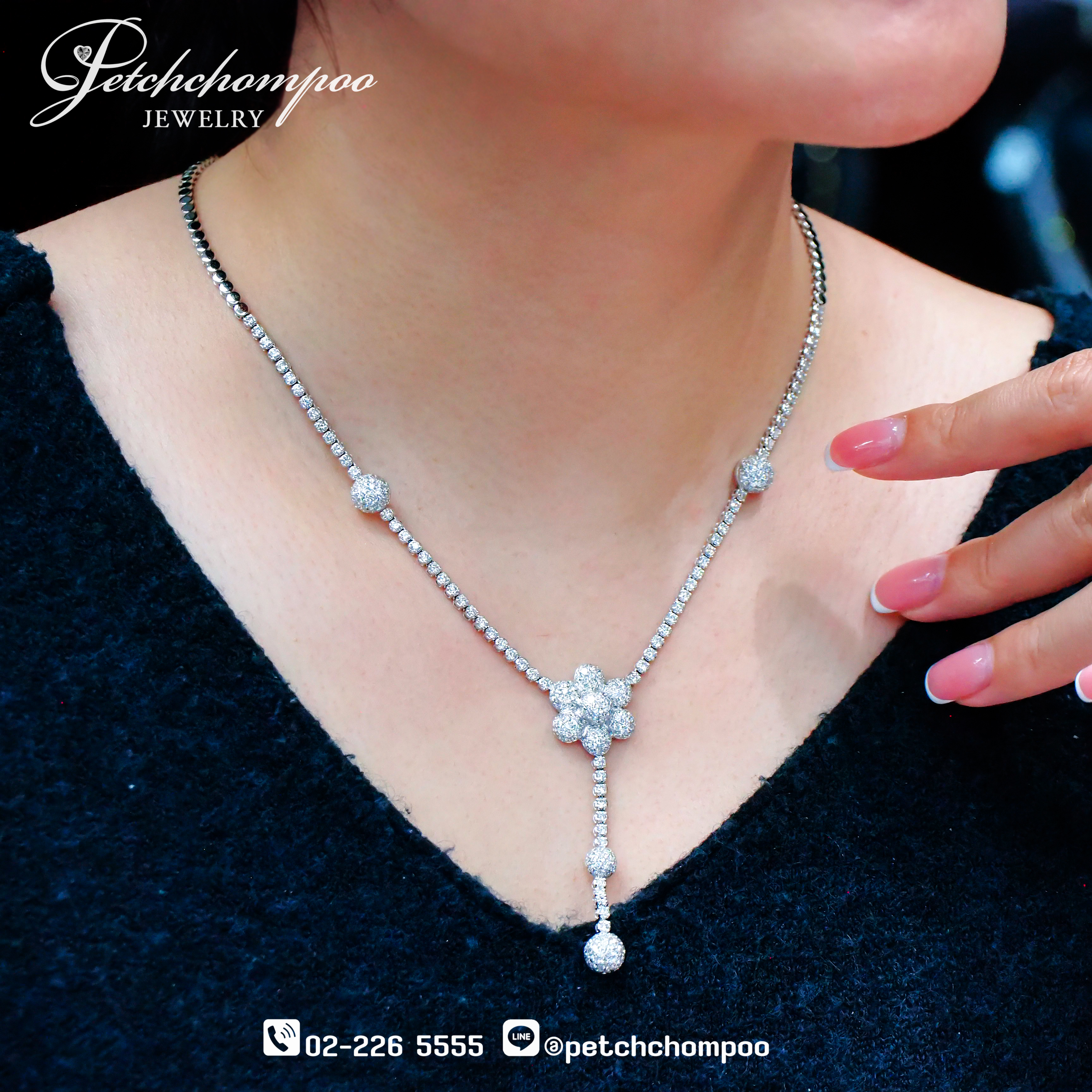 โดดเด่นด้วยจุดศูนย์กลางที่ออกแบบเป็น ลวดลายดอกไม้ฝังเพชรละเอียด เพิ่มลูกเล่นด้วย เพชรทรงกลมประดับระย้าตุ้งติ้งทำให้สร้อยคอเส้นนี้มีความพลิ้วไหว หรูหรา และน่าหลงใหล