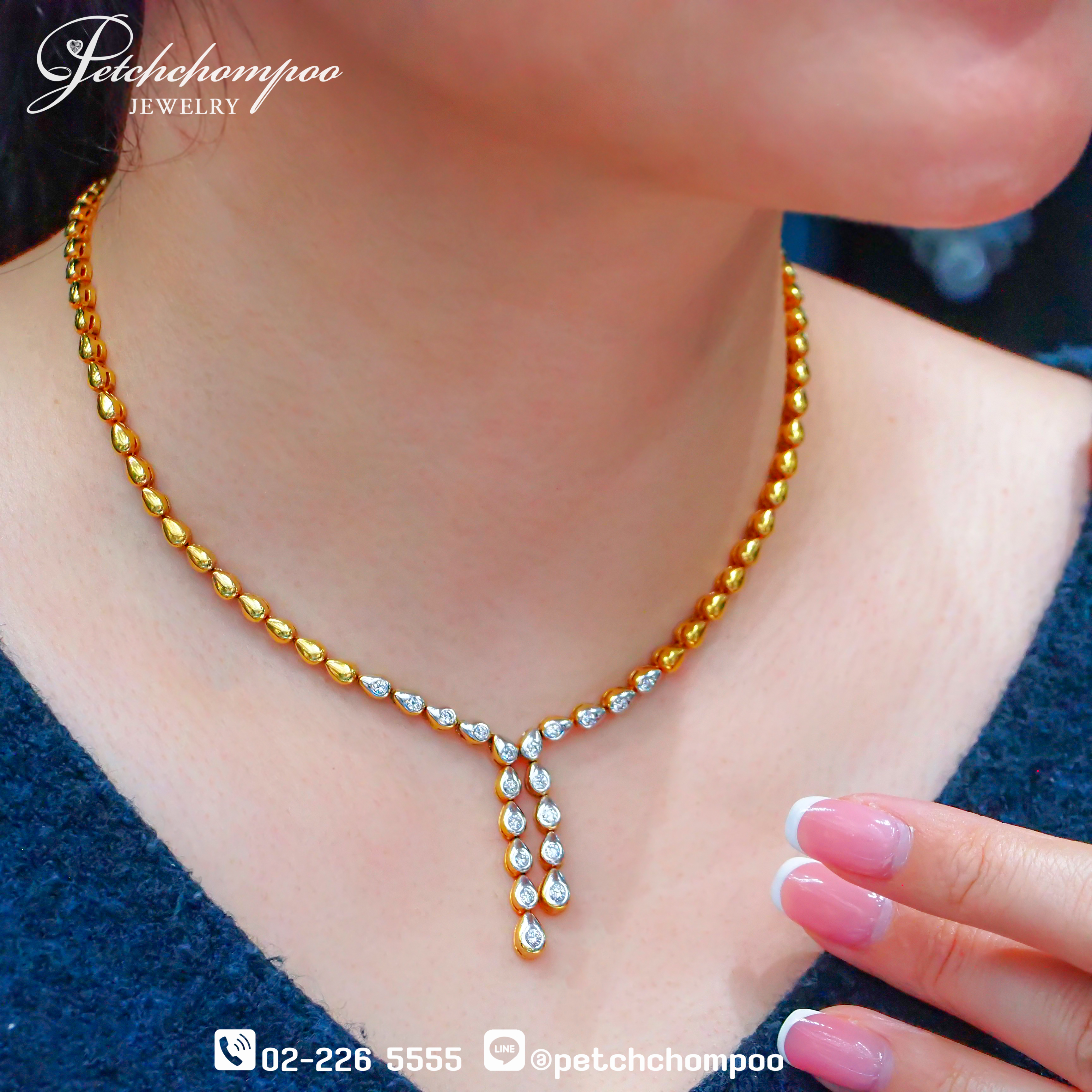 โดดเด่นด้วยดีไซน์ระย้าหยดน้ำเรียงไล่ระดับอย่างประณีต สื่อถึงความพริ้วไหวและอ่อนช้อยในทุกรายละเอียด ประดับลงบนตัวเรือนทองคำแท้ 18K น้ำหนัก 32.65 กรัม เส้นนี้เหมาะสำหรับผู้หญิงที่ต้องการลุคหรูเรียบ พร้อมความวิจิตรอย่างพอดีในทุกโอกาส
