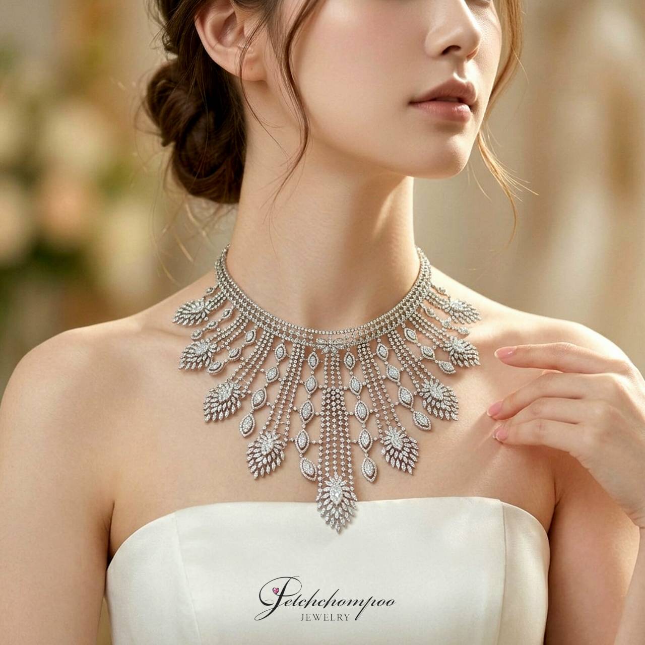 Imperial Majesty™ คือที่สุดของสร้อยคอเพชรระดับไฮจิวเวลรี่ ที่เผยให้เห็นพลังแห่งความหรูหราผ่านลวดลายประณีตอลังการ ร้อยเรียงเพชรแท้ทั้งหมด 2,509 เม็ด น้ำหนักรวมถึง 52.73 กะรัต ⇔ แซมด้วยเพชรทรงมาร์คีส์อย่างลงตัวบนตัวเรือนทองคำขาวน้ำหนัก 190.05 กรัม โดดเด่นด้วยดีไซน์พริ้วไหวดั่งม่านแห่งแสง สะท้อนประกายเจิดจ้าในทุกมุมมอง เหมาะสำหรับงานพรมแดง เวทีใหญ่ หรือโอกาสพิเศษที่ต้องการความ “ว้าว” แบบไร้ข้อกังขา