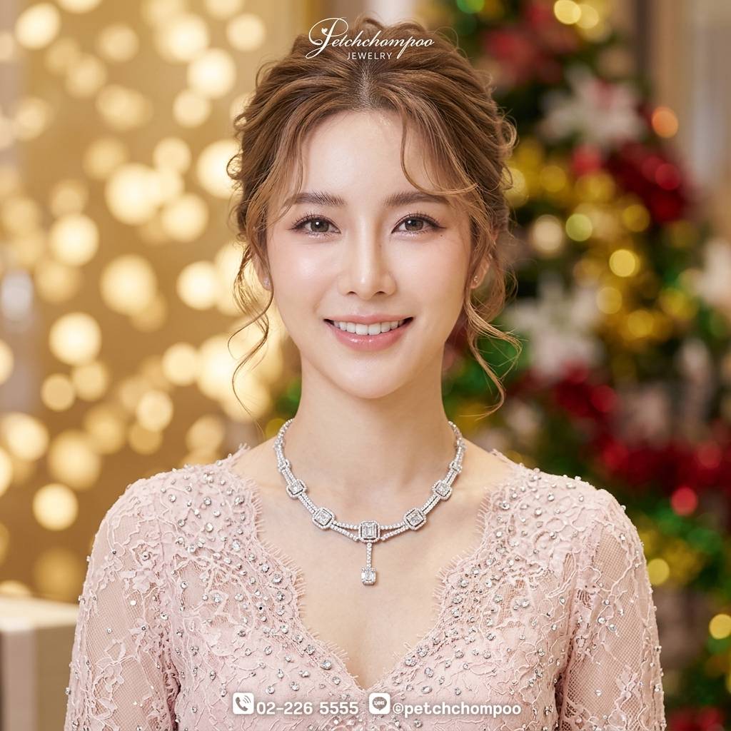 สร้อยคอเพชรดีไซน์หรูที่รังสรรค์ขึ้นด้วยเพชรทรง Emerald Cut ซึ่งขึ้นชื่อเรื่องเหลี่ยมคมสวย สะท้อนประกายได้อย่างเรียบหรูและสง่างาม