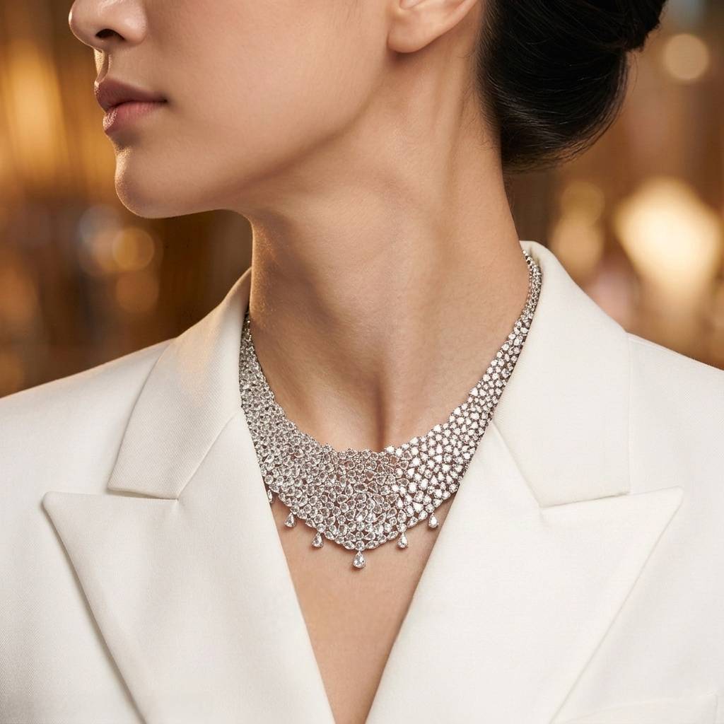 สร้อยคอ Eternal Radiance™ ชิ้นนี้ รังสรรค์จาก เพชรโรสคัต (Rose Cut) น้ำหนักรวม 38.21 กะรัต จำนวนกว่า 450 เม็ด ดีไซน์ถักทออย่างประณีตดุจงานศิลป์ชั้นสูง แผ่ประกายระยิบระยับดั่งหยาดน้ำค้างยามเช้า ตัวเรือนทองคำขาว 18K หนัก 73.80 กรัม รองรับน้ำหนักและรูปทรงได้อย่างสง่างาม เพิ่มลูกเล่นด้วยเพชรห้อยปลายเม็ดหยดน้ำ เรียงรายรอบแนวคอ สร้างมิติแห่งความอ่อนช้อยและหรูหรา เหมาะสำหรับผู้หญิงที่ต้องการความโดดเด่นในทุกงานสำคัญ