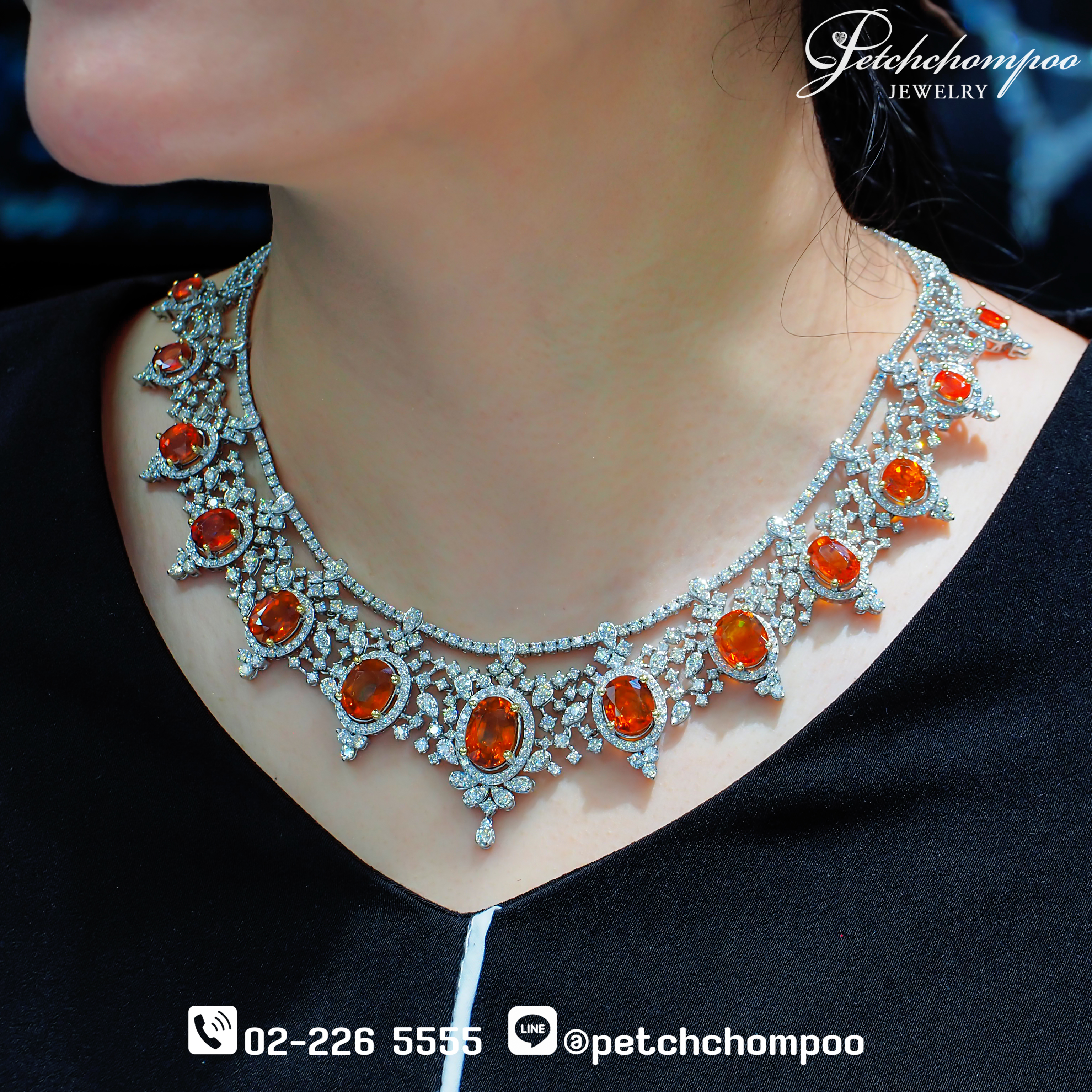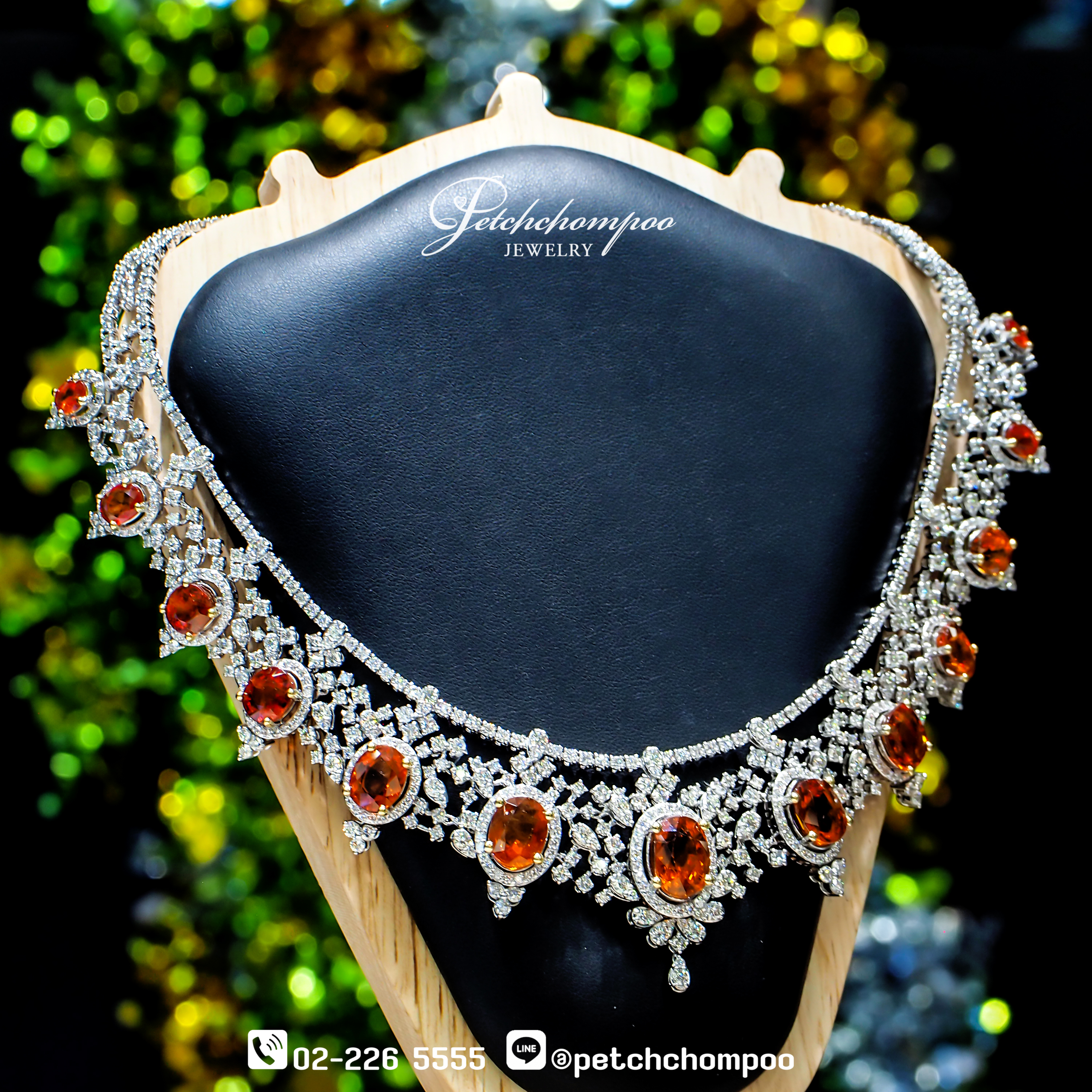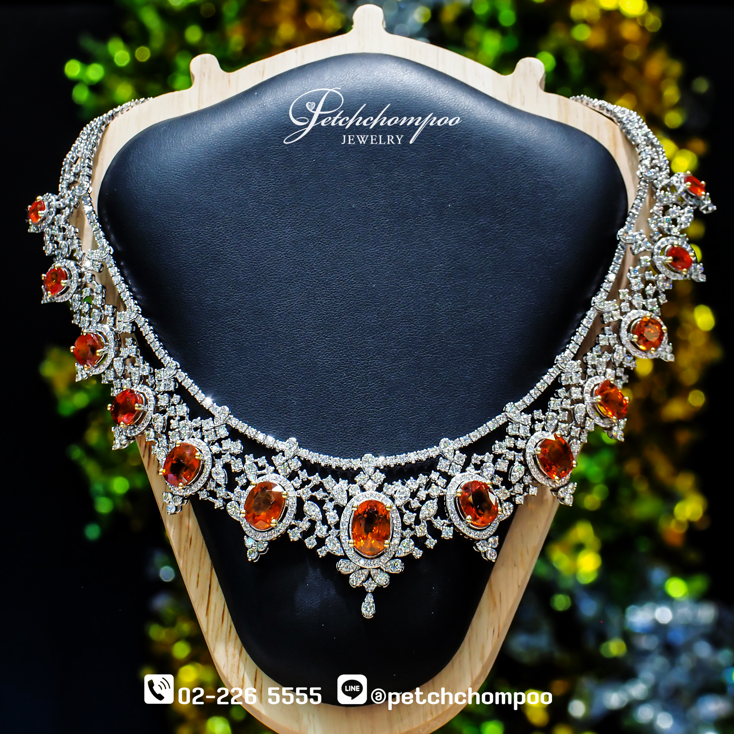Siam Sunset Symphony™ สร้อยคอไฮจิวเวลรี่ที่สะกดทุกสายตาด้วยเสน่ห์ของ บุษราคัมสีส้มสดจากบางกะจะ รวมทั้งสิ้น 13 เม็ด น้ำหนักรวม 48.40 กะรัต เฉดสีเปล่งประกายราวอาทิตย์ยามลับขอบฟ้า โอบล้อมด้วยเพชรเจียระไนงามกว่า 17.80 กะรัต จำนวน 683 เม็ด เรียงร้อยอย่างวิจิตรในลวดลายคล้ายลูกไม้ทองคำตัวเรือน ทองคำขาว 18K น้ำหนัก 103.35 กรัม ดีไซน์สมมาตรสง่างามดุจเครื่องราชสตรีผู้สูงศักดิ์ แสงสะท้อนจากเพชรและบุษราคัมตัดกันอย่างลงตัว ดั่งเสียงดนตรีแห่งความหรูหราที่บรรเลงอยู่บนลำคอของผู้สวมใส่