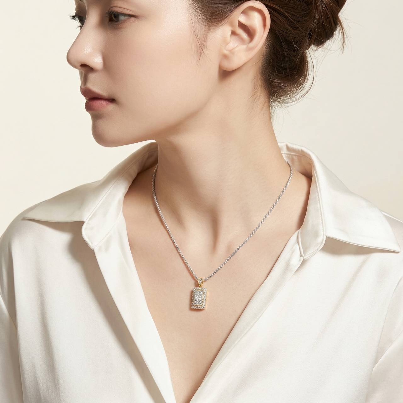 จี้ Regal Gleam Pendant™ ถ่ายทอดงานฝังเพชรระดับ High Jewelry ผ่านดีไซน์สี่เหลี่ยมคลาสสิกที่โดดเด่นด้วยความประณีตเป็นพิเศษ เพชรเม็ดหลักคุณภาพเยี่ยม 1.50 กะรัต (15 เม็ด) ถูกจัดเรียงเป็นลวดลายดอกไม้เรเดียลตรงกลาง ส่องประกายละเอียดทุกองศา เสริมด้วยเพชรล้อม 0.81 กะรัต (27 เม็ด) รวมเป็นเพชรรวมทั้งหมด 2.31 กะรัต จำนวน 42 เม็ด ช่วยขับให้กรอบสี่เหลี่ยมดูแพง คมชัด และโดดเด่นยิ่งขึ้น ตัวเรือนทองคำ 18K น้ำหนัก 6.69 กรัม เพิ่มมิติความอบอุ่นและความหรูหรา ให้ลุคที่สง่างามเหมาะทั้งสำหรับสวมใส่ทุกวันหรือในงานพิเศษที่ต้องการความโดดเด่น ดีไซน์นี้มอบความสมดุลระหว่างความหรูและความคลาสสิก—เป็นไอเท็มที่งดงามสะดุดตาในทุกช่วงเวลา ⇒✨
