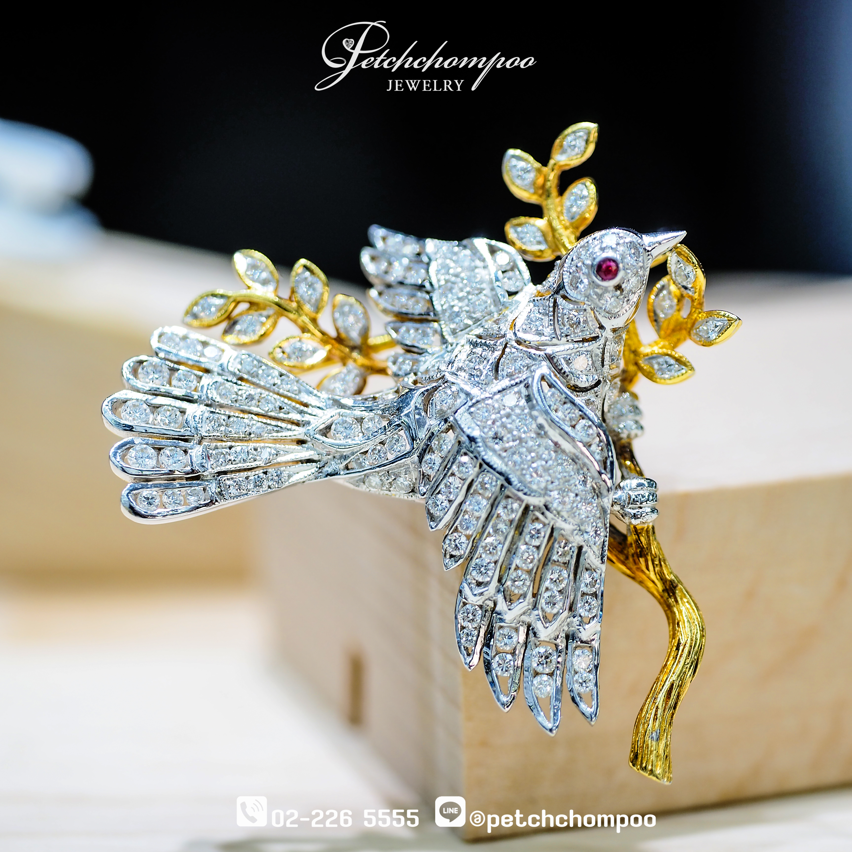 เข็มกลัดรูปนกกางปีก ดีไซน์ประณีตในสไตล์คลาสสิกหรู → ถ่ายทอดความหมายของอิสรภาพ ความหวัง และความสง่างาม ตัวเรือนทองคำผสานงานฝังเพชรอย่างละเอียดในทุกเส้นขน สร้างมิติของประกายที่พลิ้วไหวเสมือนนกกำลังโผบิน ดวงตาประดับอัญมณีสีแดง เพิ่มจุดเด่นแห่งพลังและชีวิต ⇒ เหมาะสำหรับผู้ที่หลงใหลเครื่องประดับเชิงศิลป์และชิ้นงานสะสมระดับไฮเอนด์