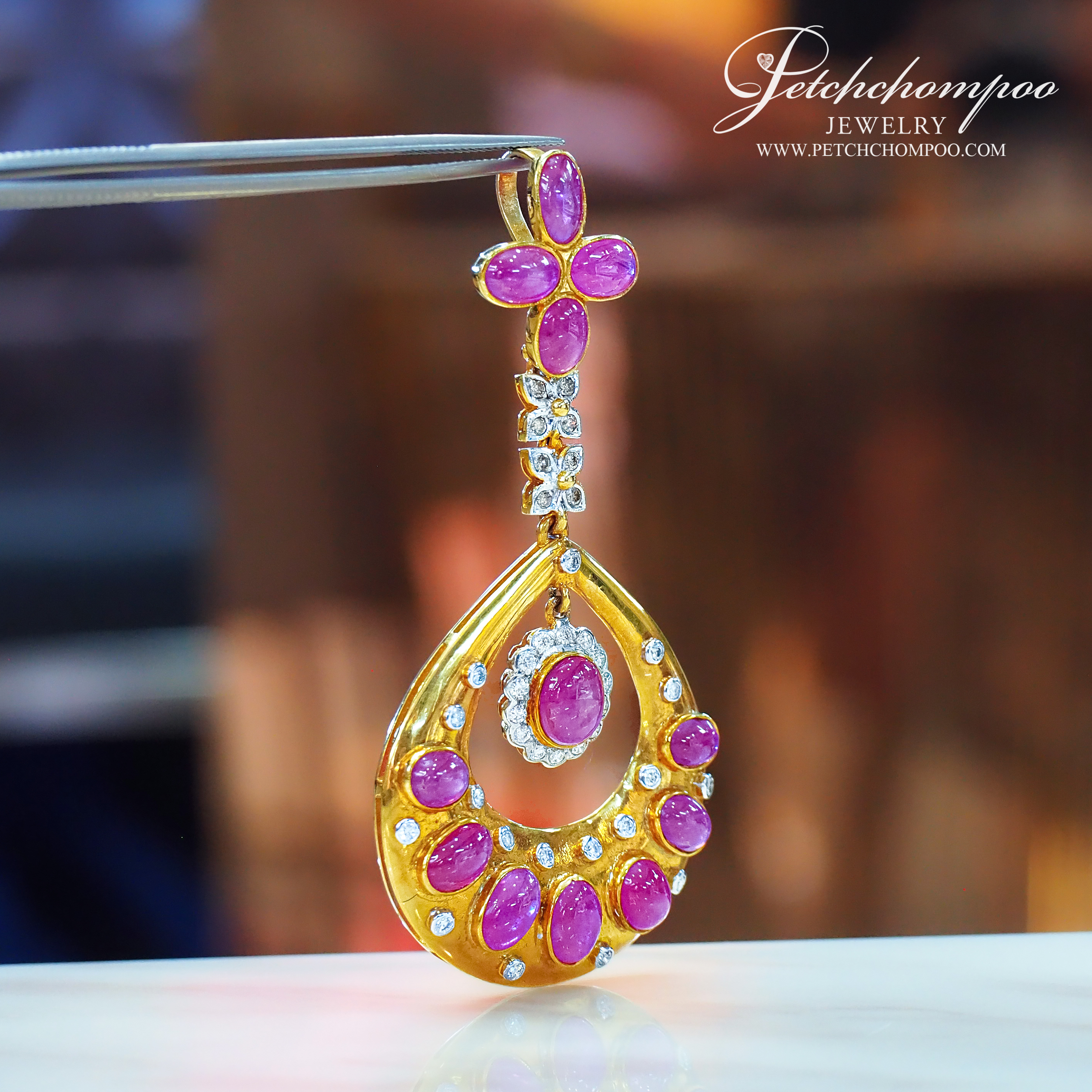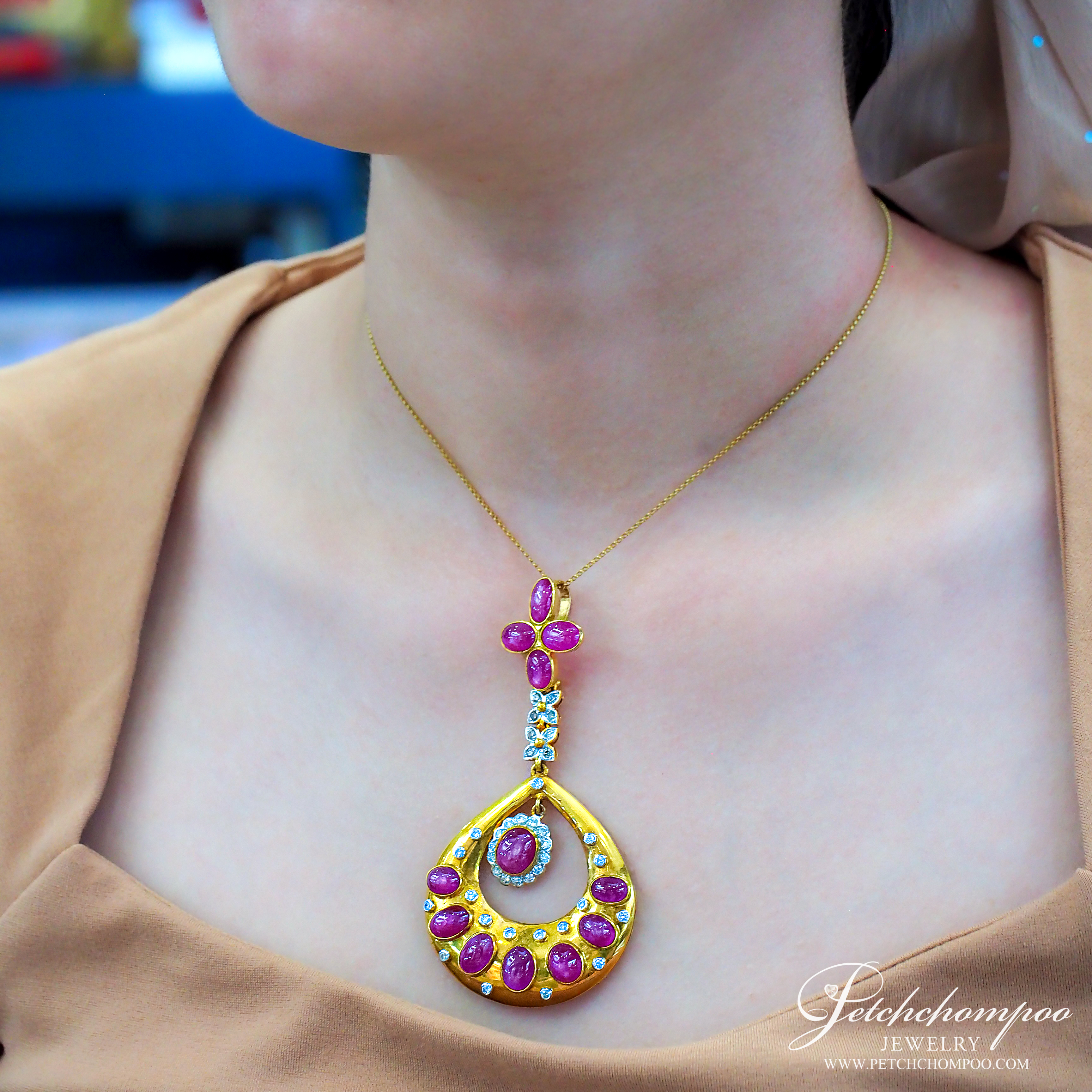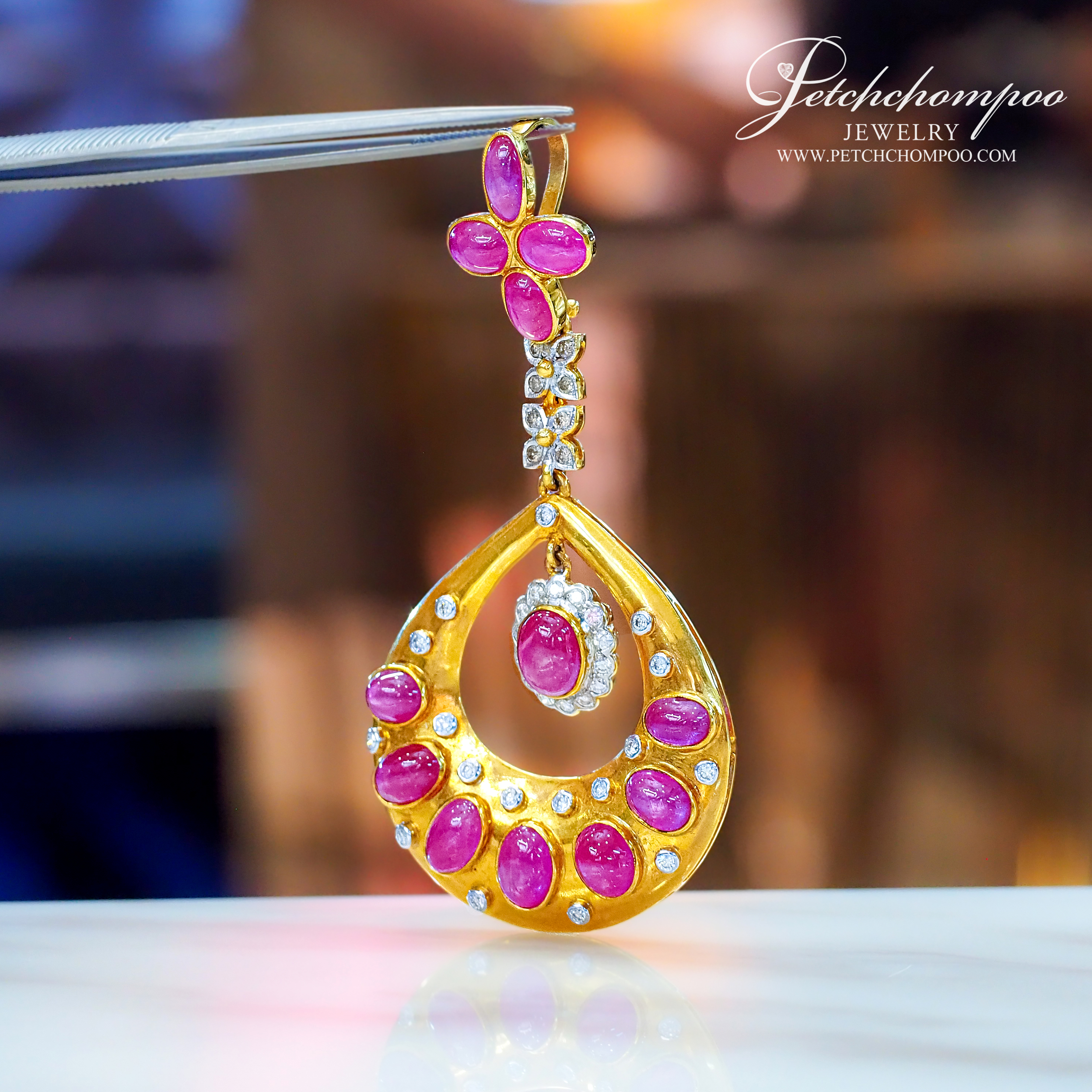 จี้ดีไซน์ทรงหยดน้ำสไตล์คลาสสิกสะกดทุกสายตา ด้วยทับทิมพม่าคาบูชองเนื้อดีจำนวน 12 เม็ด น้ำหนักรวม ≈ 20.00 กะรัต โดดเด่นด้วยเม็ดกลางแกว่งได้อย่างสง่างาม ล้อมรอบด้วยเพชรแท้ 38 เม็ด น้ำหนักรวม 1.20 กะรัต ตัวเรือนทองคำ 18K น้ำหนัก 21.05 กรัม เล่นลวดลายล้อมเพชรคล้ายพระมหามงกุฎโบราณ ให้ฟีลหรูหราอย่างราชนิกุล เหมาะสำหรับงานออกงานสำคัญ และยังสามารถเก็บสะสมเป็นของมีค่าที่ไม่ตกยุค ✨™