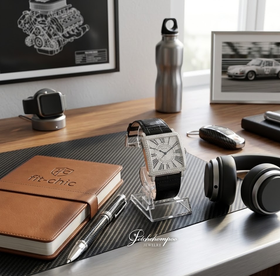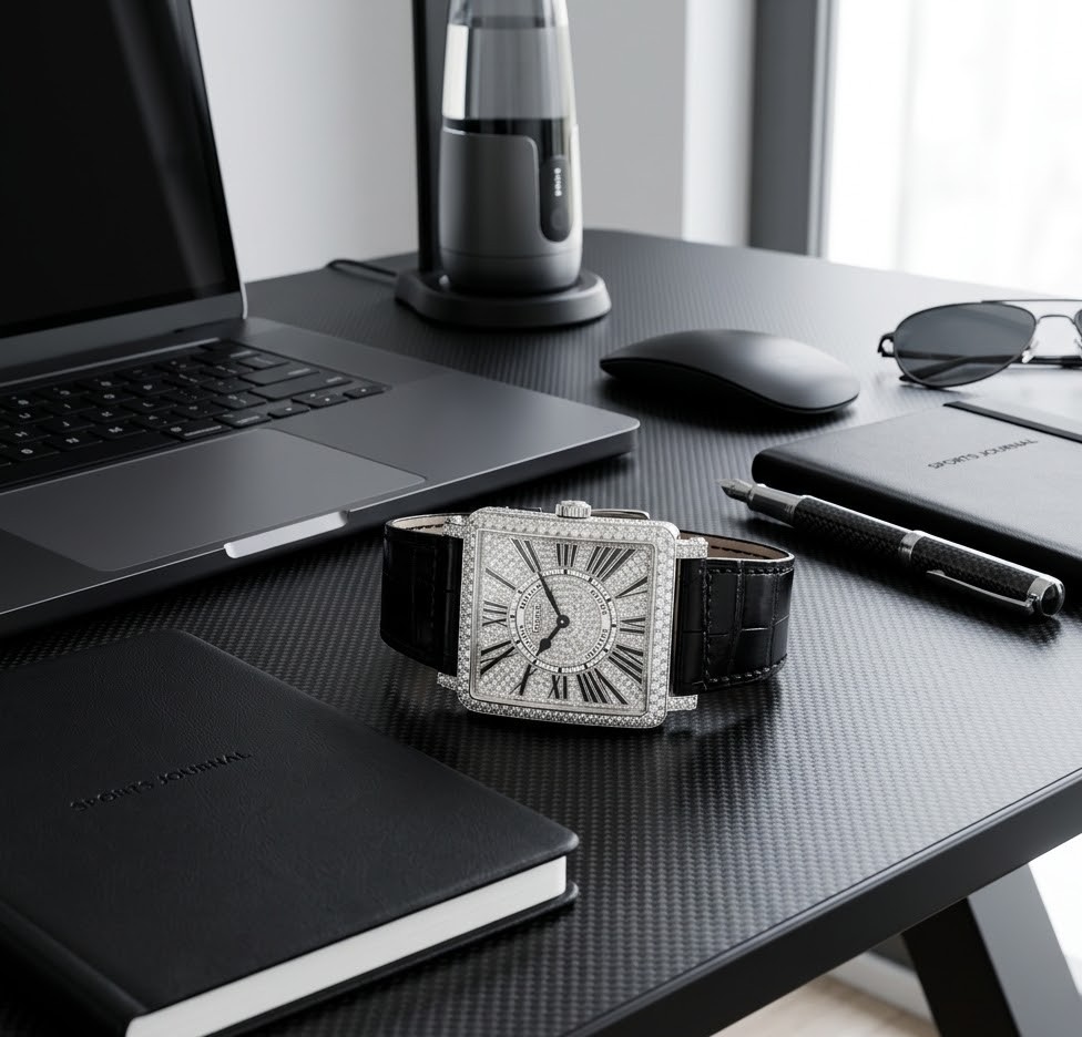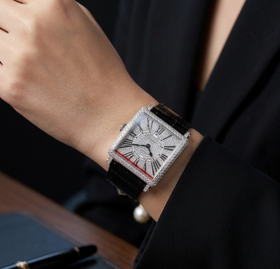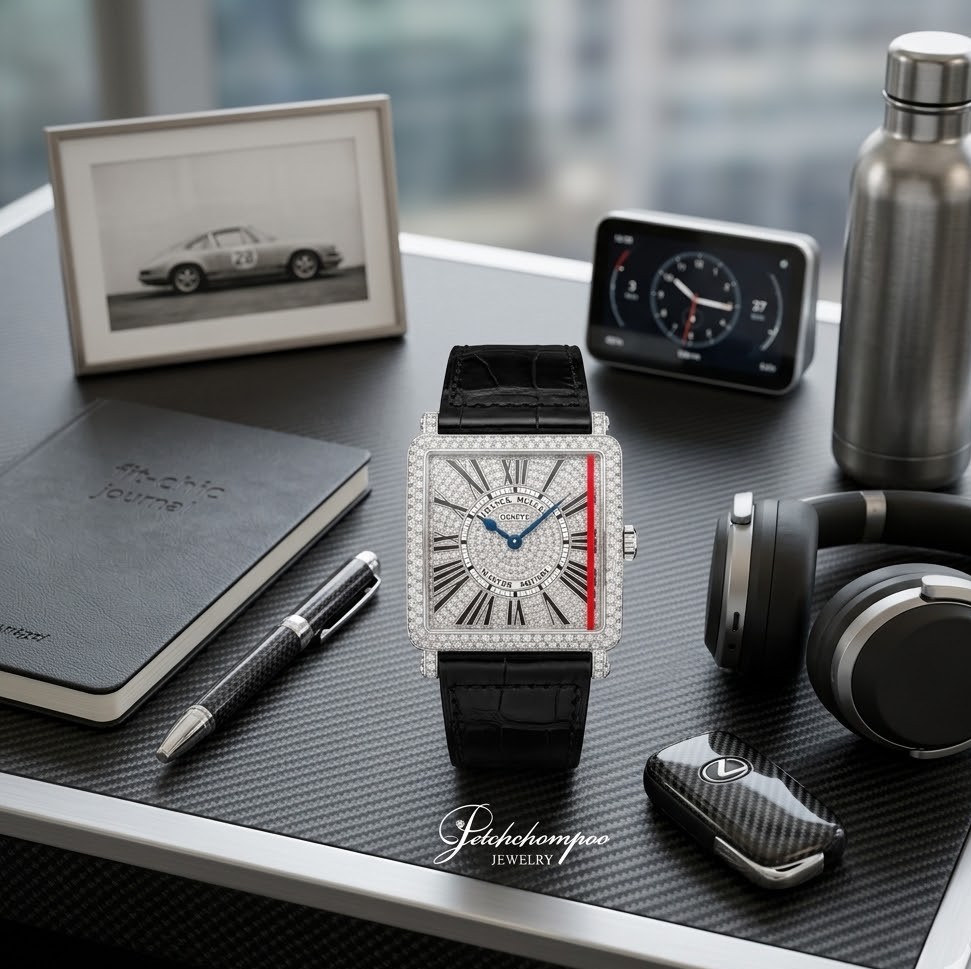 เรือนสี่เหลี่ยมทรง Master Square อันเป็นเอกลักษณ์ โดดเด่นด้วยการฝังเพชรแท้แบบ After Setting เต็มหน้าปัดและขอบตัวเรือน เพิ่มประกายระยิบระยับอย่างหรูหรา หน้าปัดดีไซน์ Roman Numerals คลาสสิก ผสานรายละเอียดชั้นวงแหวนกลางอย่างประณีต ⇒ สะท้อนความงามแบบ Haute Horlogerie สายหนังแท้สีดำเงา เพิ่มลุคสุภาพภูมิฐาน เหมาะสำหรับงานกลางคืน งานทางการ หรือสายสะสมที่ชื่นชอบเรือนเพชรโดดเด่น