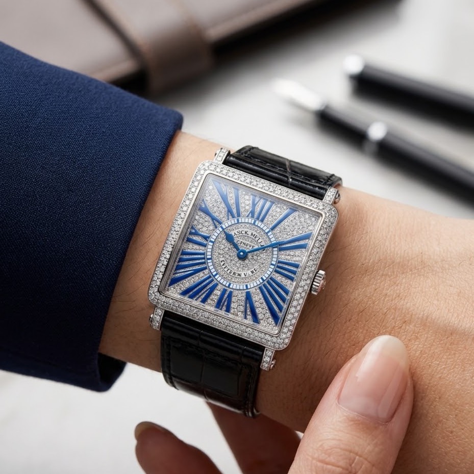 สัมผัสความเลอค่าบนข้อมือกับดีไซน์สี่เหลี่ยมจัตุรัสอันเป็นเอกลักษณ์ ตัวเรือนและหน้าปัดคัดสรร เพชรแท้ After Setting น้ำงาม เล่นไฟที่สุด เสริมความโดดเด่นด้วยเลขโรมันลงยาสีฟ้า มอบลุคที่ดูภูมิฐานและอ่อนหวานในเวลาเดียวกัน
