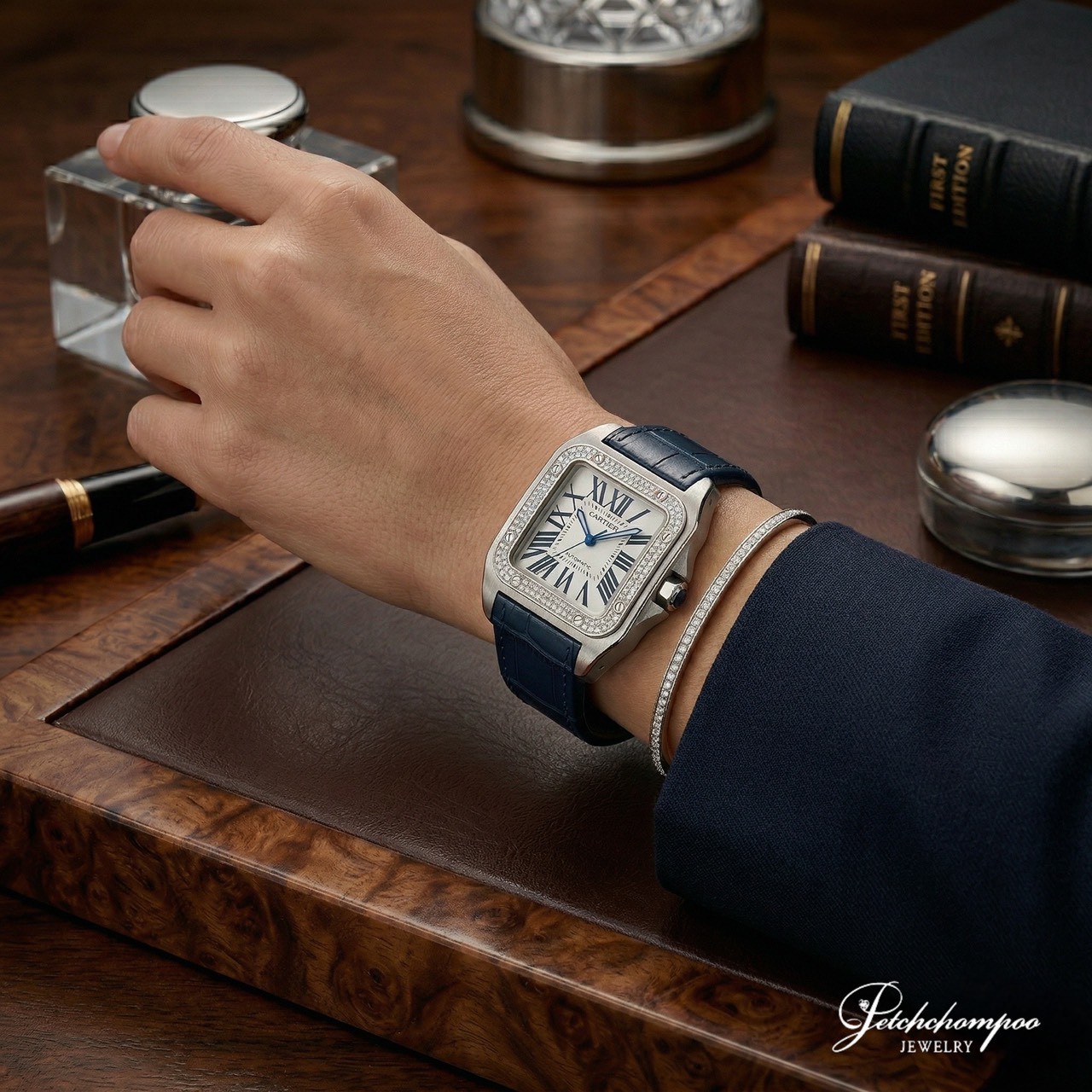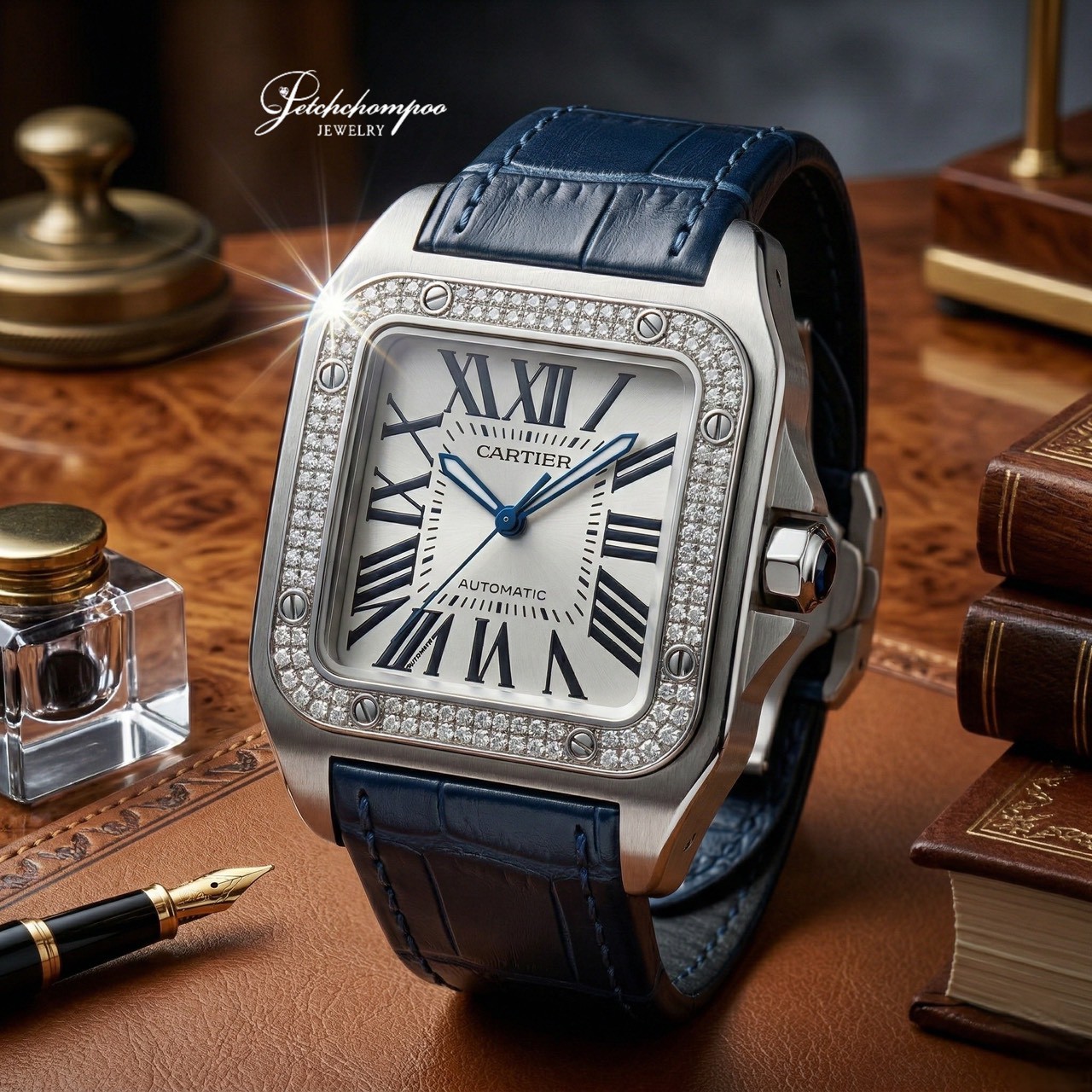 นาฬิกา Cartier Santos 100 Size XL เรือนเวลาที่สะท้อนความสง่างามระดับตำนาน โดดเด่นด้วยหน้าปัดขาวสะอาดตาตัดกับหลักชั่วโมงเลขโรมันสุดคลาสสิก เพิ่มความระยิบระยับมีระดับด้วยการ ฝังขอบเพชรแท้ (Diamond Bezel) ที่คัดสรรมาอย่างประณีต ตัดกับสายหนังสีน้ำเงินเข้ม และ เม็ดมะยม Blue Sapphire ได้อย่างลงตัว พร้อมให้คุณครอบครองในราคาที่ดีที่สุด
