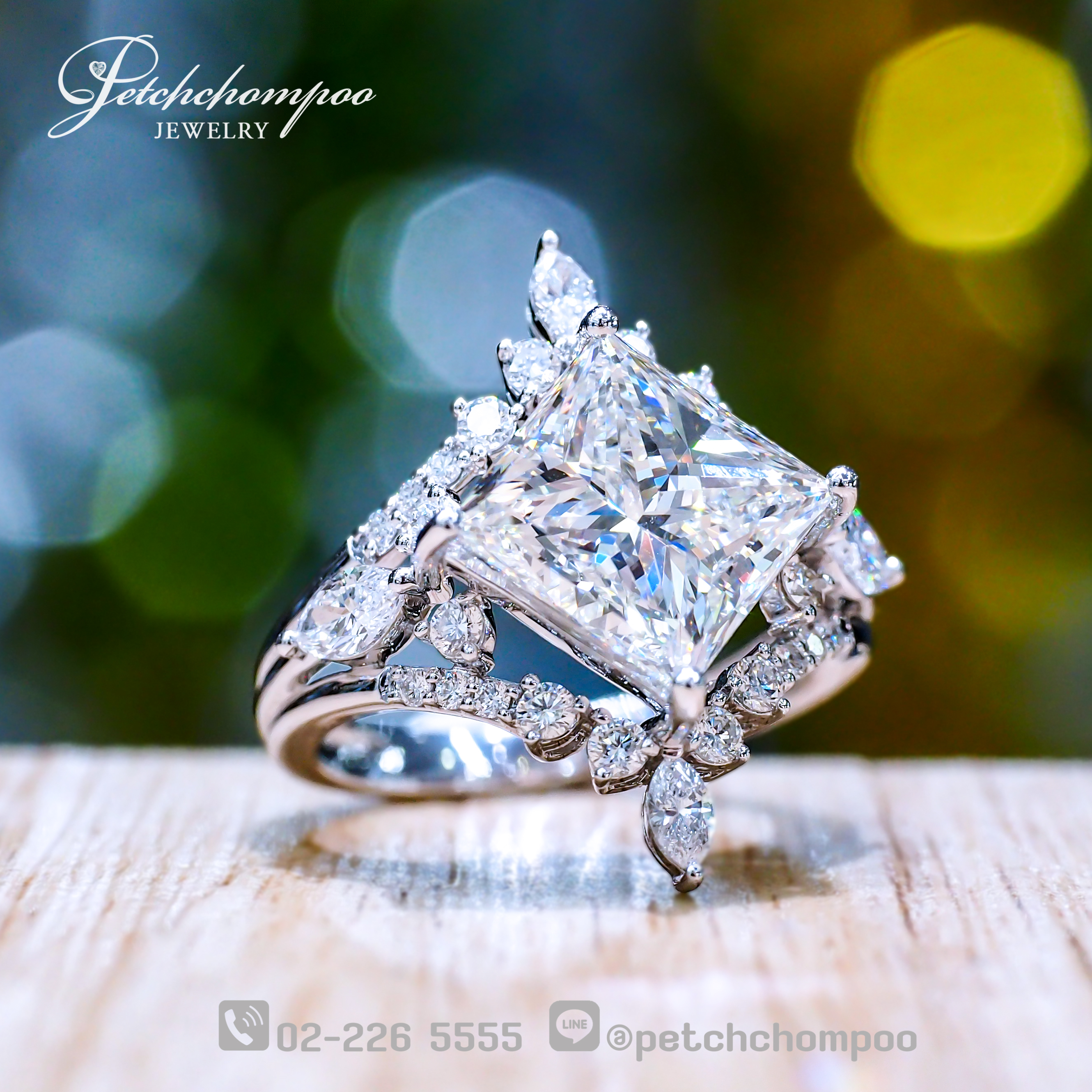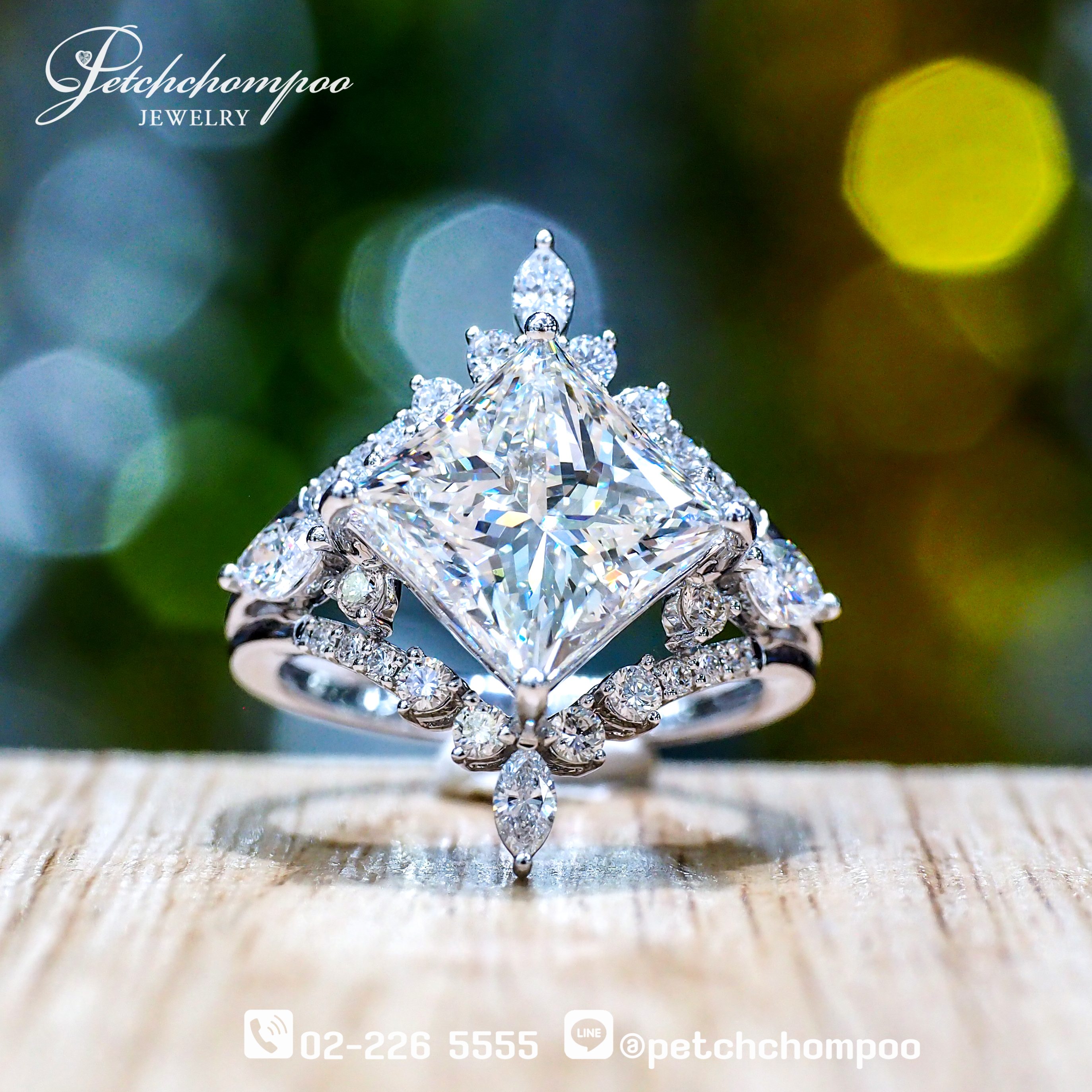 แหวน Royal Prism Blossom โดดเด่นด้วยเพชรเม็ดหลัก Princess Cut ขนาดใหญ่ 4.00 กะรัต (H / LC / 2EX / HRD) เปล่งประกายคมชัด ส่องไฟเจิดจ้าเหนือระดับ ประกบด้วยเพชรทรงมาร์คีส์และเพชรกลมรวม 0.85 กะรัต จัดวางอย่างประณีตเป็นลวดลายดอกไม้พริ้วไหว สร้างมิติระยิบระยับรอบตัวเรือน ตัวเรือนทองคำขาว 5.30 กรัม ดีไซน์โอบรับเพชรอย่างสง่างาม ทำให้ชิ้นงานดูทั้งหรูหรา อ่อนหวาน และน่าหลงใหลในเวลาเดียวกัน เหมาะสำหรับผู้ชื่นชอบงานเพชรเม็ดใหญ่ ดีไซน์ล้ำค่า และงานฝีมือระดับมาสเตอร์
