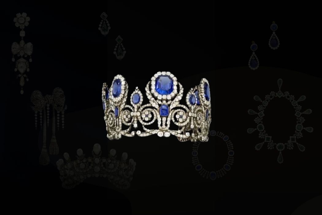 เทียราแซฟไฟร์คีลอนสีน้ำเงินเข้มจากศรีลังกาที่ประดับเพชร เป็นส่วนหนึ่งของเซ็ตที่เคยเป็นของราชินีฮอร์แต็งส์ ธิดาบุญธรรมของจักรพรรดินโปเลียน ก่อนถูกขายให้พระเจ้าหลุยส์-ฟิลิปป์ในปี 1821 เพื่อมอบให้ราชินีมารี-อาเมลี