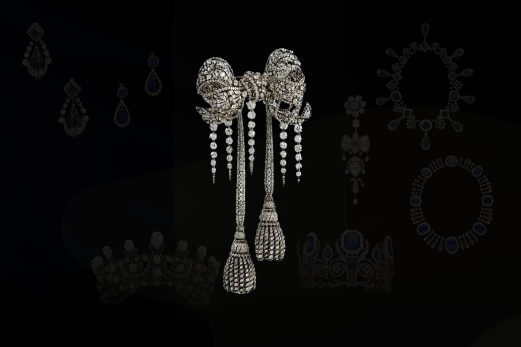 เข็มกลัดโบว์เพชรกว่า 4,000 เม็ดที่ฟร็องซัวส์ คราเมอร์สร้างขึ้นในปี 1855 เดิมเป็นส่วนกลางของเข็มขัดราชินี จักรพรรดินโปเลียนที่ 3 มอบให้จักรพรรดินีเออเจนีเพื่อสวมในงาน Exposition Universelle ที่ปารีส