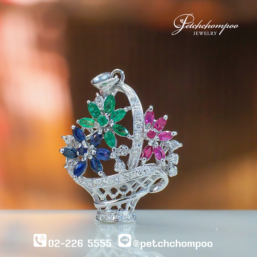 จี้ตะกร้าฝังเพชรและพลอย งานประณีตสวยงาม เป็นการผสมผสานระหว่างเพชรและพลอยอย่างลงตัว ตัวเรือนเป็นทองคำขาว 18K สานขึ้นเป็นรูปตะกร้า ประดับด้วยเพชร รวม 0.19 กะรัต จำนวน 20 เม็ด จี้เพชรตะกร้าเหมาะจะเป็นของขวัญให้คนพิเศษหรือคนที่แอบมีความรู้สึกดีๆ ให้ สื่อถึงความปรานาดีที่ไม่วันเสื่อมคลาย