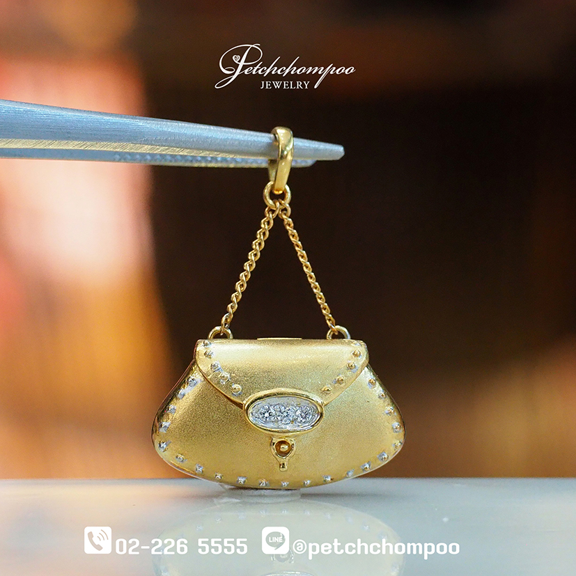 จี้กระเป๋าทองฝังเพชร เหมาะจะเป็นของขวัญอันเลอค่ามอบให้คนพิเศษหรือของขวัญครบรอบวันแต่งงาน สื่อถึงความร่ำรวย มีเงินทองไหลมาเทมา ยิ่งประดับด้วยเพชรเบลเยี่ยมคัท ยิ่งปังมาก เพชรน้ำใส รวม 0.15 กะรัต ฝังบนตัวเรือนทองคำหนัก 5.10 กรัม บอกลยเลยว่าใส่คู่กับสร้อยคอได้ทุกแบบ ทุกสไตล์