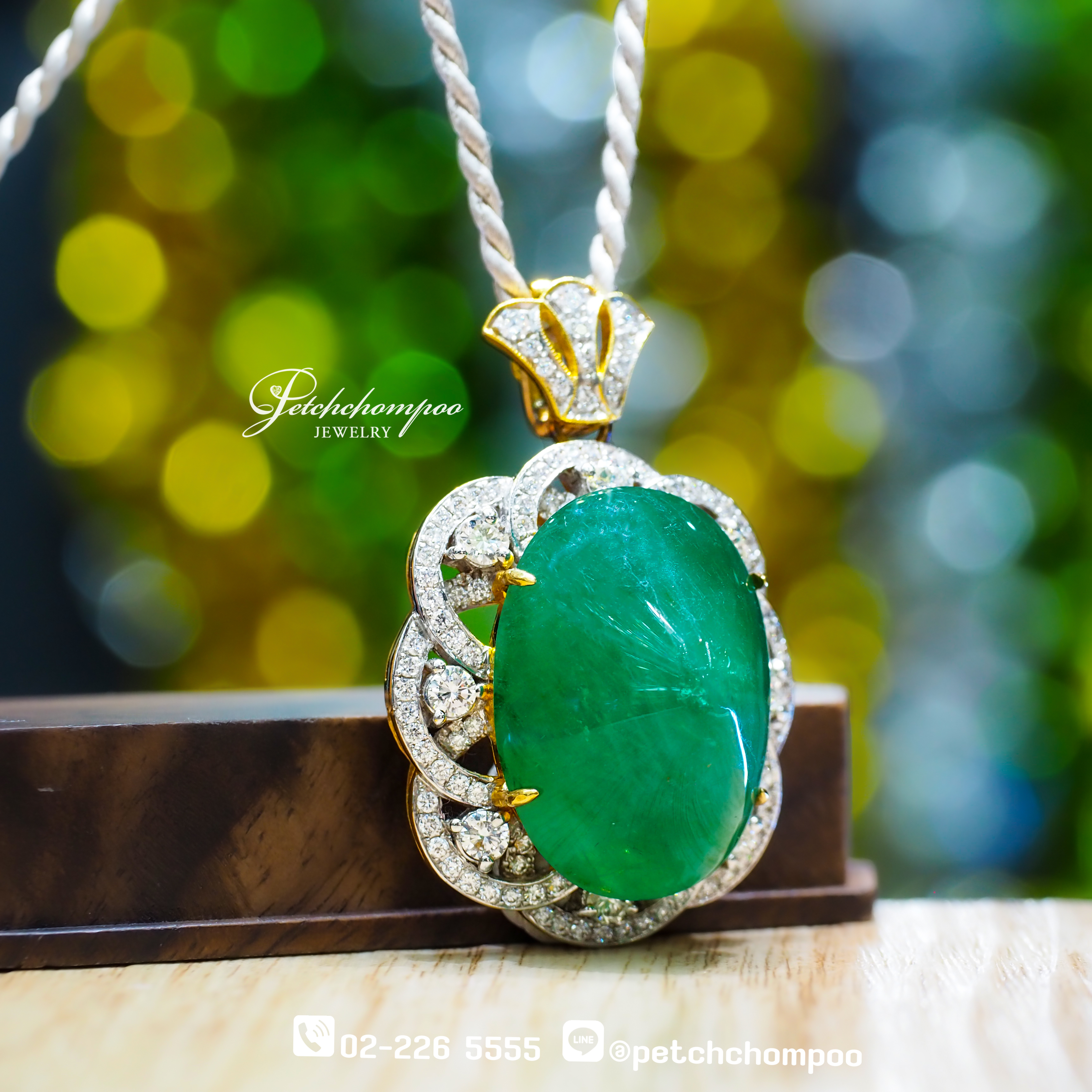 จี้เพชรมรกตโคลัมเบียฝังเพชร จีเพชรเสริมสิริมงคล ทำให้โชคดี ประสบความสำเร็จ สมหวังร่ำรวย แถมยังคุ้มครองภัยอัตรายจากสิ่งชั่วร้าย มรกตโคลัมเบียมีสีเขียวสดใส ถือเป็นสีที่สวยที่สุด ได้รับความนิยมสูงมาก ตัวเรือนทำจากทองคำขาว 18K ประดับด้วยเพชรรวม 0.58 กะรัต (จำนวน 44 เม็ด)