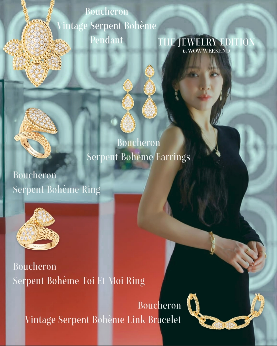 สำหรับลุคที่ไม่พูดถึงไม่ได้เลยคือลุคของชินฮเยซอนจัดเต็มด้วยเครื่องประดับจากแบรนด์ BOUCHERONแบรนด์เครื่องประดับเก่าแก่ของฝรั่งเศส คอลเลคชั่นที่ประกอบไปด้วยสร้อยคอSerpent Bohème pendant $11,550 ต่างหู Serpent Bohème earrings xs, s and mmotifs $24,250 แหวน Serpent Bohème ring s motifs $9,050 กำไลข้อมือ Vintage Serpent Bohème link bracelet $26,300 นอกจากนั้นยังมีแหวน Serpent Bohème Toi et Moi Ring S motifs $12,900 ชุดคอลเลชั่น เซอร์ปองต์ โบแฮม เครื่องประดับไอคอนิกที่มีความโดดเด่นมีเอกลักษณ์เฉพาะตัวและมีประวัติศาสตร์มายาวนาน จิวเวลรี่ชั้นสูงจากฝรั่งเศสเน้นใช้ตัวเรือนเป็นทองคำเหลือง ทั้งสร้อยกำไล ต่างหูและแหวน