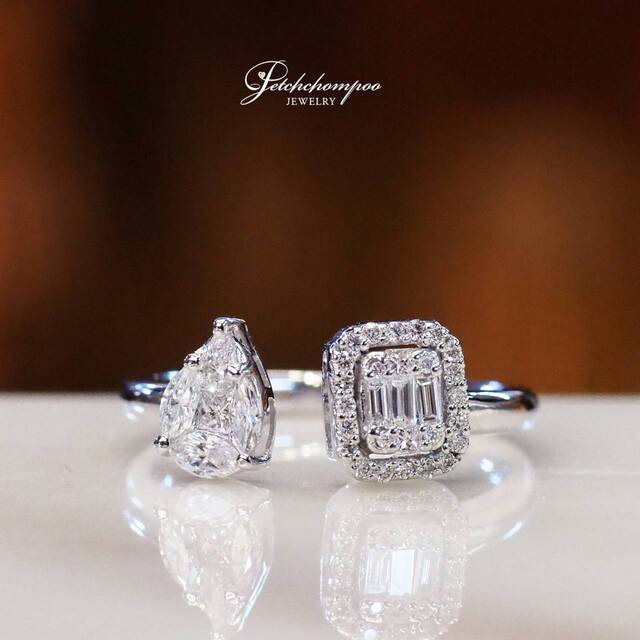 แหวนเพชร Fancy Duo Cut มาในดีไซน์เปิดปลายแบบไม่สมมาตร ฝั่งหนึ่งประดับด้วยเพชรทรงหยดน้ำ มีเพชรกลมและเพชรทรงมาคีย์ล้อมรอบให้ความอ่อนหวานอ่อนโยน ส่วนอีกฝั่งประดับด้วยเพชรทรงสี่เหลี่ยมแชมเปญ เรียงตัวงดงามเปล่งประกายแบบเรขาคณิต เรียกได้ว่าเป็นการจับคู่กันอย่างลงตัว หรูหรา พรีเมี่ยม มีความทันสมัยแต่ไม่ทิ้งความคลาสสิค งานออกแบบร่วมสมัยที่ดึงดูดสายตา เพชรรวมกว่า 34 เม็ด ราวๆ 0.29 กะรัต ตัวเรือนทองคำขาว 18K น้ำหนัก 3.03 กรัม