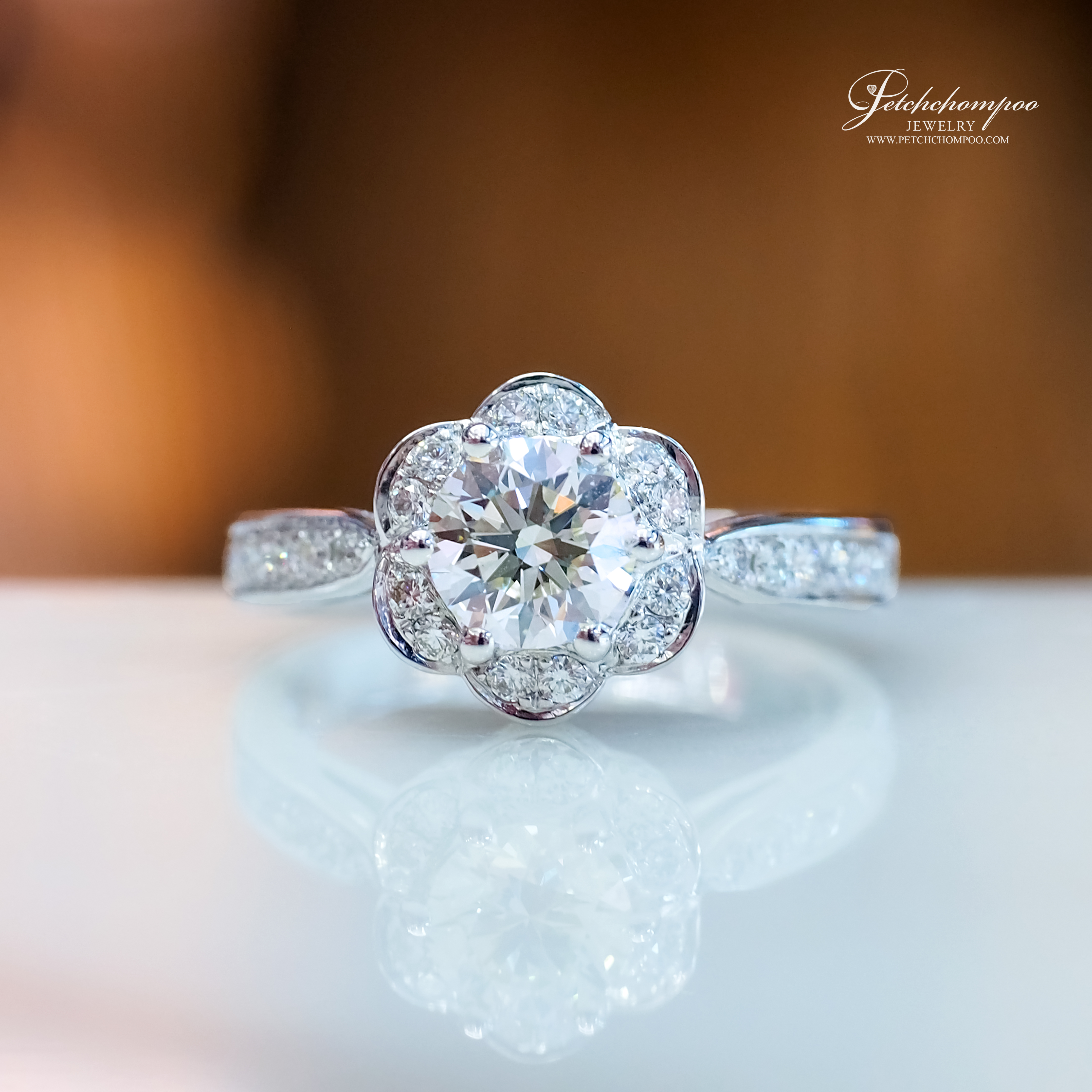แหวนเพชรเม็ดกลางขนาด 0.81 กะรัต คุณภาพพรีเมี่ยม น้ำงามเจียระไนสวยสมบูรณ์ ประดับอยู่กลางดีไซน์กลีบดอกไม้รูปหัวใจ อันเป็นเอกลักษณ์ของ Floral Radiance™ เสริมด้วยเพชรล้อม 58 เม็ด รวม 0.40 กะรัต เรียงอย่างพิถีพิถันรอบเม็ดกลางและบนก้านแหวน สื่อถึงความงดงามละมุนละไม เปล่งประกายอย่างลงตัวบนตัวเรือนทองคำขาว 18K น้ำหนัก 4.55 กรัม เหมาะทั้งสำหรับแหวนแต่งงานหรือแหวนหมั้นที่ตราตรึงใจ