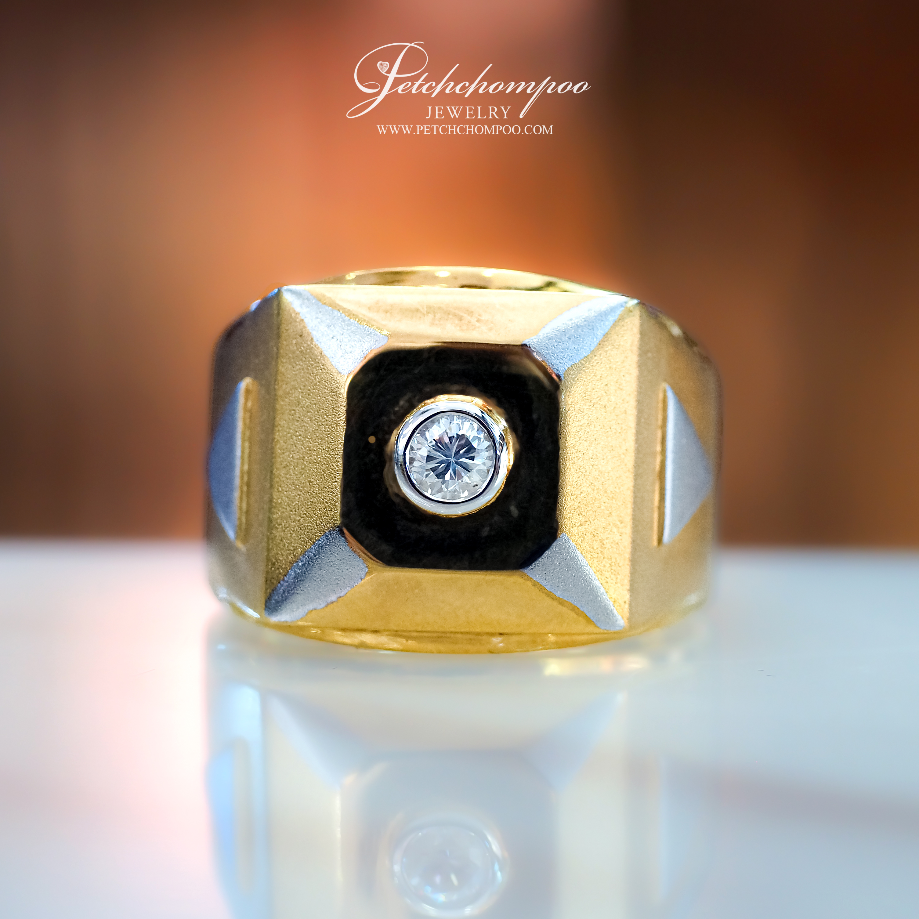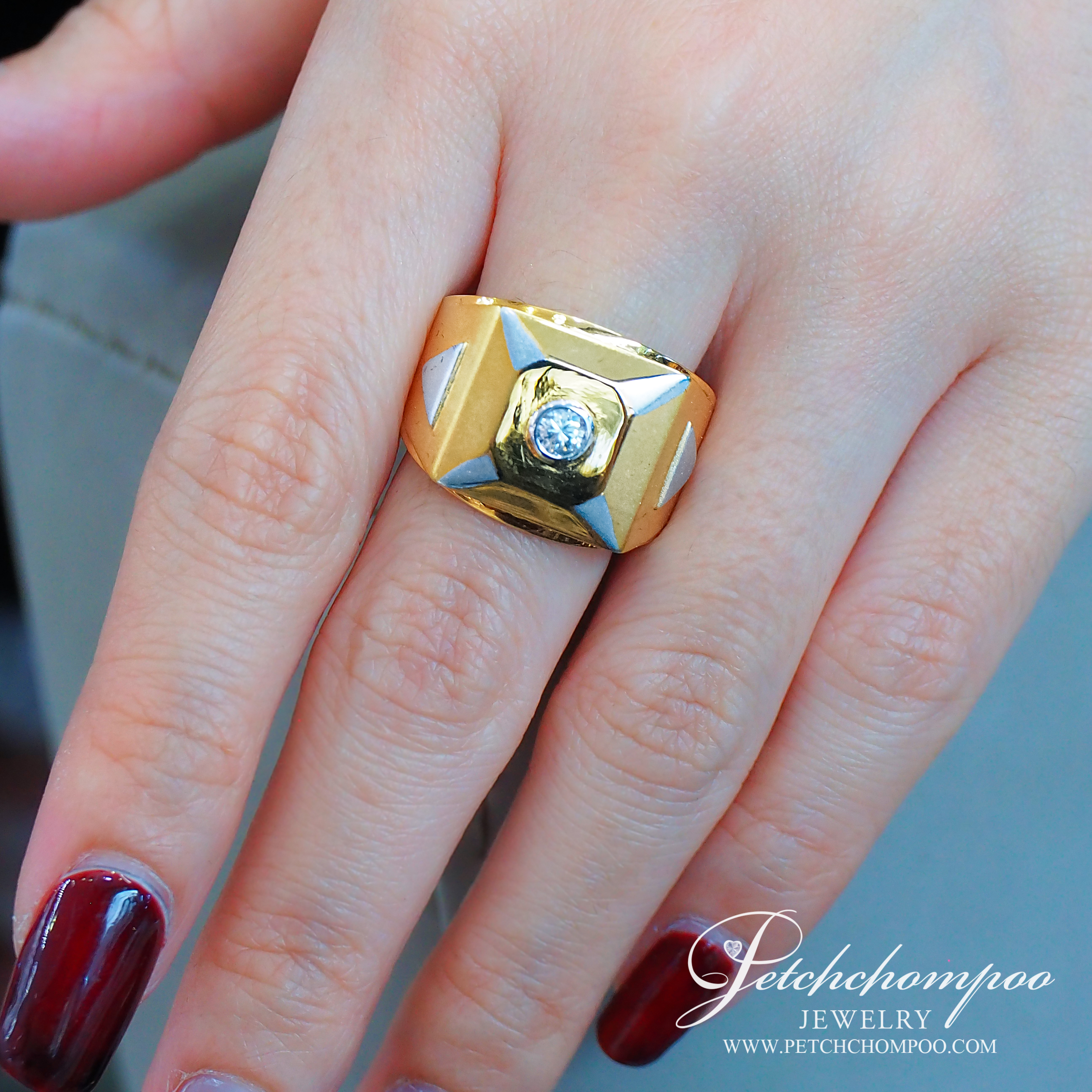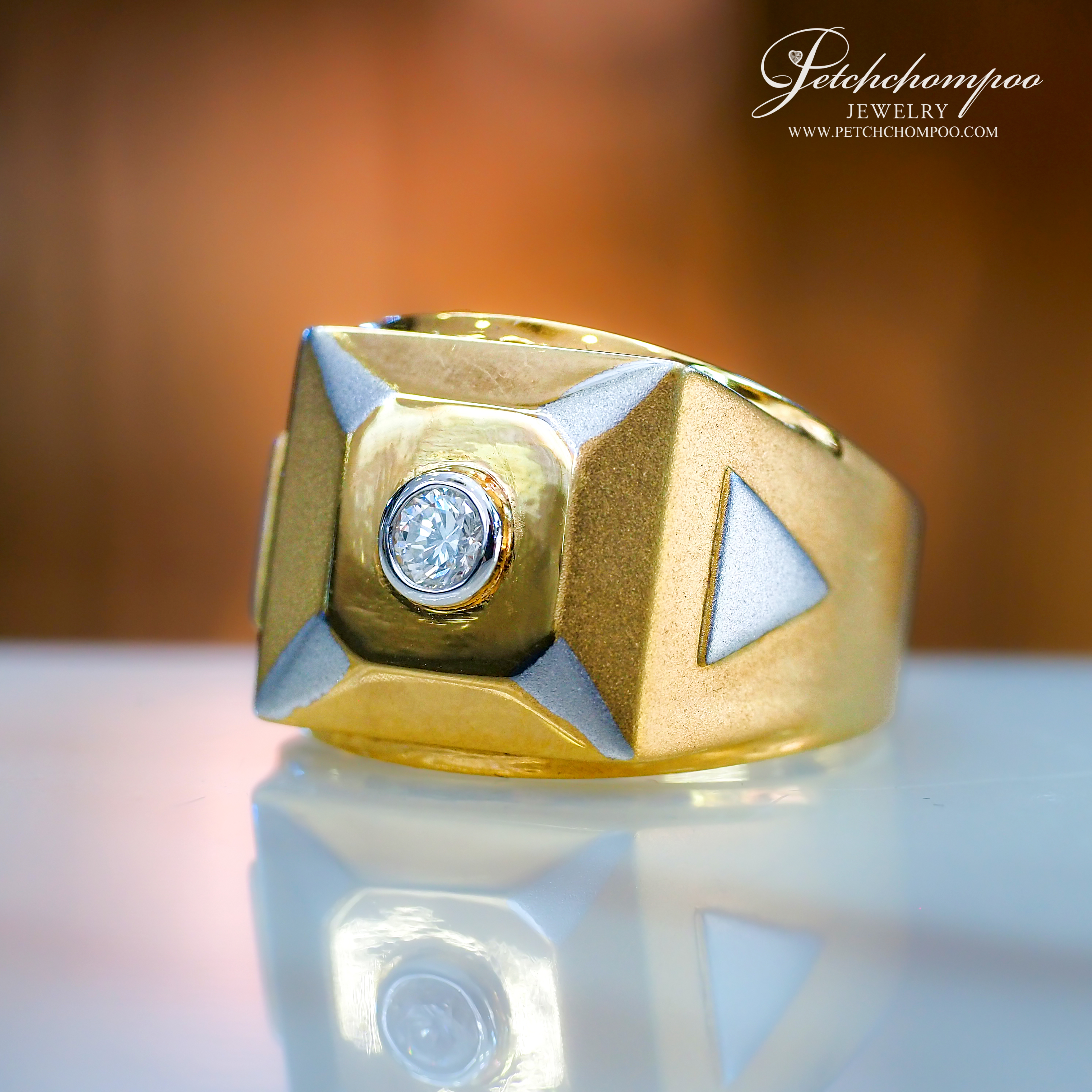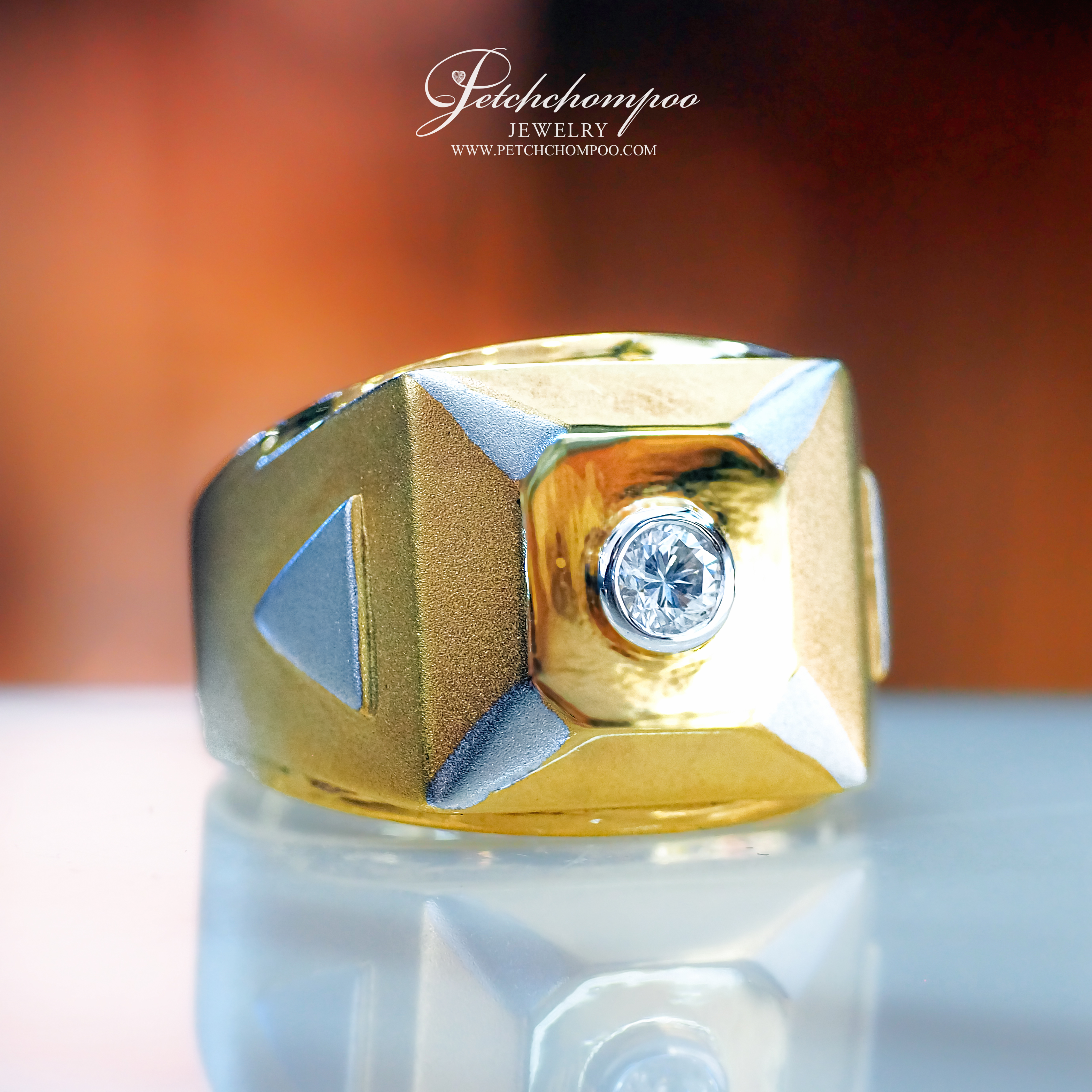 แหวนทองคำแท้ดีไซน์ร่วมสมัย โดดเด่นด้วยรูปทรงเรขาคณิตที่เล่นกับแสงและเงาอย่างชาญฉลาด เพชรเม็ดเดี่ยวเจียระไนกลม น้ำหนัก 0.20 กะรัต ฝังล้อมกรอบอย่างแน่นหนาในตัวเรือนทรงเหลี่ยมดีไซน์ลึกมิติ ตัวเรือนทองคำหนัก 13.26 กรัม ตกแต่งลวดลายสามเหลี่ยมฝังทองคำขาว ตัดกับพื้นผิวทองด้านได้อย่างน่าประทับใจ เหมาะสำหรับสุภาพบุรุษผู้ชื่นชอบความโดดเด่นทันสมัยและความคมชัดในดีไซน์