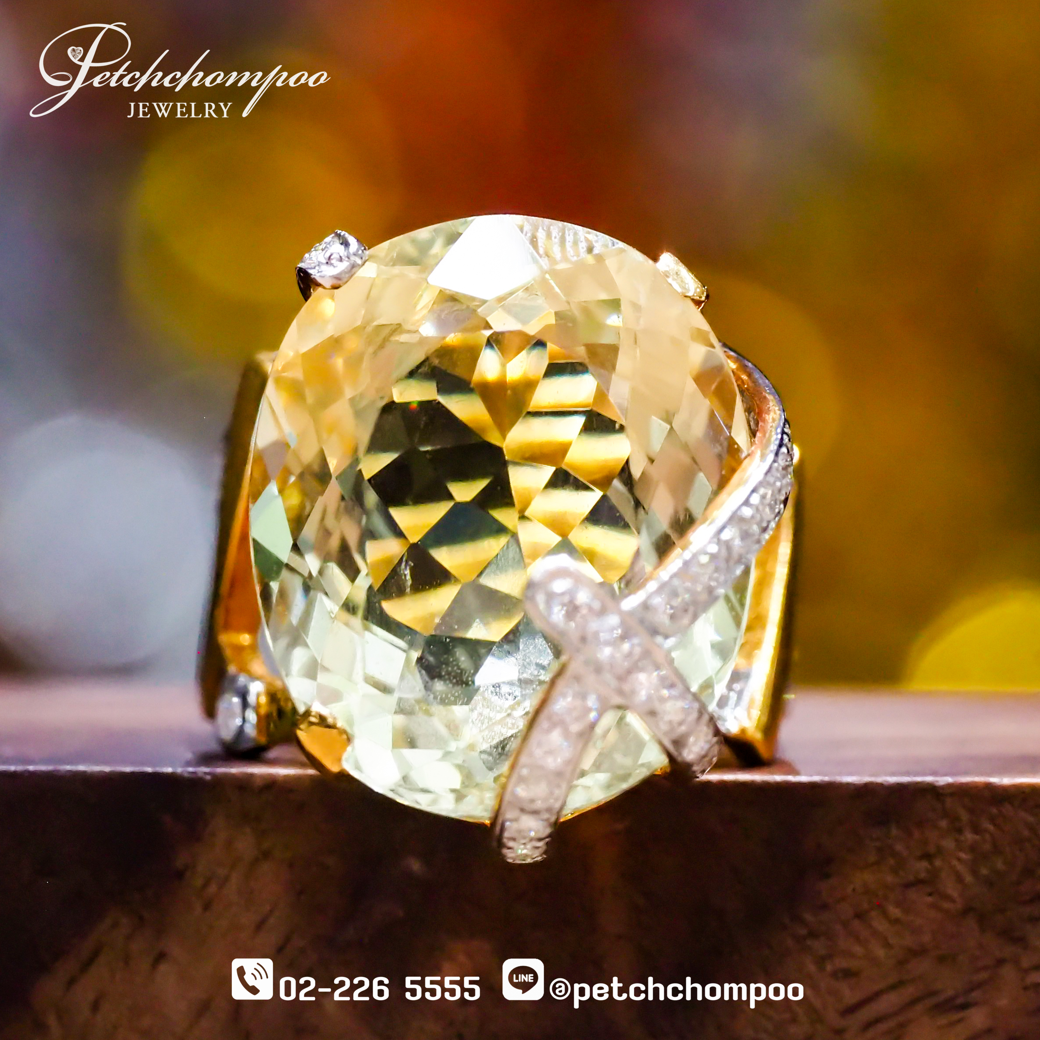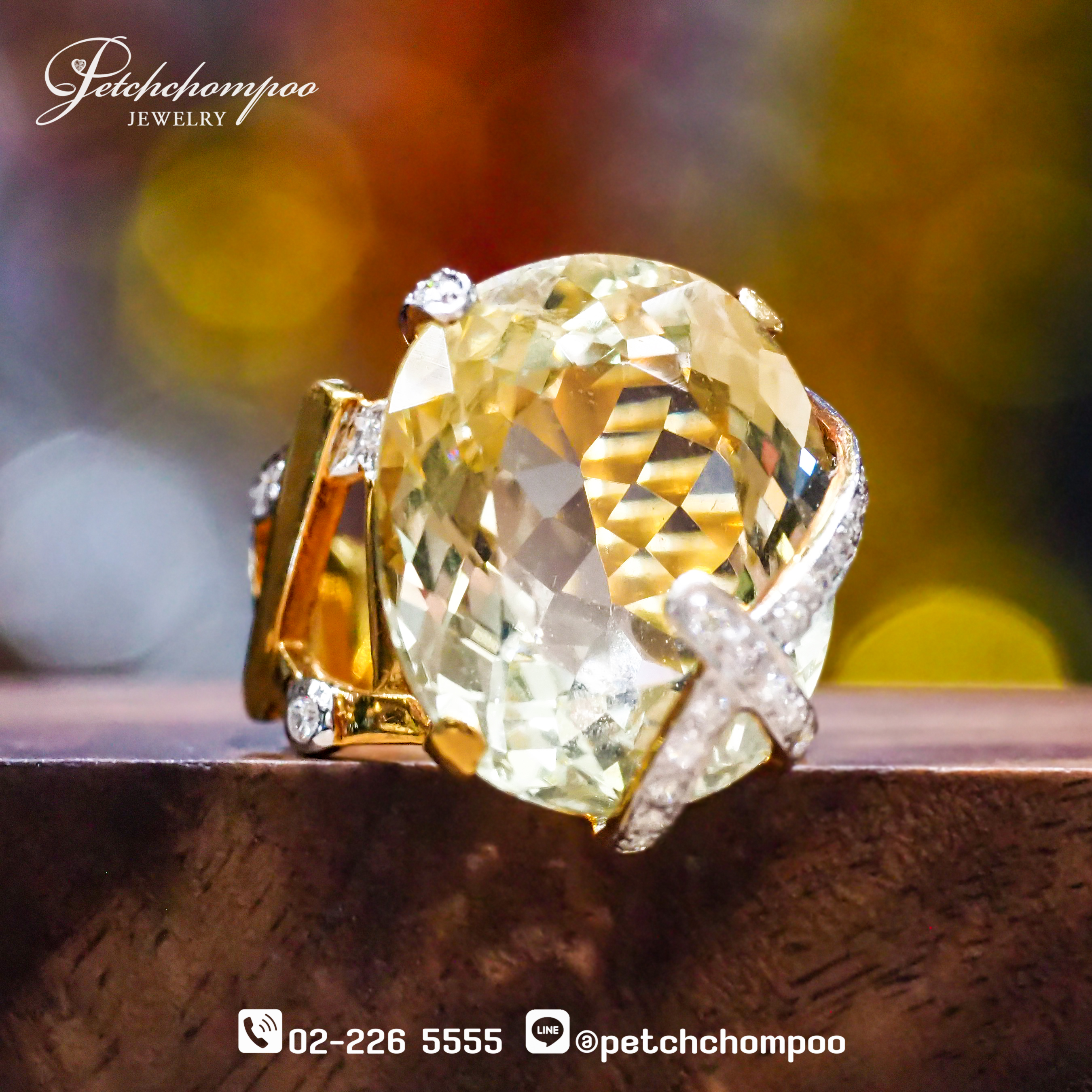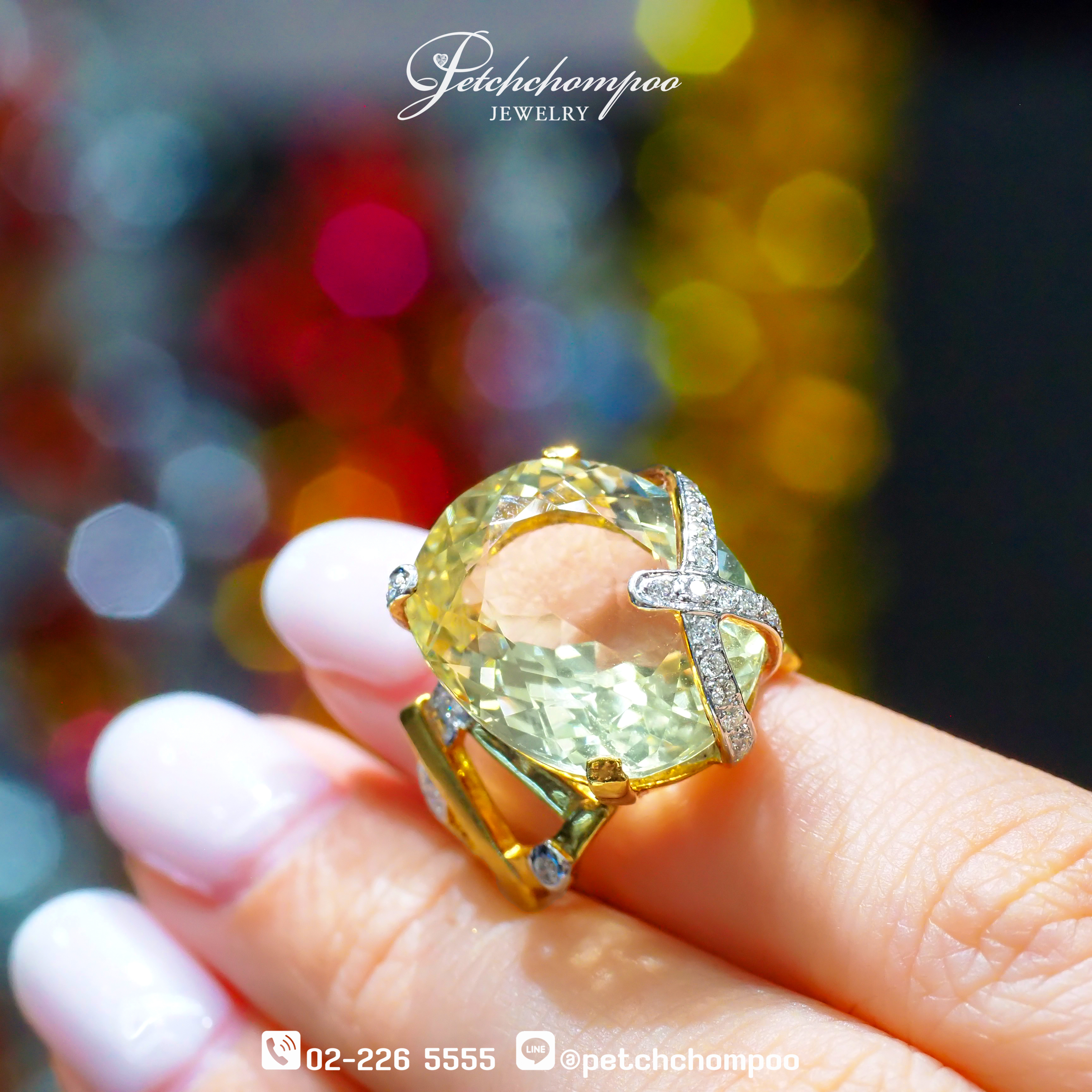 แหวนวงนี้โดดเด่นด้วย เลมอนด์ควอตซ์ (Lemon Quartz) เม็ดงามขนาดใหญ่ รูปทรงไข่ (Oval Cut) ที่เปล่งประกายสีเหลืองทองอร่ามตา ด้วยคุณภาพการเจียระไนที่ยอดเยี่ยม ทำให้อัญมณีมี "ไฟดีมาก" และเล่นแสงระยิบระยับดึงดูดทุกสายตา