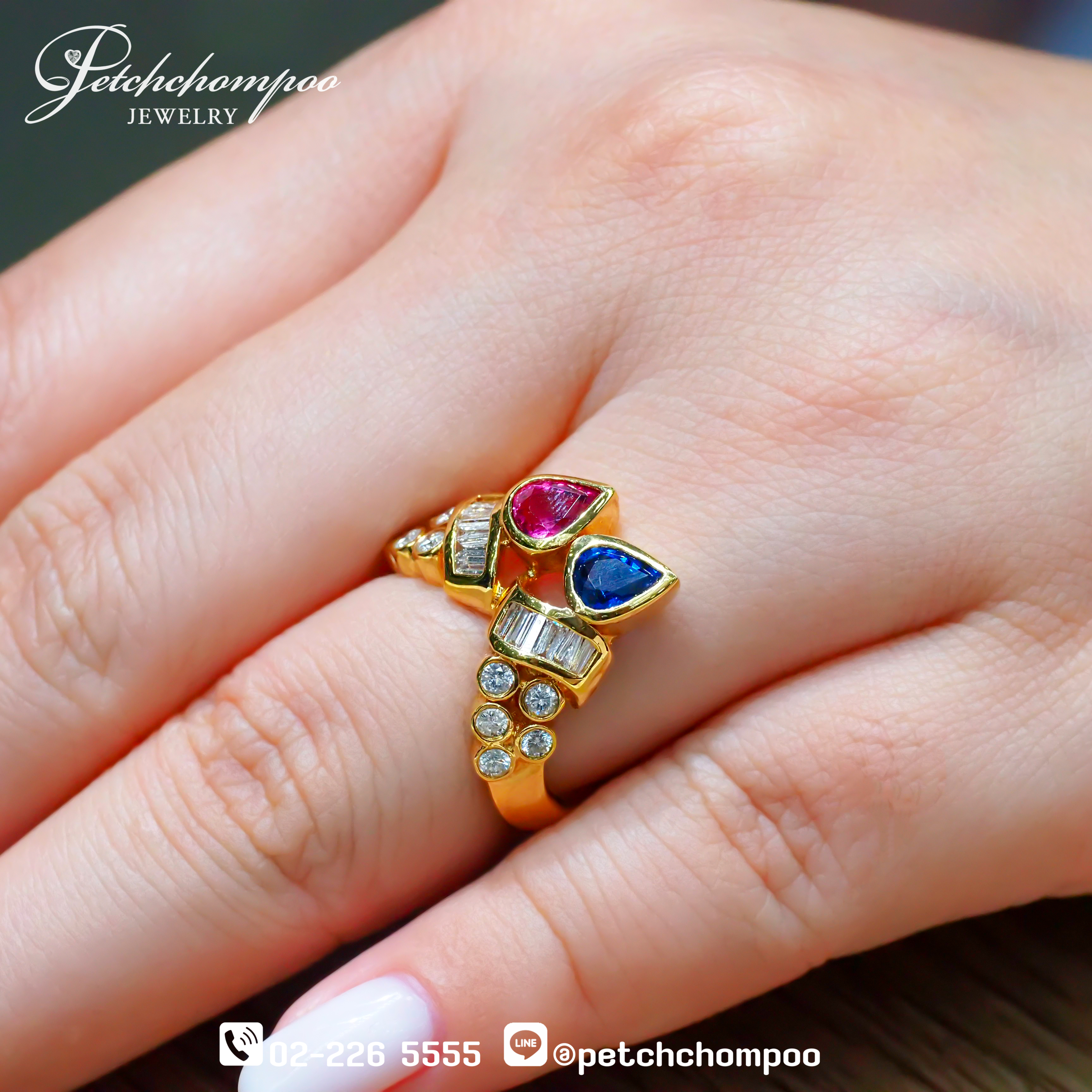 ดีไซน์สุดคลาสสิกที่รวมความร้อนแรงของทับทิมและความเยือกเย็นของไพลินในหนึ่งเดียว น้ำหนักรวม 0.52 กะรัต ประดับด้วยเพชรทรงบาแก็ตและเพชรกลมเจียระไน รวม 1.49 กะรัต ตัวเรือนทองคำ 18K น้ำหนัก 8.80 กรัม งดงามและเปี่ยมความหมายสำหรับผู้สวมใส่