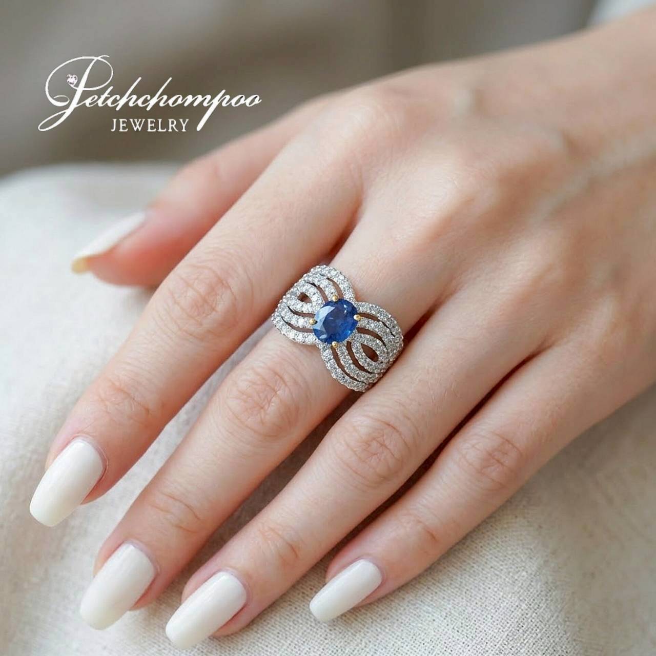 แหวน “Ocean Flame”™ โดดเด่นด้วยไพลินเม็ดกลางขนาด 1.78 กะรัต สีเข้มสดลึกดั่งท้องทะเลยามค่ำคืน เจียระไนทรงไข่เผยประกายสวยเฉพาะตัว โอบล้อมด้วยเส้นสายเพชรขาว 80 เม็ด น้ำหนักรวม 1.60 กะรัต บนดีไซน์ก้านแหวนที่พริ้วไหวดั่งเปลวไฟ ช่วยขับให้ไพลินยิ่งเปล่งประกาย ตัวเรือนทองคำ 18K หนัก 8.85 กรัม ผสมผสานอย่างลงตัวระหว่างพลังของอัญมณีกับความอ่อนช้อยของศิลปะ