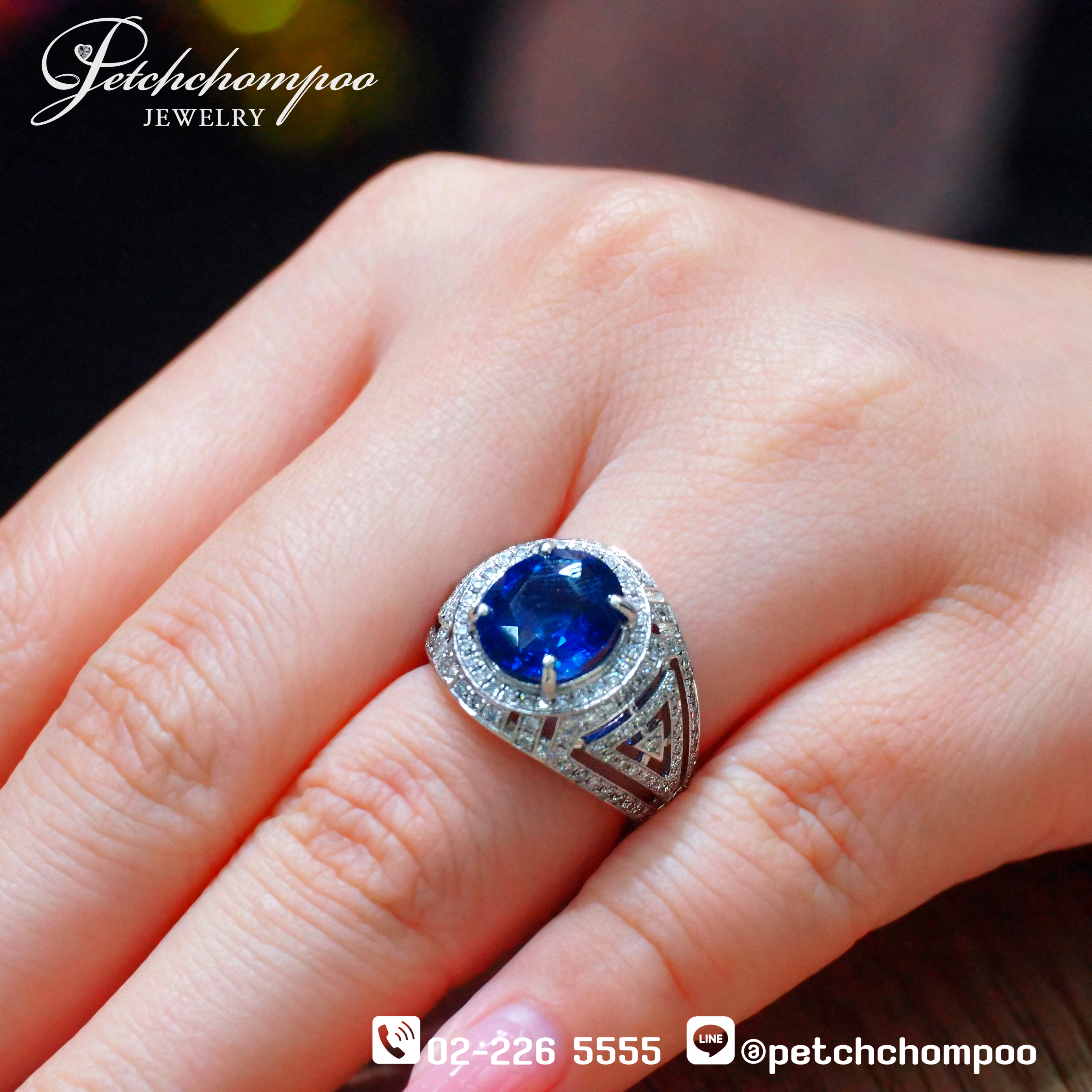สัมผัสความลึกล้ำของแสงแห่งฟากฟ้าในแหวน Celestial Blue Flame™ ด้วยไพลินซีลอนธรรมชาติทรงรีขนาด 5.13 กะรัต สีฟ้าเจิดจรัส โอบล้อมด้วยเพชรแท้ 1.00 กะรัต บนดีไซน์เรขาคณิตที่บรรจงร้อยเรียงอย่างประณีต ตัวเรือนทองคำขาวหนัก 8.35 กรัม ดีไซน์ทรงพลังแบบโมเดิร์น เสริมบุคลิกให้น่าค้นหา นำเสนอความงามร่วมสมัยที่กล้าสะกดทุกสายตา