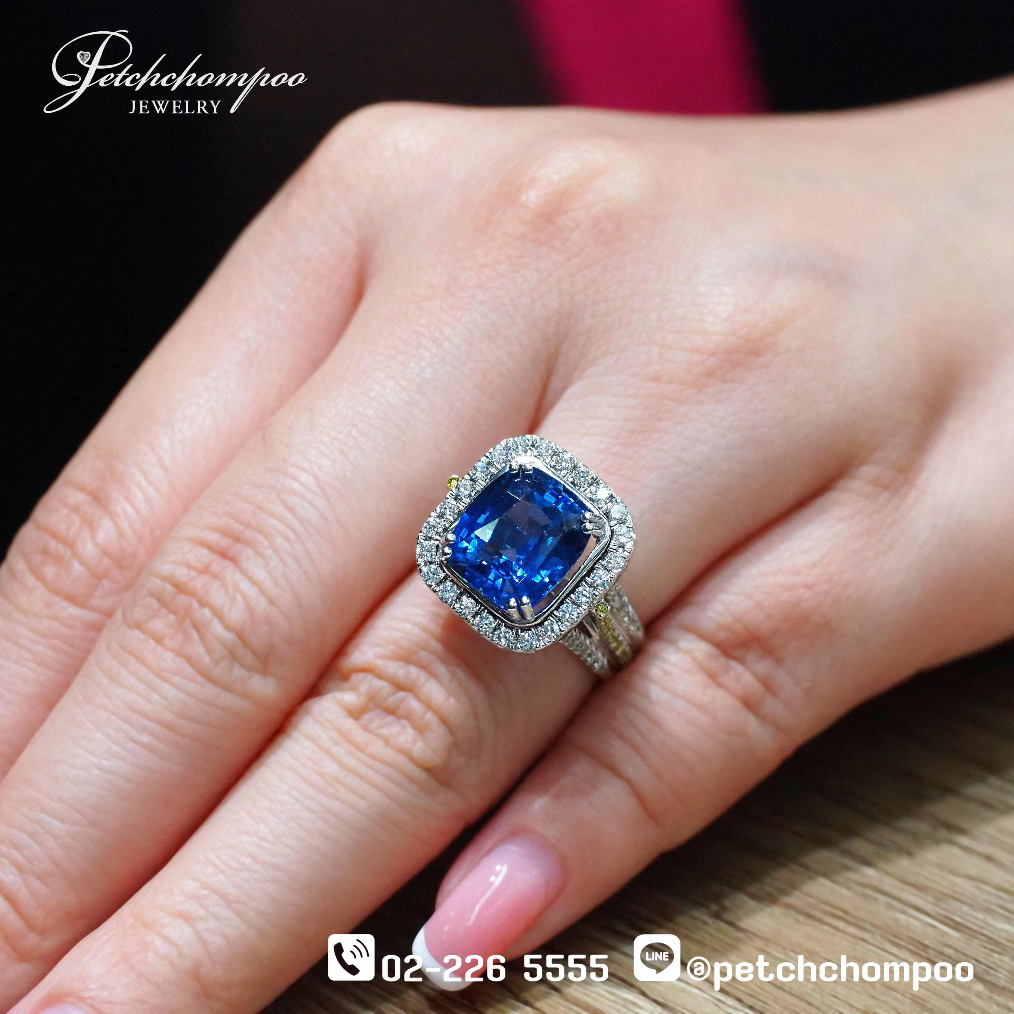 แหวน Royal Ceylon Bloom™ รังสรรค์จากไพลินซีลอนธรรมชาติ ขนาด 7.29 กะรัต สีน้ำเงินสดล้ำลึกเจียระไนเหลี่ยม Cushion ขับประกายหรูทุกมิติ ล้อมด้วยเพชรแท้น้ำงาม 1.50 กะรัต ดีไซน์ Halo สองชั้นและเพชรแถวบนตัวเรือน เสริมให้ตัวเรือนทองคำ 18K น้ำหนัก 10.97 กรัม งดงามหรูหราไม่ธรรมดา