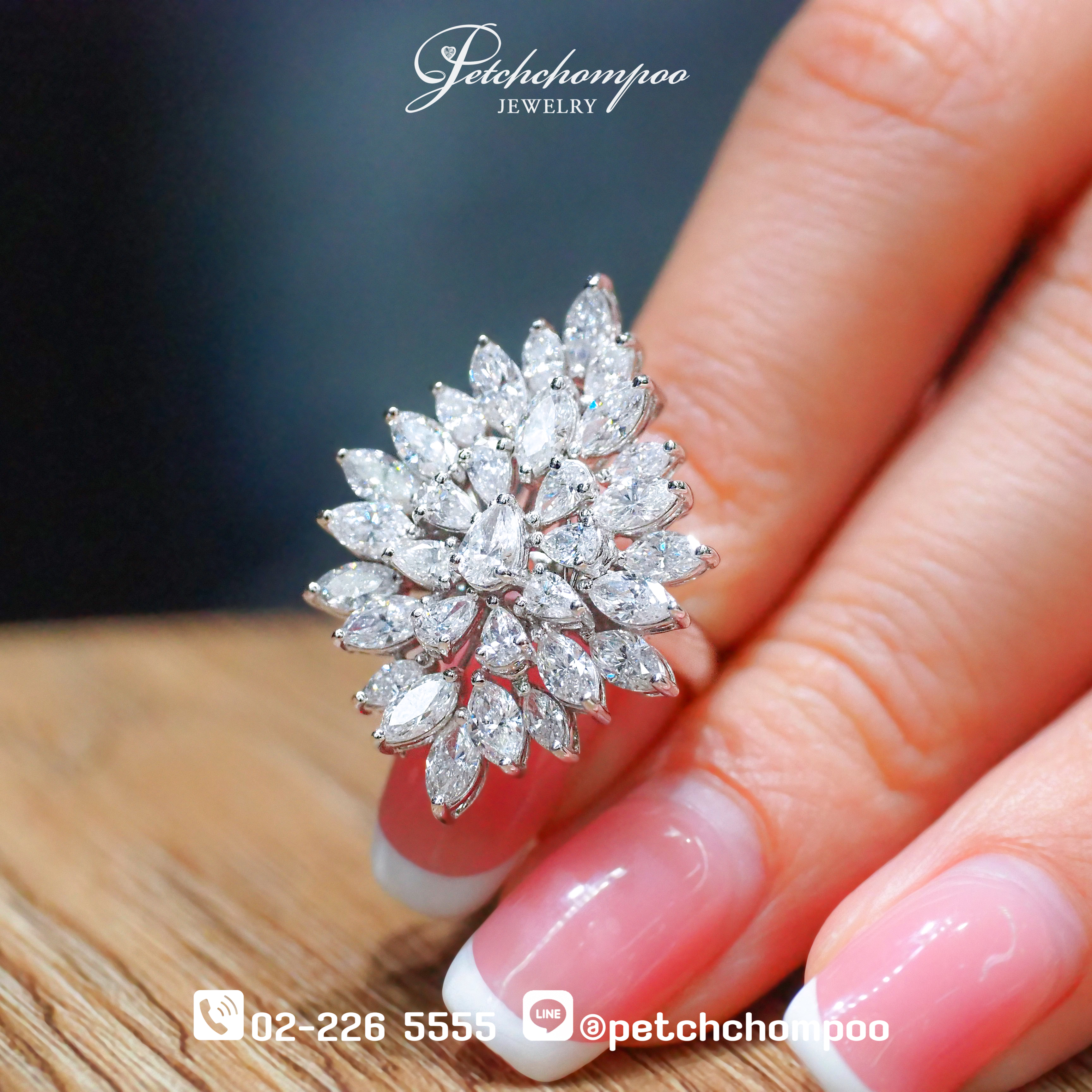 แหวนเพชรดีไซน์หรูหราอลังการ รังสรรค์ในรูปทรงกลีบดอกไม้ซ้อนชั้น โดยประดับด้วยเพชรแท้ทรงมาคีร์ 23 เม็ด รวม 2.96 กะรัต และเพชรหยดน้ำอีก 9 เม็ด น้ำหนักรวม 0.86 กะรัต ตัวเรือนทองคำขาว 9.80 กรัม ที่โอบล้อมลวดลายอย่างวิจิตรตระการตา มอบประกายระยิบระยับทุกมุมมอง เป็นแหวน Statement ที่จะเติมเต็มลุคของคุณให้เจิดจรัสในทุกโอกาส