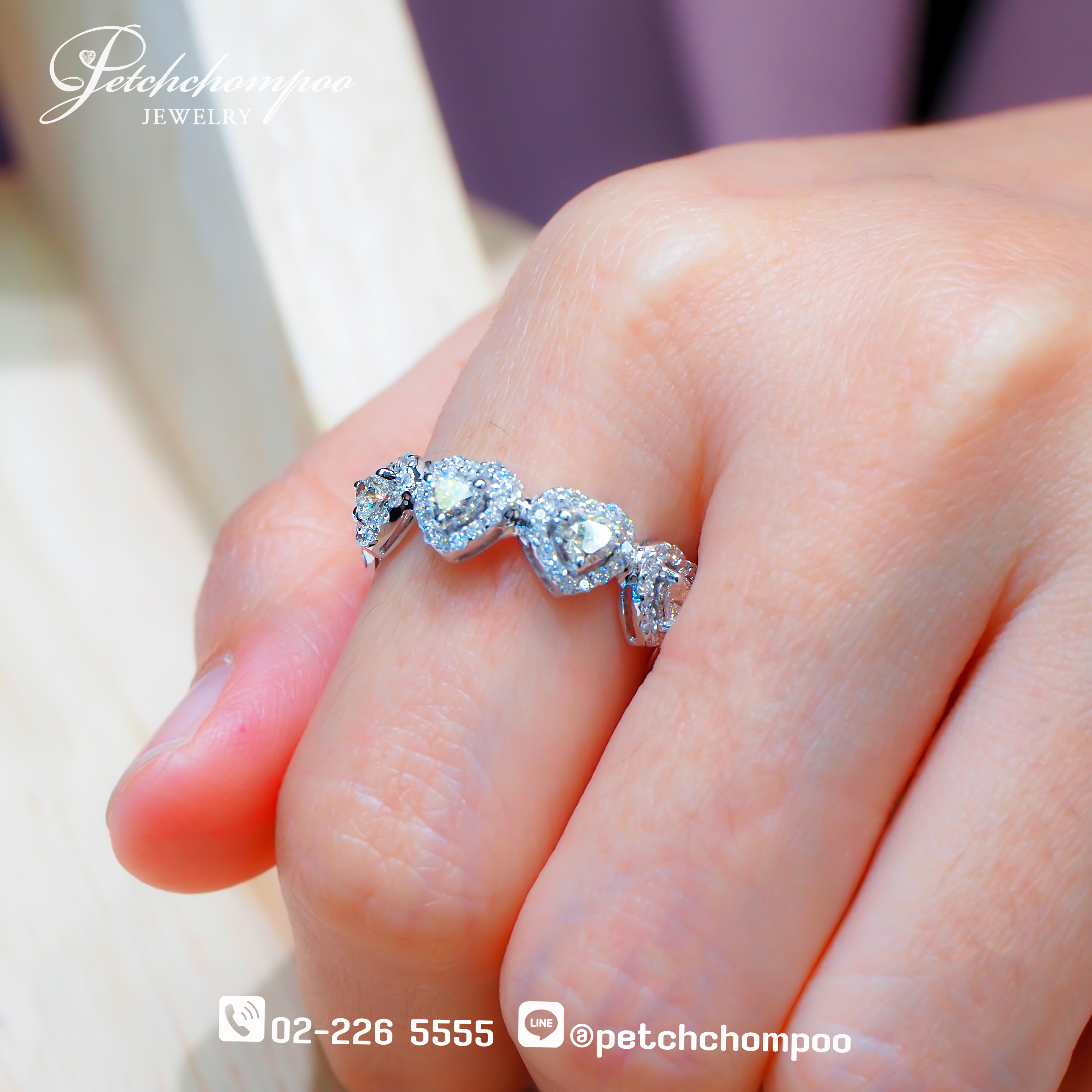 แหวนเพชรดีไซน์โรแมนติกที่โดดเด่นด้วย เพชรรูปหัวใจ (Heart Shape Diamonds) เรียงต่อกันอย่างประณีตรอบวง เปรียบเสมือนสัญลักษณ์แห่งความรักที่ต่อเนื่องไม่รู้จบ แต่ละหัวใจถูกโอบล้อมด้วยเพชรเม็ดเล็กแบบ Halo Setting ช่วยเพิ่มประกายระยิบระยับและสร้างมิติของแสงที่งดงามในทุกมุมมอง ตัวเรือนทองคำขาว 18K ถูกออกแบบให้โอบรับเพชรอย่างประณีต พร้อมเส้นสายที่อ่อนช้อยและสมดุล ทำให้แหวนวงนี้เปล่งประกายอย่างโดดเด่นบนเรียวนิ้ว สะท้อนความอ่อนหวาน หรูหรา และความโรแมนติกเหนือกาลเวลา เหมาะอย่างยิ่งสำหรับผู้หญิงที่ต้องการเครื่องประดับที่สื่อถึงความรัก ความทรงจำ และความงดงามที่ไม่มีวันจางหาย