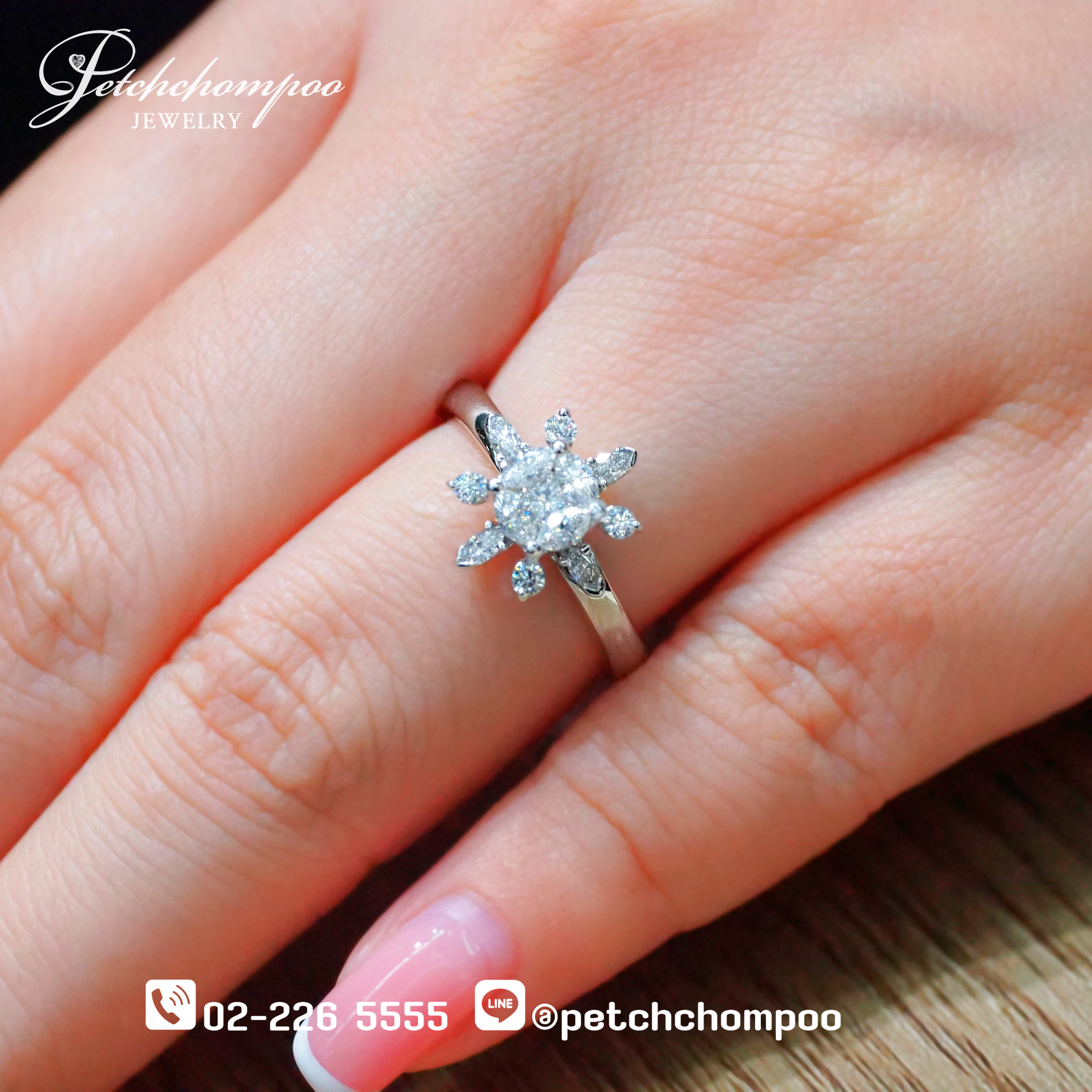 แหวนเพชร Eternal Bloom™ ถ่ายทอดแรงบันดาลใจจากกลีบดอกไม้ที่เบ่งบานงดงาม ด้วยดีไซน์การจัดวางเพชรทรงมาร์คีส์และเพชรกลมจำนวนรวม 13 เม็ด ล้อมรอบเพชรประกบขนาด 1 กะรัต สร้างลวดลายดอกไม้ที่เปล่งประกายระยิบระยับจากทุกองศา ตัวเรือนทองคำขาว 18K น้ำหนัก 4.99 กรัม โดดเด่นและสง่างาม เหมาะกับทุกโอกาสพิเศษในชีวิต