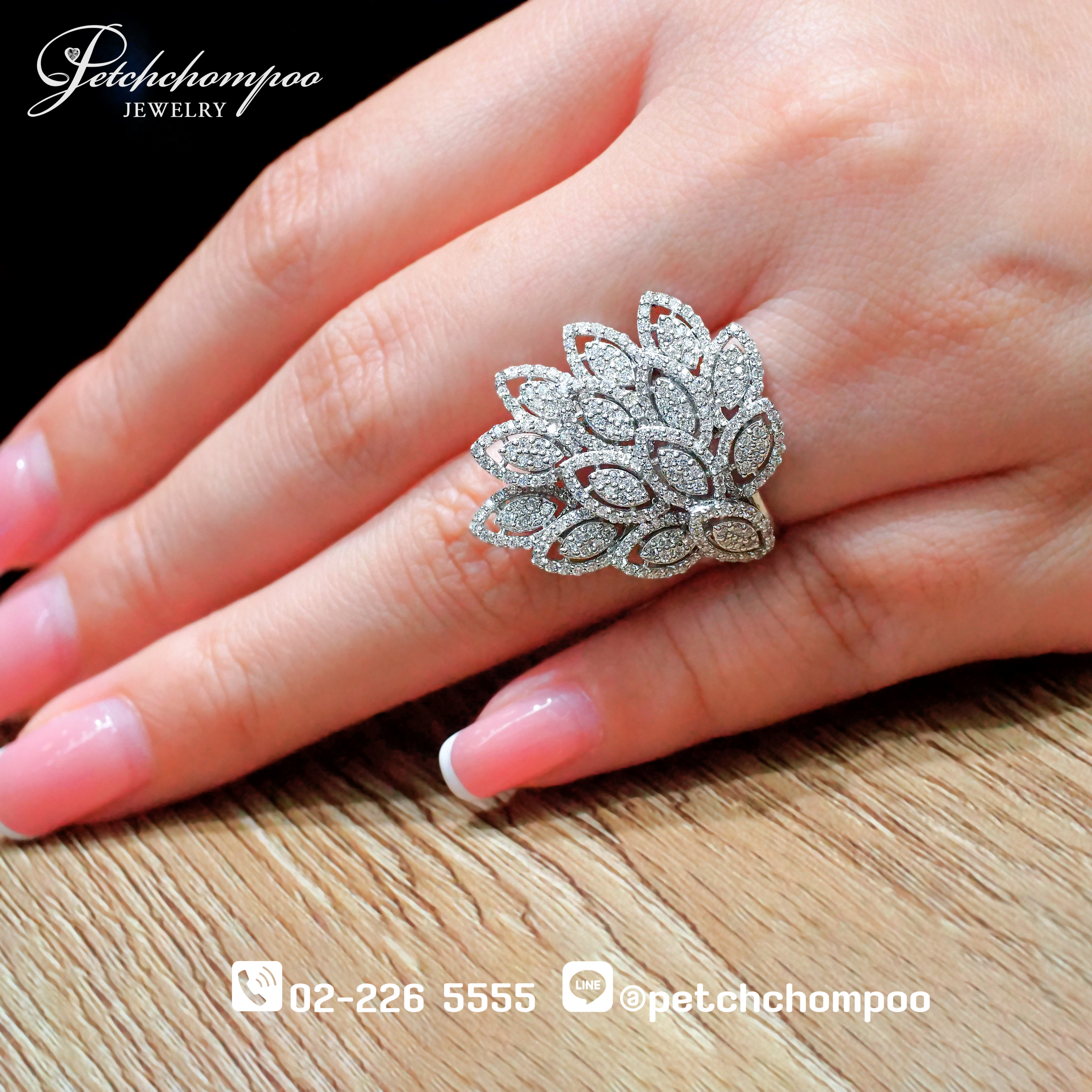 แหวนดีไซน์พิเศษที่โดดเด่นด้วยโครงสร้างกลีบซ้อนทับอย่างอ่อนช้อย แรงบันดาลใจจากกลีบดอกไม้และพลังแห่งมงกุฎกษัตริย์ ประดับเพชรแท้ทั้งวงกว่า 2 กะรัต เจียระไนทรงกลมเรียงซ้อนในแพตเทิร์นที่เปล่งประกายวิบวับไม่รู้จบ ตัวเรือนทองคำขาว 18K ขัดเงาอย่างประณีต เสริมให้แหวนวงนี้สง่างามไม่เหมือนใคร