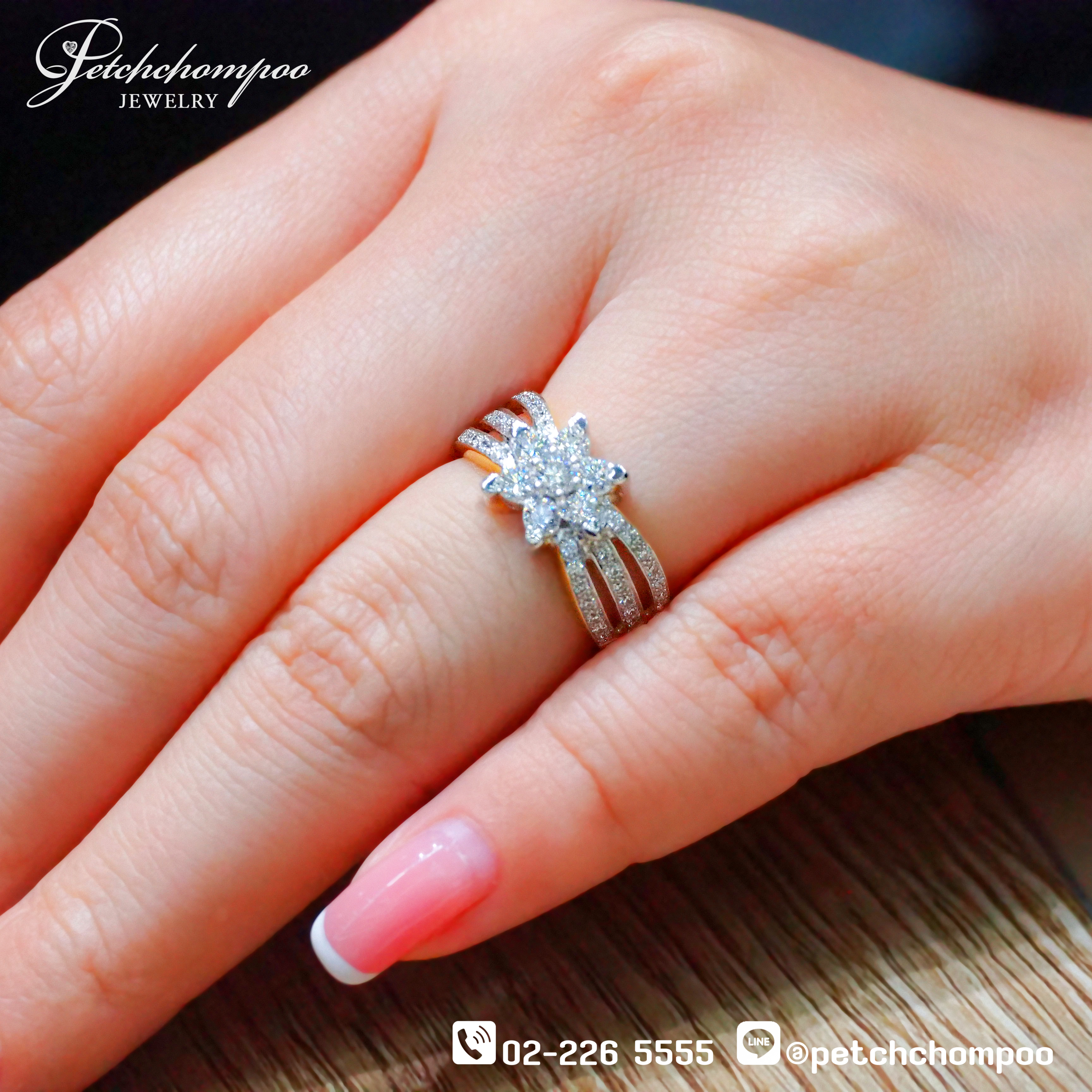 แหวนเพชรลายดอกไม้ดีไซน์หรู ประกอบด้วยเพชรเม็ดหลัก 7 เม็ดเรียงร้อยอย่างกลมกลืนเป็นรูปดอกไม้ พร้อมด้วยเพชรล้อมอีก 40 เม็ด เสริมประกายวิบวับรอบวง น้ำหนักเพชรรวม 1.25 กะรัต (47 เม็ด) ฝังบนตัวเรือนทองคำขาวน้ำหนัก 5.53 กรัม ได้รับการรับรองคุณภาพจากสถาบัน GCI เป็นแหวนที่เหมาะสำหรับหญิงสาวผู้เปล่งประกายจากภายใน