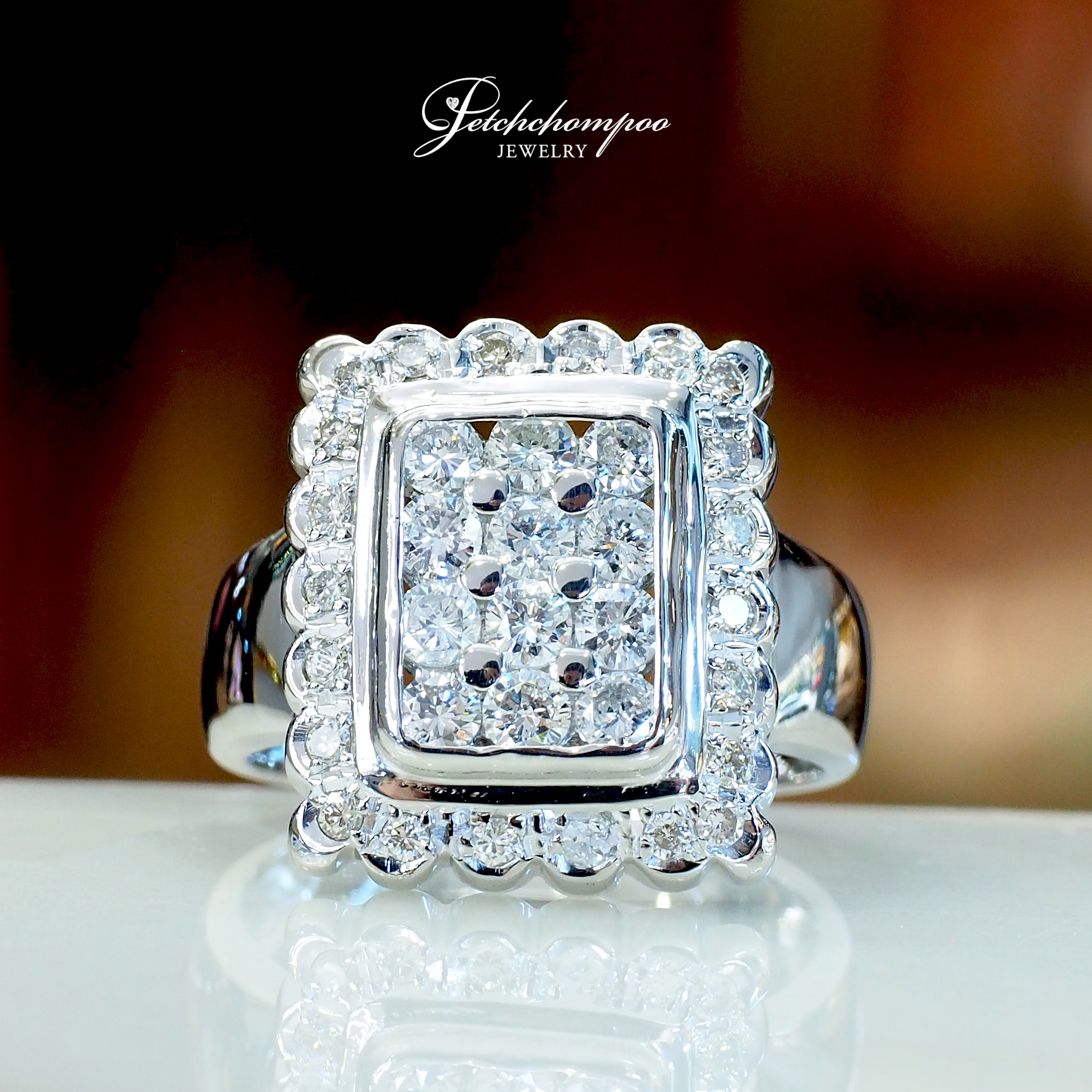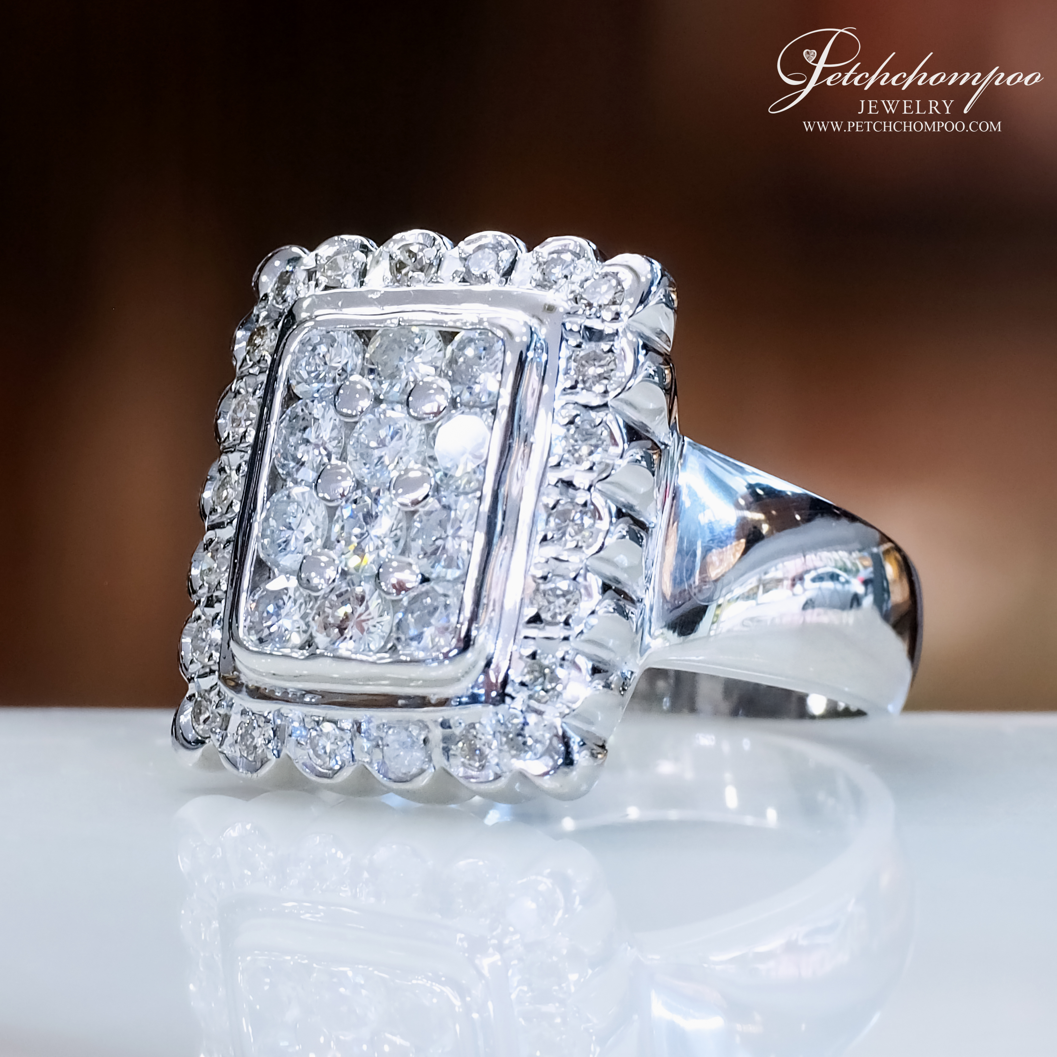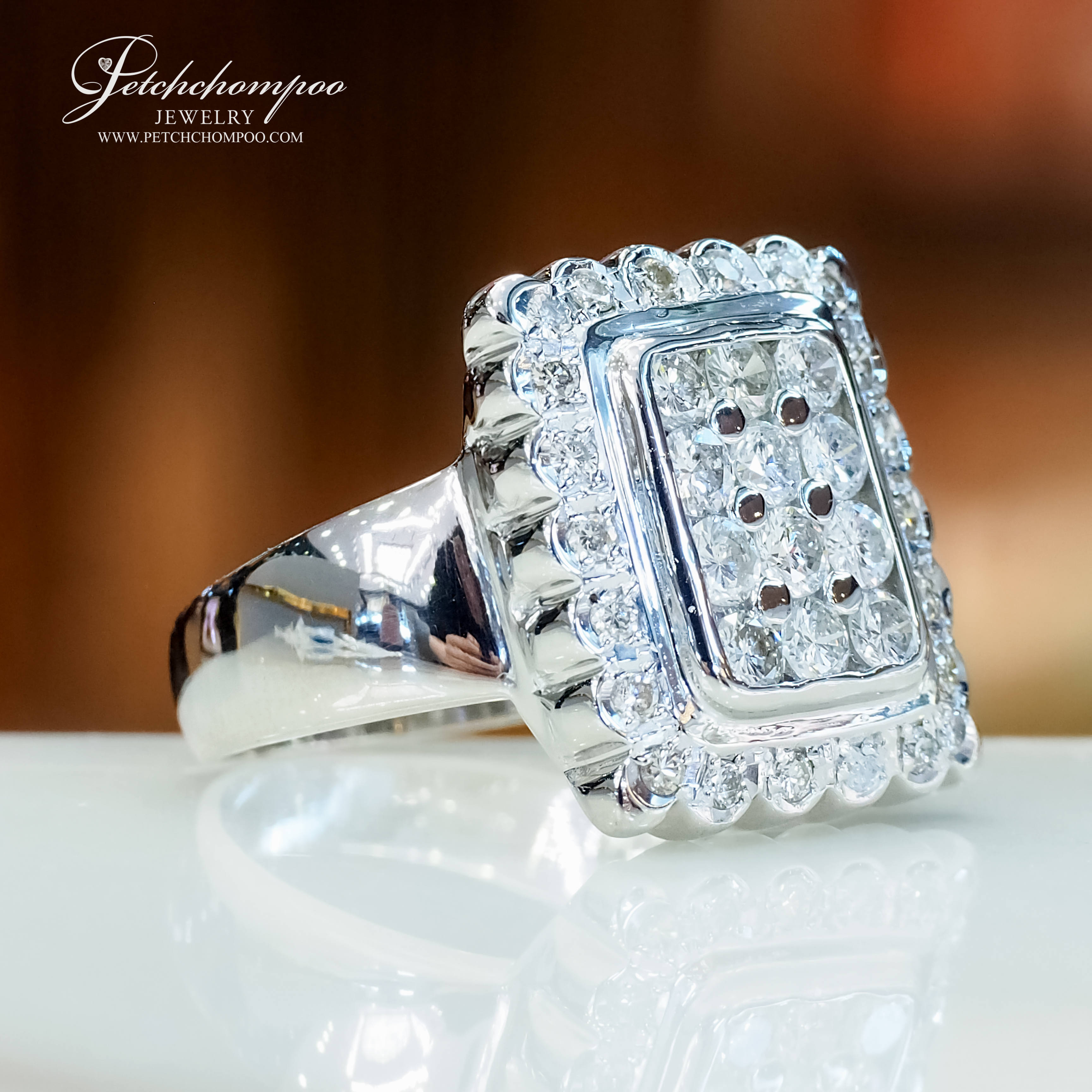 แหวนเพชรสำหรับสุภาพบุรุษ ดีไซน์หน้ากว้างทรงสี่เหลี่ยม โดดเด่นด้วยเพชรแท้รวม 34 เม็ด น้ำหนักรวม 1.23 กะรัต ฝังเต็มหน้าอย่างวิจิตรในกรอบซ้อน พร้อมล้อมด้วยขอบเพชรระยิบระยับ สื่อถึงพลัง ความสำเร็จ และรสนิยมเหนือระดับ ตัวเรือนทองคำขาวหนักแน่น 12.15 กรัม เพิ่มมิติให้กับลุคผู้ชายที่มั่นใจและมีสไตล์
