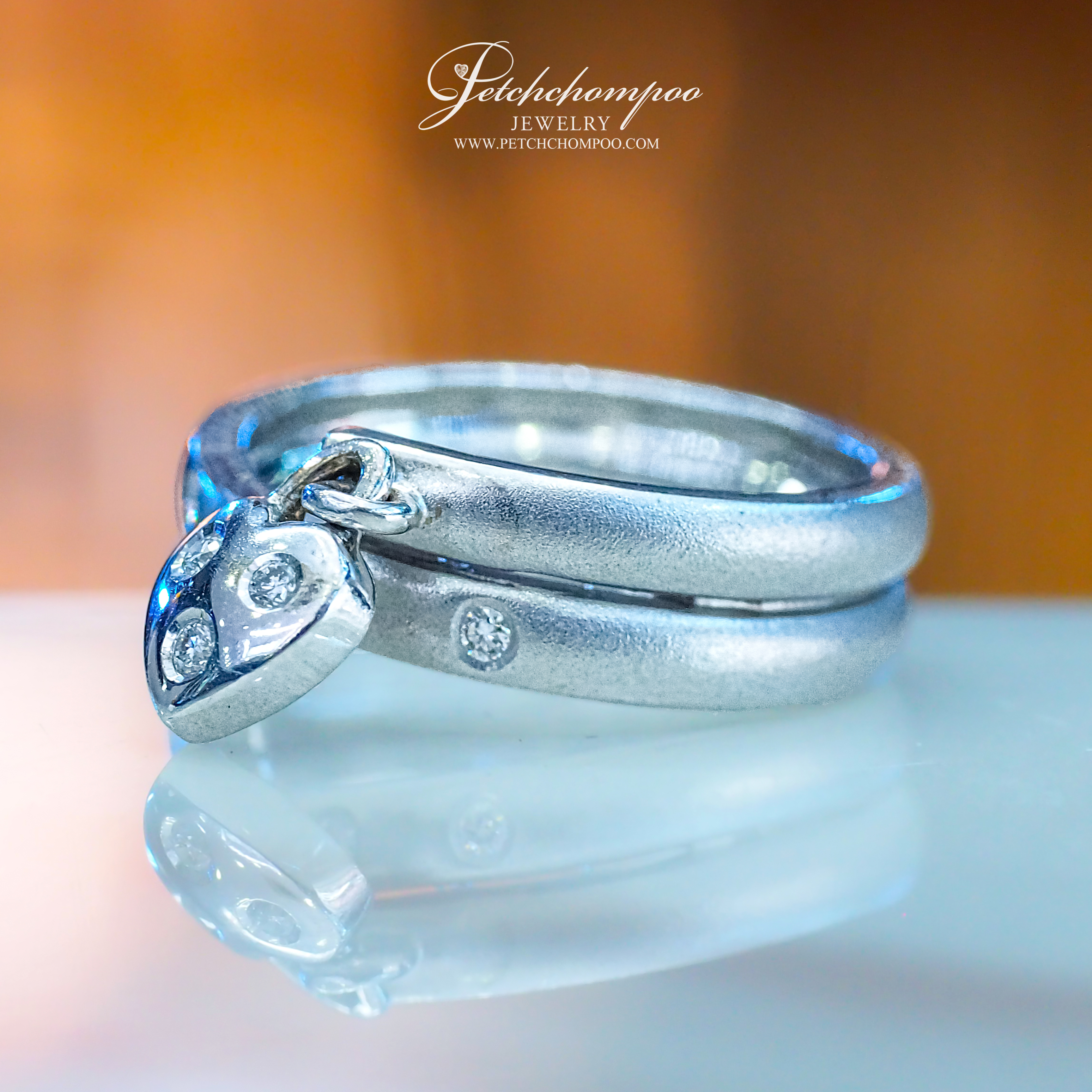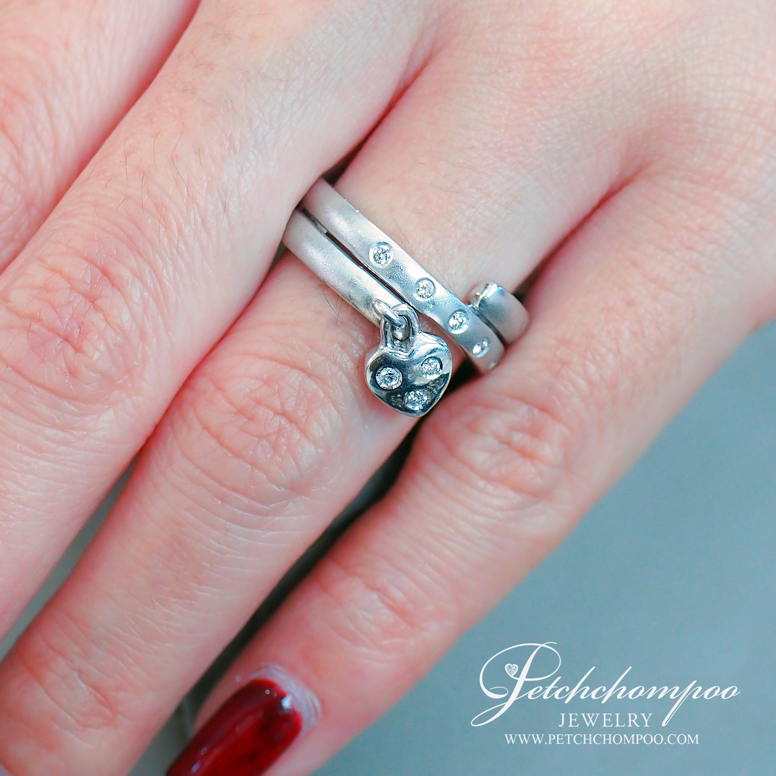 แหวนทองคำขาวดีไซน์เก๋ไม่เหมือนใคร ด้วยดีไซน์สองเส้นโค้งขนานกันอย่างมีจังหวะ เติมลูกเล่นด้วยจี้หัวใจฝังเพชรที่แกว่งอิสระ เสริมความน่ารักและหรูหราไปพร้อมกัน ฝังเพชรเม็ดเล็ก 8 เม็ด (รวม 0.15 กะรัต) สะท้อนแสงระยิบระยับทุกมุมมอง เหมาะสำหรับผู้หญิงที่มีสไตล์หวานซ่อนเท่ หรือมอบเป็นของขวัญที่สื่อถึงความรักและการ ‘ล็อกหัวใจ’