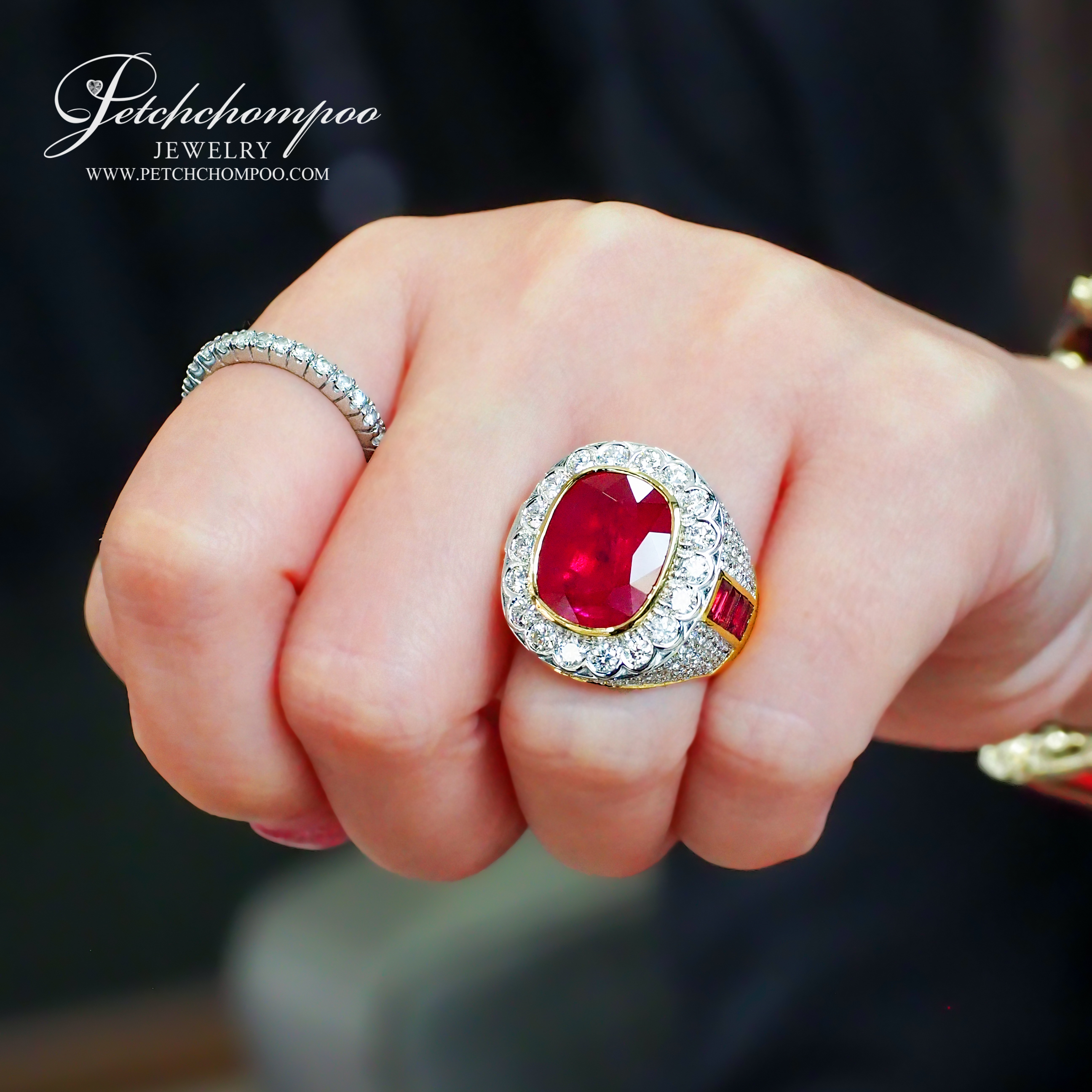 แหวนทับทิมพม่าธรรมชาติเม็ดใหญ่ ขนาด 7.24 กะรัต สีแดงสดแน่นลึกสไตล์พม่าแท้ โอบล้อมด้วยเพชรกลมเจียระไนยอดเยี่ยม 2.50 กะรัต (จำนวน 136 เม็ด) เพิ่มประกายและมิติบนตัวเรือนทองคำ 18K น้ำหนัก 13.07 กรัม ดีไซน์สั่งทำพิเศษโดยเฉพาะสำหรับสุภาพบุรุษหรือผู้ที่ชื่นชอบงานแฟชั่นทรงพลัง พร้อมใบรับรองจาก Emil Laboratory เพื่อความมั่นใจในคุณภาพ