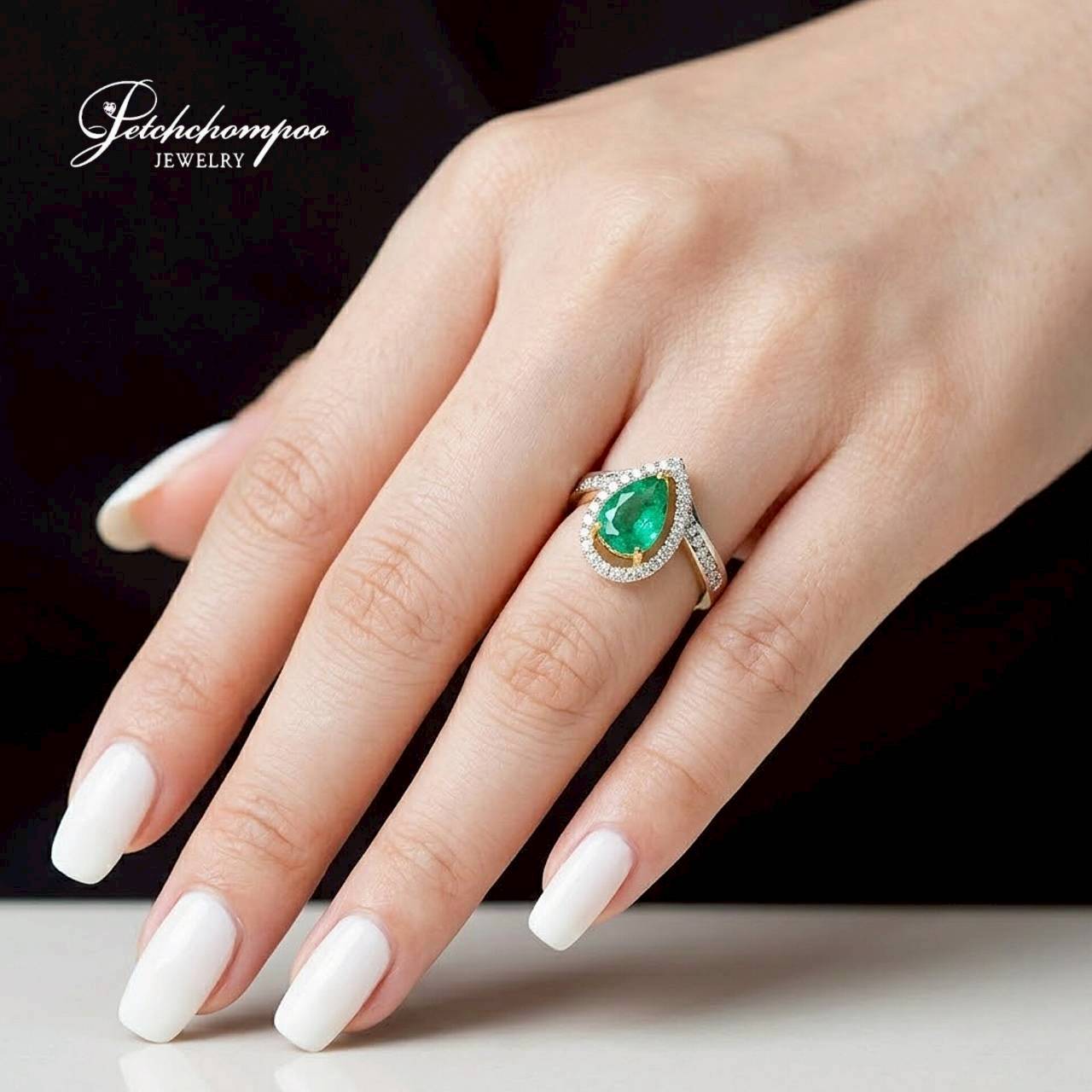 แหวนมรกตโคลอมเบียทรงหยดน้ำ Emerald Teardrop Halo™ 1.58 กะรัต