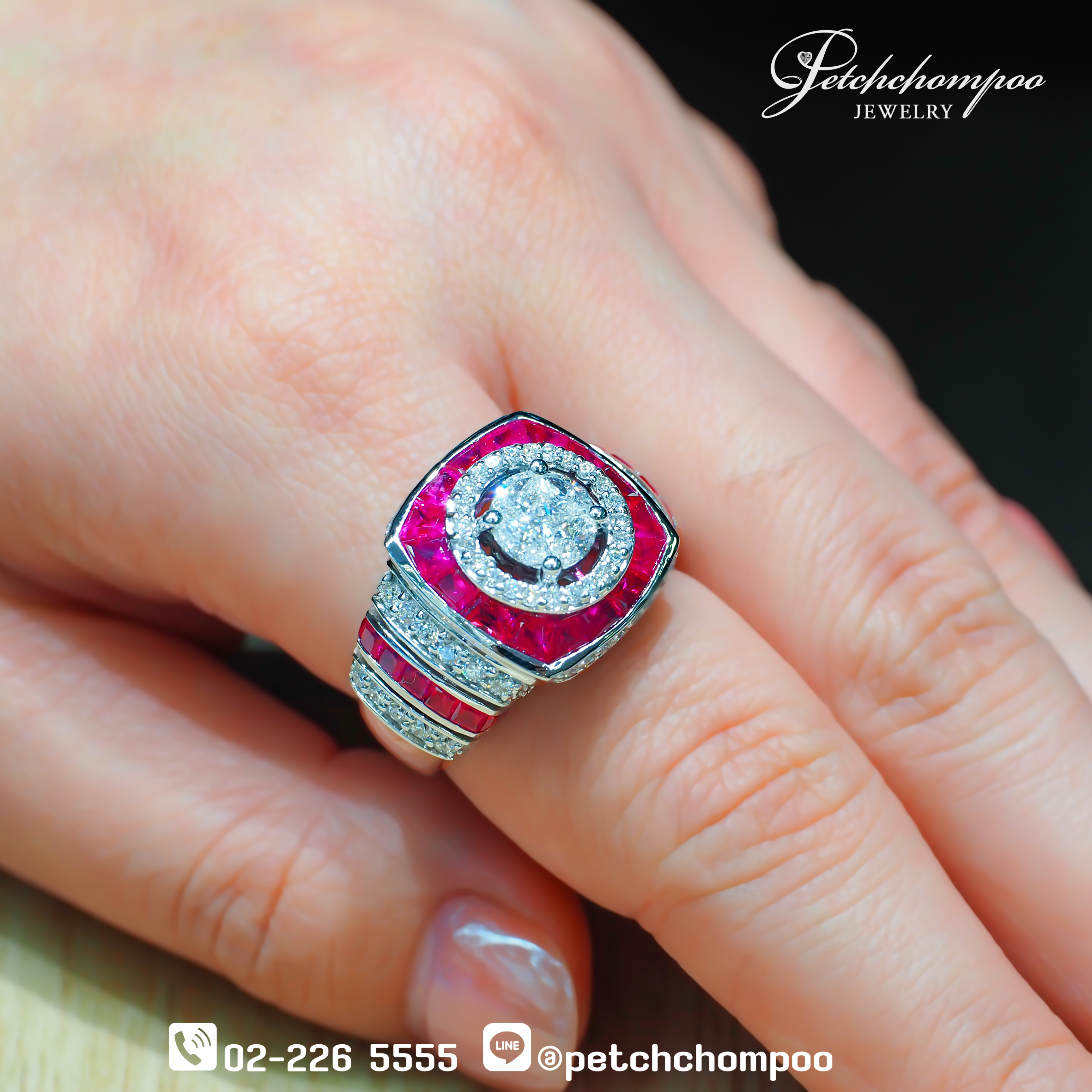 แหวน Royal Crimson Glow™ โดดเด่นด้วยทับทิมพม่าคุณภาพสูง 30 เม็ด น้ำหนักรวม 1.00 กะรัต สีแดงเข้มร้อนแรงดุจเปลวไฟ โอบล้อมรอบเพชรเจิดจรัส 91 เม็ด น้ำหนักรวม 1.16 กะรัต ตัวเรือนทองคำขาว 18K หนัก 14.32 กรัม ดีไซน์ทรงพลังและหรูหรานี้สะท้อนถึงรสนิยมเหนือระดับ และความมั่นใจในทุกโอกาส