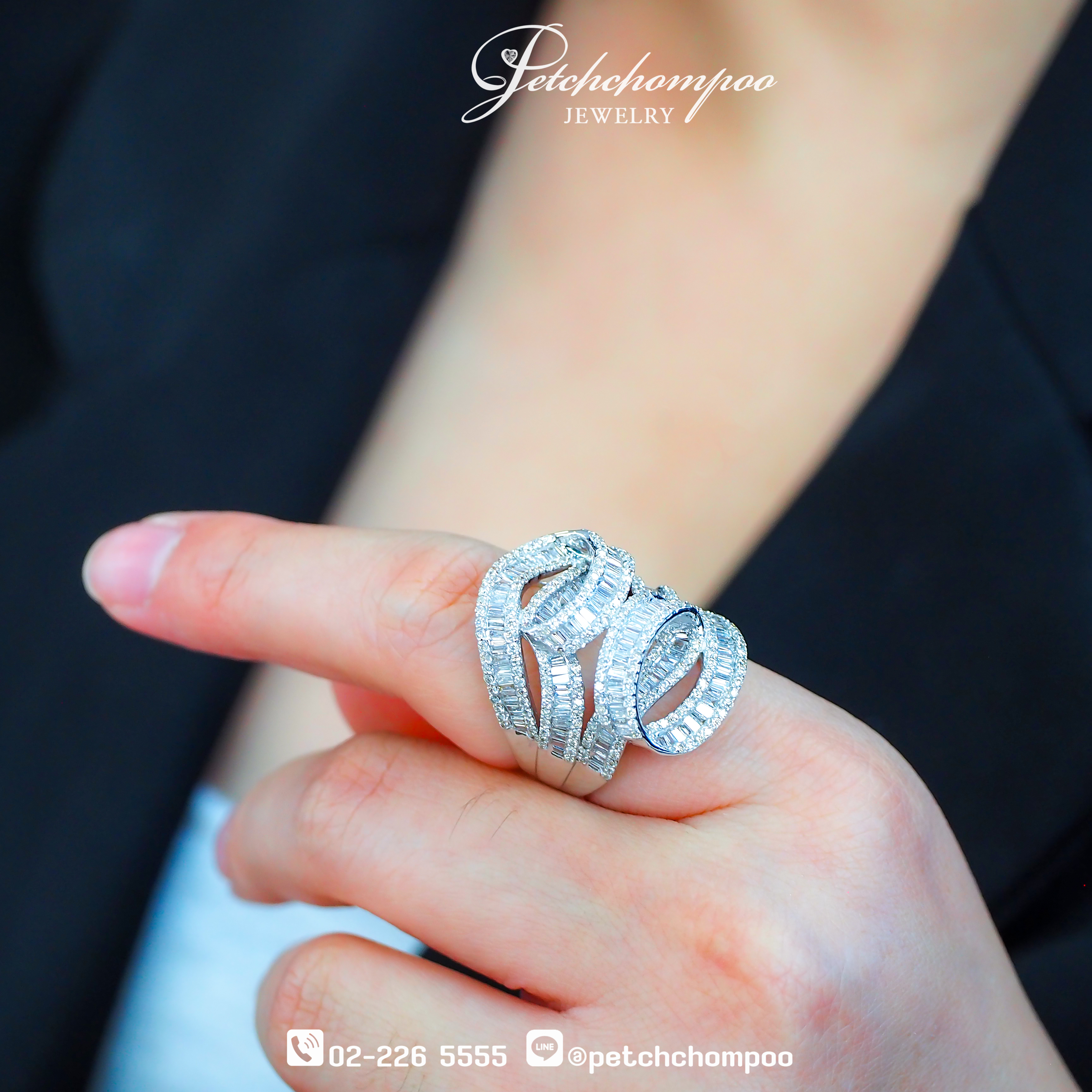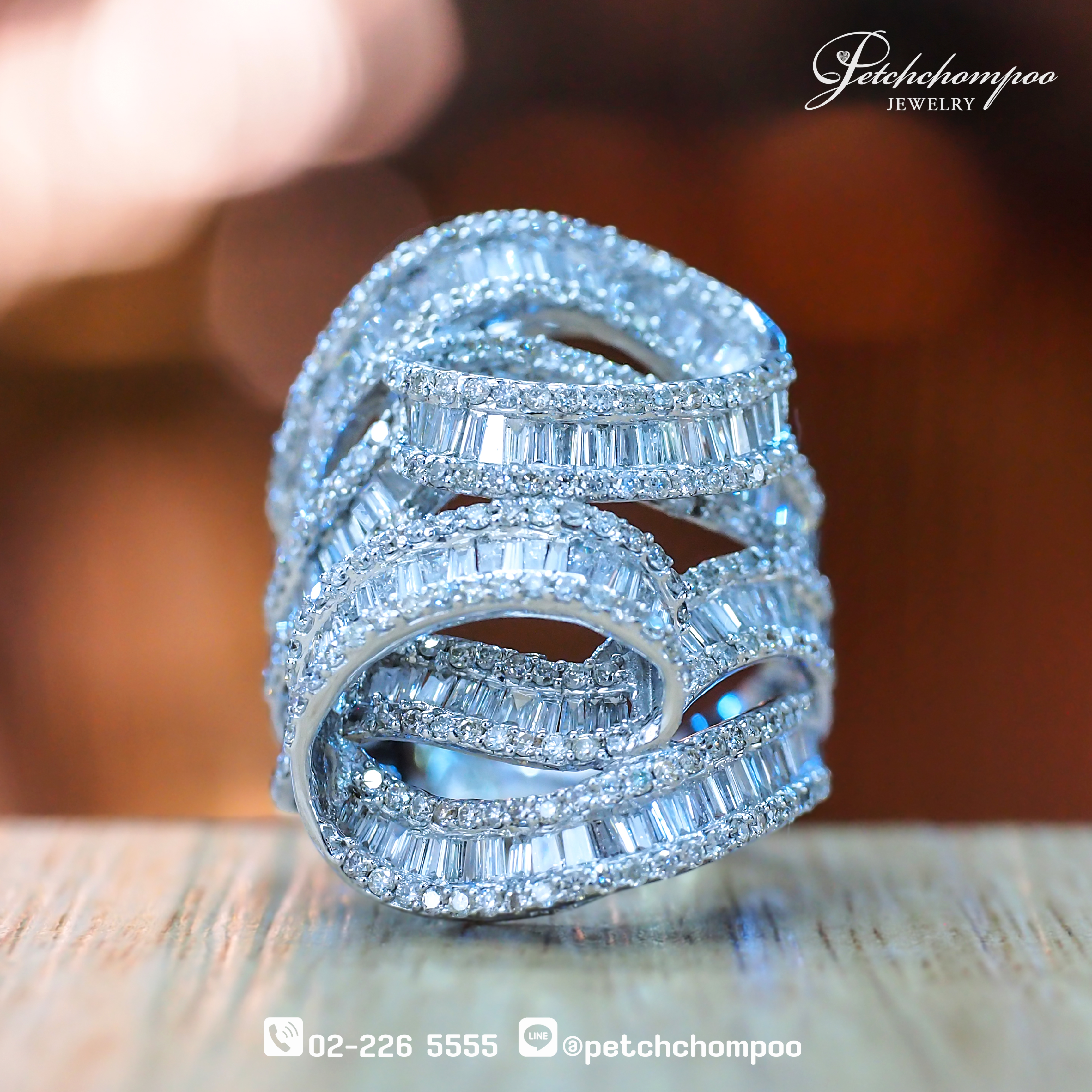 แหวนดีไซน์ลายคลื่นอันเป็นเอกลักษณ์ ที่เล่นมิติสลับระดับอย่างประณีต ตัวเรือนทอง 11.58 กรัม โดดเด่นด้วยประกายของเพชรบาแก็ตต์เรียงตัวแบบแน่นเต็มพื้นที่ ผสานเพชรกลมเม็ดเล็กประดับขอบอย่างวิจิตร รวมเพชรทั้งสิ้น 4.29 กะรัต ช่วยสะท้อนแสงระยิบระยับในทุกมุมมอง ดีไซน์โค้งเว้าแบบ Fluid Wave ให้ความรู้สึกเคลื่อนไหวอ่อนช้อย แต่แฝงความหรูสง่าของงาน High Jewelry ที่ละเอียดทุกองศา เหมาะสำหรับผู้ที่ชื่นชอบชิ้นงานที่ “สวยพิเศษ” และโดดเด่นไม่เหมือนใคร
