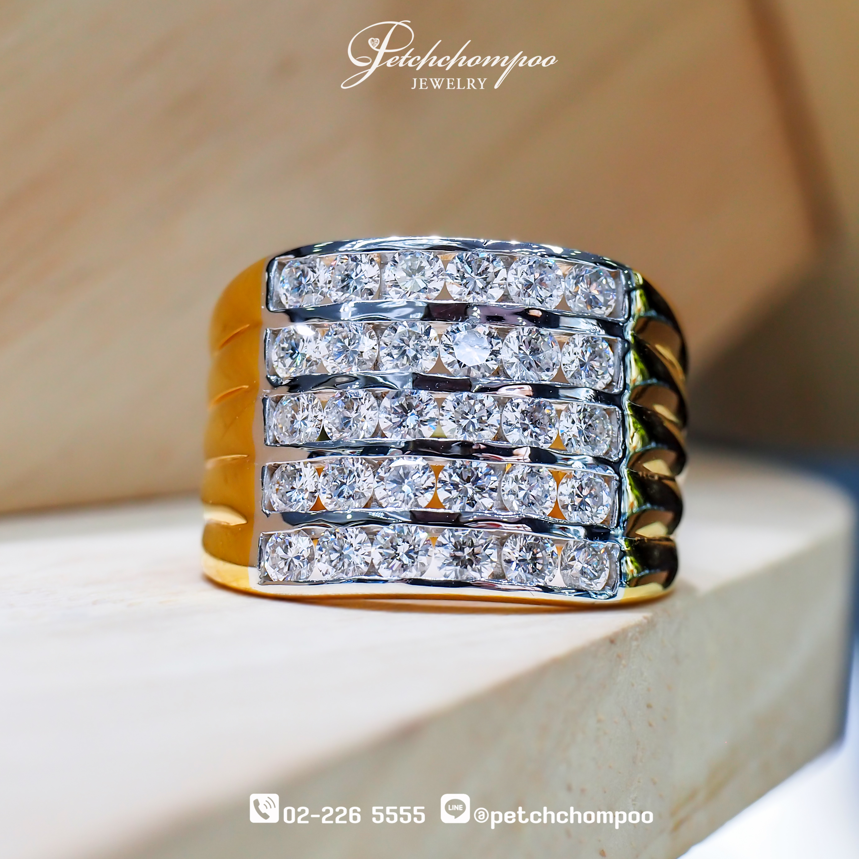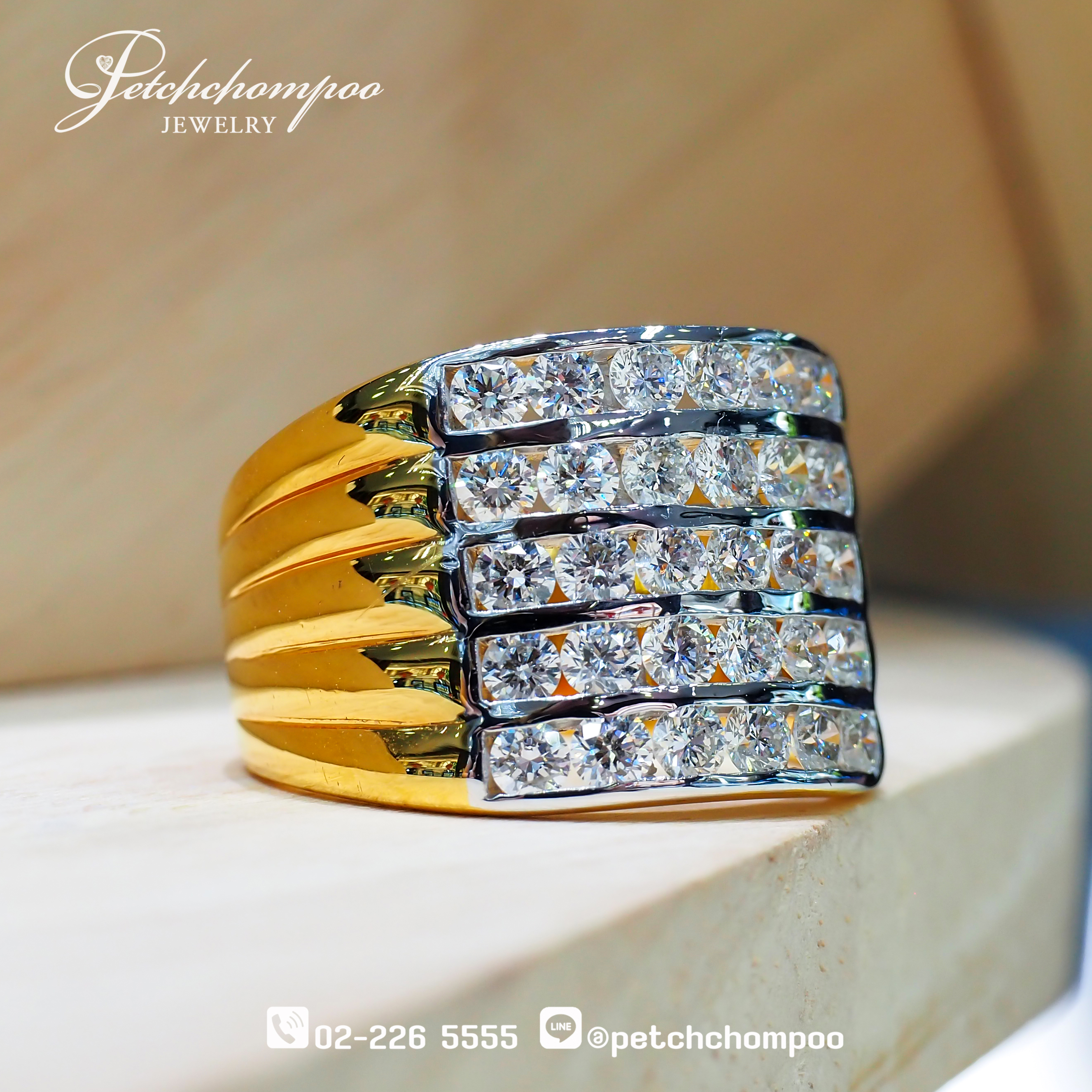 แหวนเพชรดีไซน์ Eternal Multi-Line Diamond Band ที่สะท้อนความหรูหราและพลังของประกายเพชรผ่านการเรียงตัวอย่างสมมาตร เพชร Round Brilliant Cut จำนวน 30 เม็ด น้ำหนักรวม 2.10 กะรัต ถูกจัดวางเรียงเป็นหลายแถวอย่างประณีต ⇒ สร้างเส้นประกายแสงที่ต่อเนื่องและโดดเด่นทั่วทั้งหน้าตัวแหวน การจัดวางแบบ Channel Setting ► ทำให้เพชรเรียงตัวอย่างแนบเนียน เพิ่มความเงางามและช่วยปกป้องตัวเพชรอย่างมั่นคง โครงสร้างตัวเรือนดีไซน์แบบ Bold Statement Band ⇔ เสริมความสง่างามและให้ภาพลักษณ์ที่ทรงพลัง ด้านข้างของตัวเรือนออกแบบเป็นเส้นโค้งของทองคำที่เรียงเป็นชั้น เพิ่มมิติของแสงและความหรูหราในทุกมุมมอง ตัวเรือนทองคำ น้ำหนัก 10.03 กรัม ให้ความรู้สึกแข็งแรง มั่นคง และโดดเด่น เหมาะสำหรับผู้ที่ต้องการเครื่องประดับที่สะท้อนสไตล์อันทรงพลัง