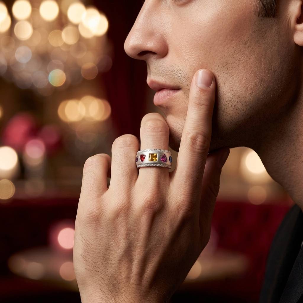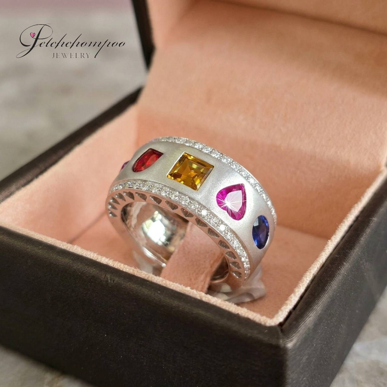 แหวนดีไซน์ Modern Luxury ที่โดดเด่นด้วยการผสมผสาน พลอยหลากสี (Multi-Color Gemstones) ในรูปทรงต่างๆ ทั้งทรงหัวใจ สี่เหลี่ยม และวงรี สื่อถึงความหลากหลายของอารมณ์และตัวตน ตัวเรือนทองคำขาวผิว Satin Finish ให้สัมผัสเรียบหรูแบบร่วมสมัย ตัดกับแถวเพชรที่ประดับด้านบนและด้านล่าง เพิ่มประกายระยิบระยับอย่างมีระดับ