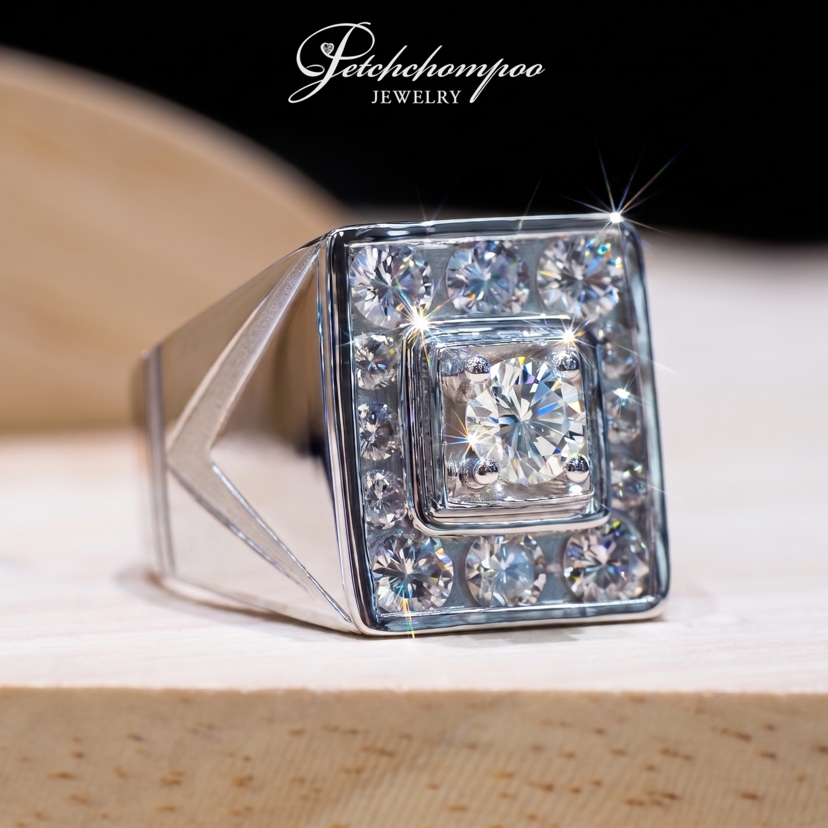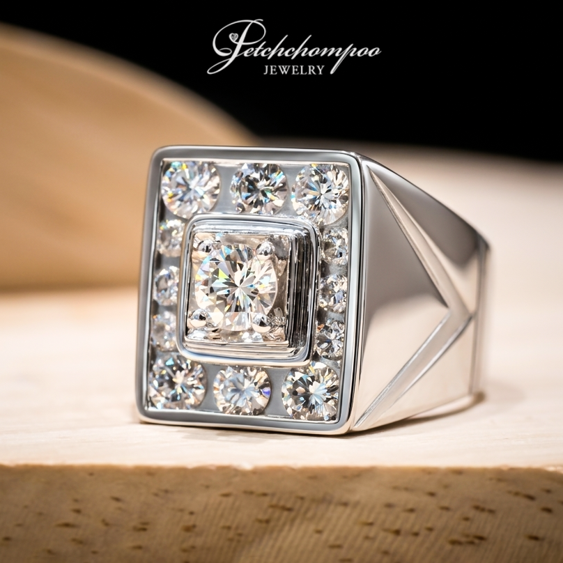 แหวนดีไซน์ Square Signet Style ที่โดดเด่นด้วยโครงสร้างทรงเหลี่ยมแข็งแรง ให้ภาพลักษณ์ของความมั่นคงและความสำเร็จ ศูนย์กลางคือเพชรเม็ดหลักที่ถูกล้อมด้วยกรอบเพชรสองชั้น เรียงอย่างสมมาตร สร้างมิติแบบ Geometric Luxury ที่ทั้งคมชัดและทรงพลัง ตัวเรือนหนาแน่นและมีน้ำหนัก สื่อถึงความ Premium และความเป็นเครื่องประดับระดับ Statement สำหรับผู้ที่ต้องการความโดดเด่นอย่างมีระดับ