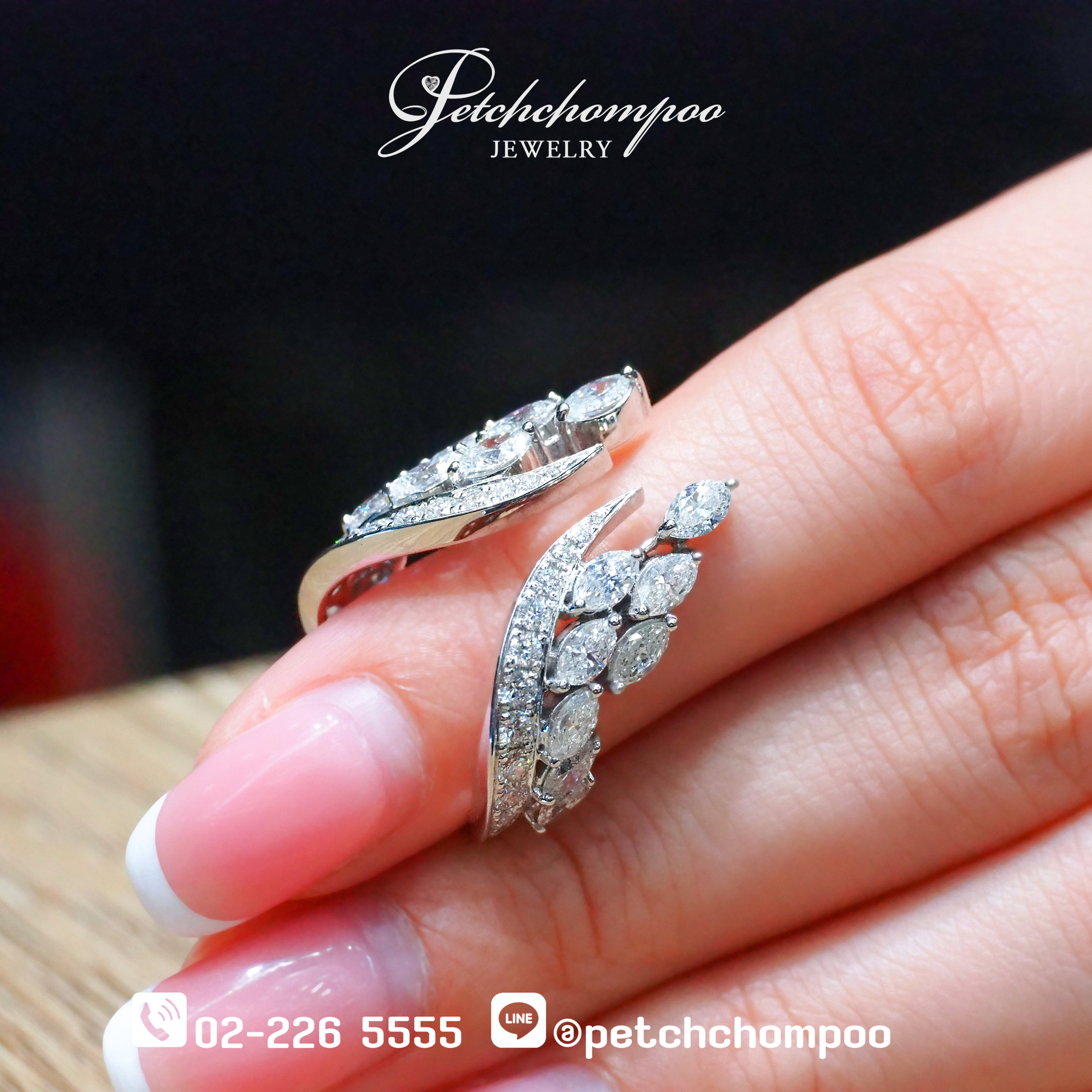 แหวนหน้ากว้างดีไซน์งดงามราวกับปีกนกโบยบิน ประดับด้วยเพชรทรงมาคีร์ (Marquise Cut) 16 เม็ด วางเรียงตัวอย่างปราณีตในแนวเฉียง ไล่ระดับอย่างมีมิติ ผสานกับเพชรกลมเม็ดเล็กเล่นแสงระยิบระยับทั่วทั้งวง ตัวเรือนทองคำขาว 18K น้ำหนักแน่น ให้สัมผัสหรูหราและสง่างามในทุกมุมมอง เหมาะกับทั้งชุดราตรีและวันพิเศษ